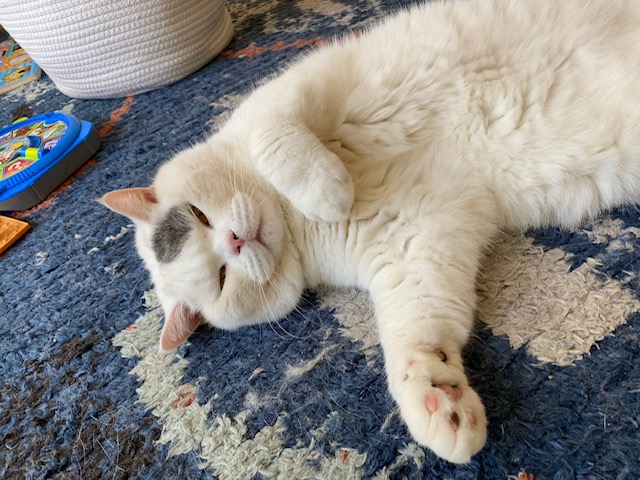 Winterfell (aka Klaus) is a large white cat with a blue (grey) tail and blue spot over his left eye. He has distinctive amber eyes