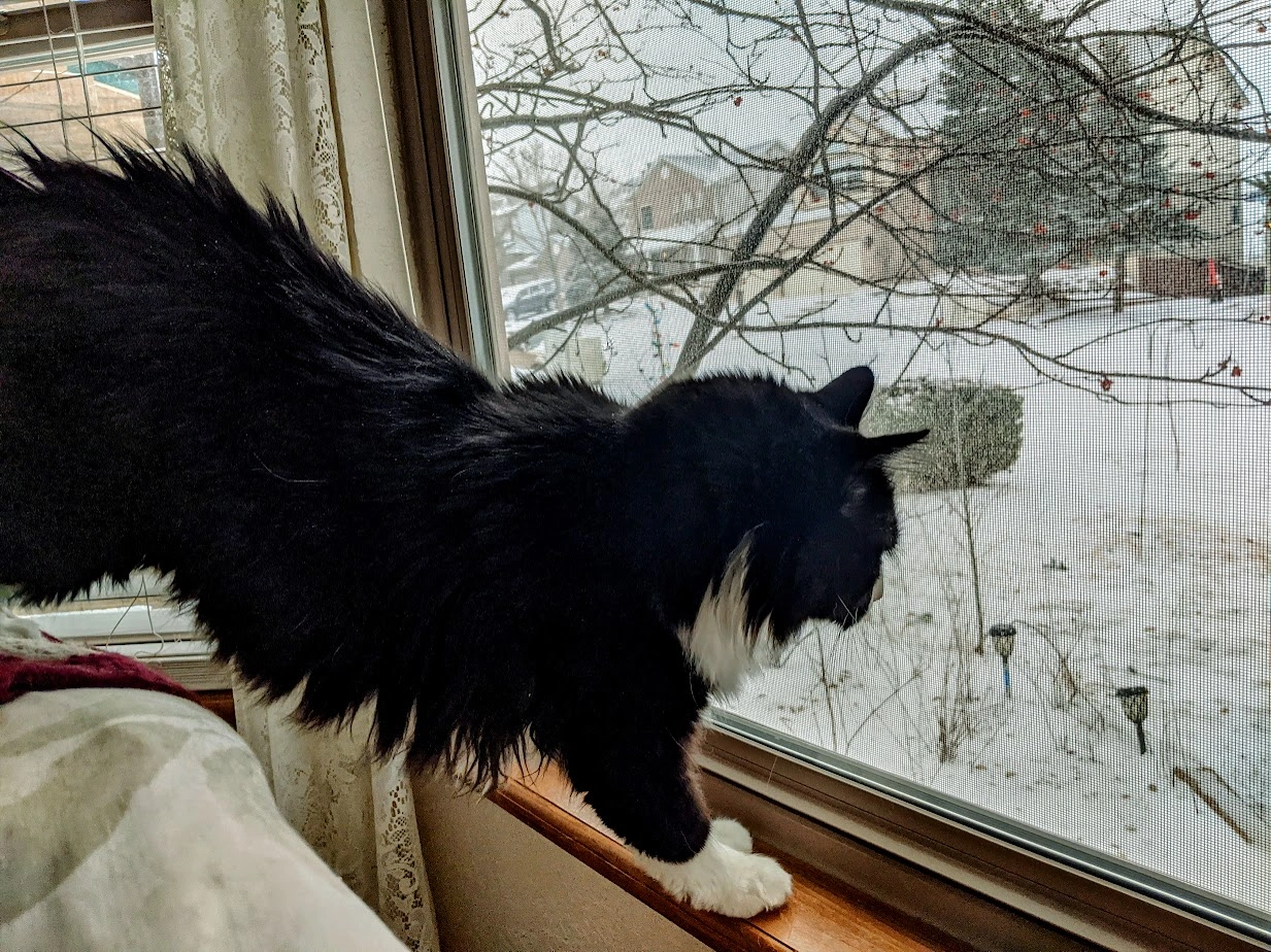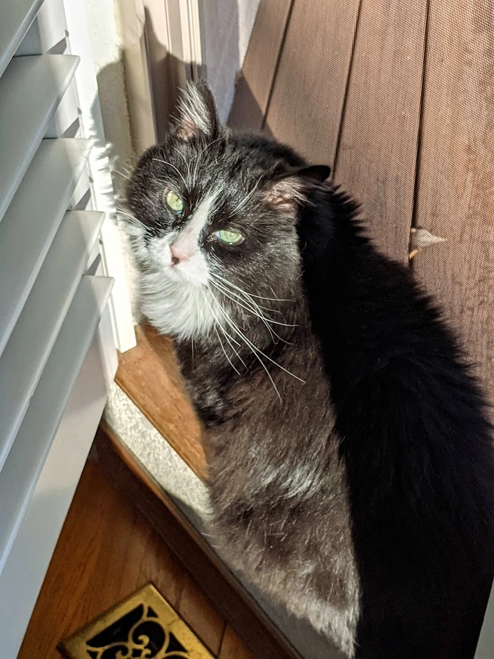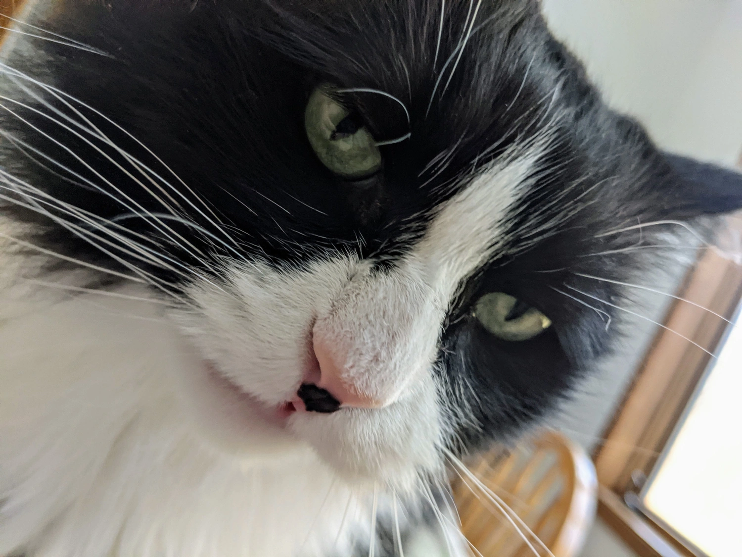 Friendly black & white tuxedo male, but face appears serious. White socks on paws. White blaze on nose & whisker pads. His back has a few individual white hairs. Chest & stomach are white. Has a belt of black fur across stomach. Pink nose with black patch in center. Muscular build & large paws. Strong & powerful. Had a tooth extracted. Very long white whiskers. Cannot raise his tail fully & folds tail in half when resting. Likes kibble. Loves Fancy Feast canned food. Does not like to be picked up & carried. Indoor vaccinated.