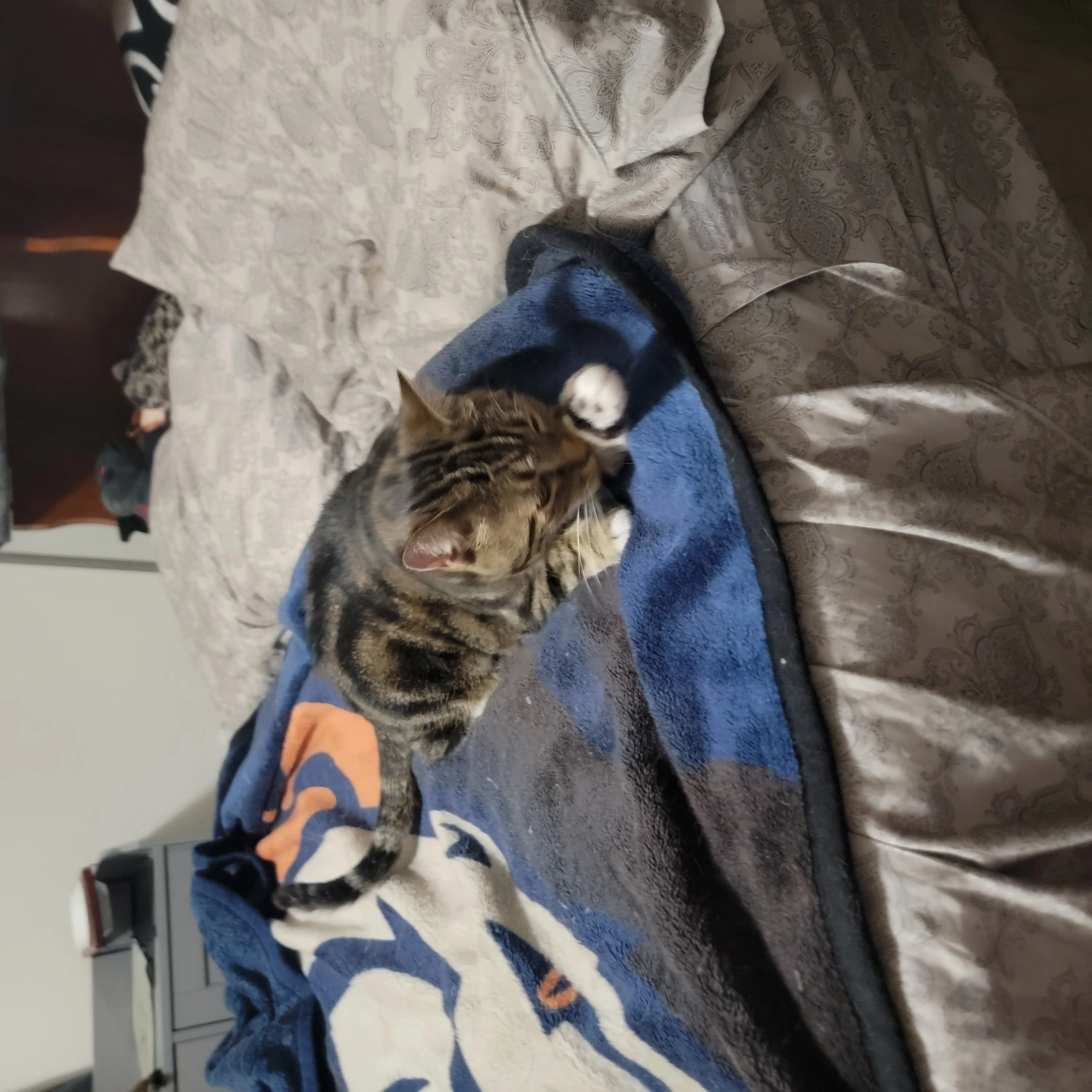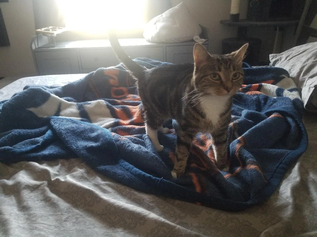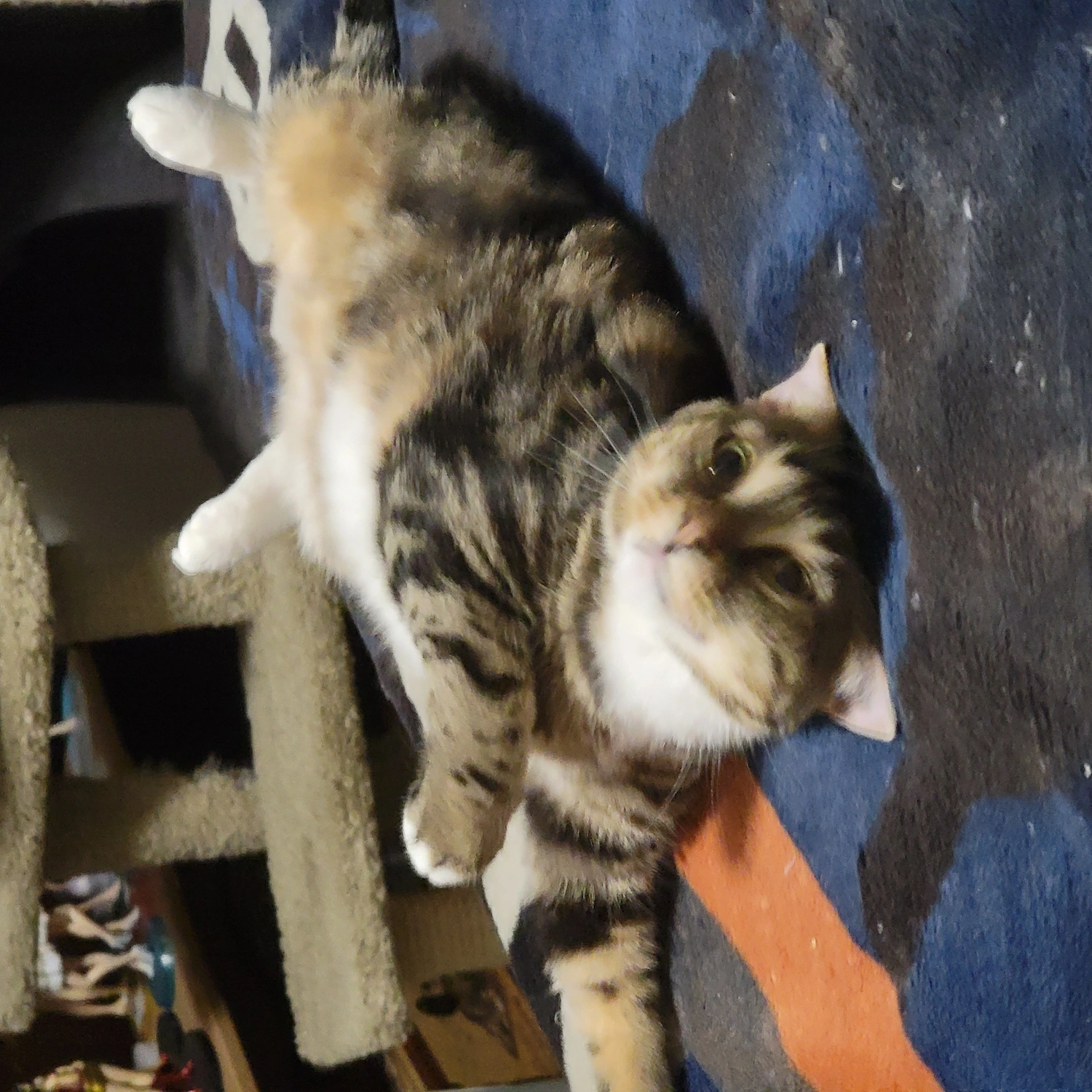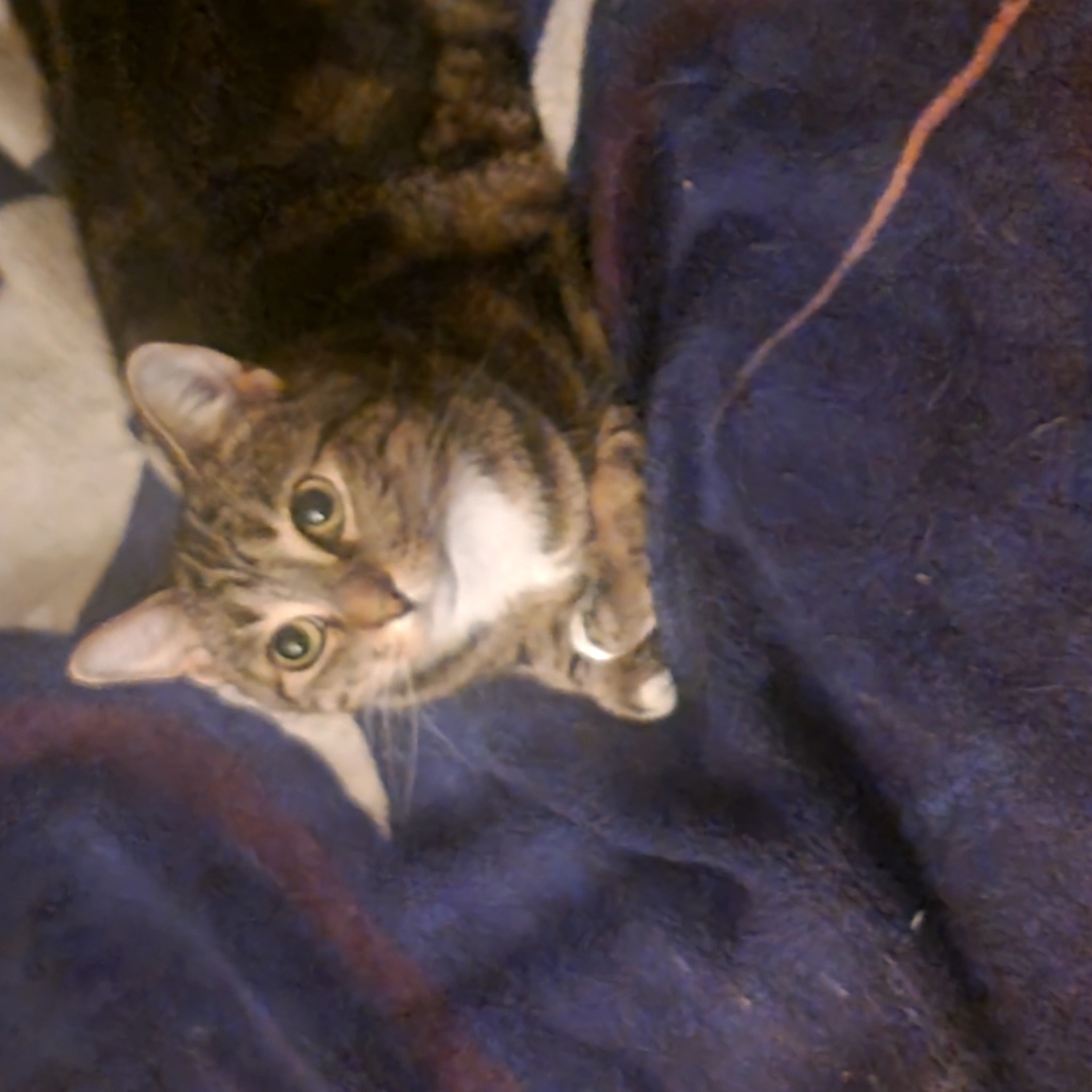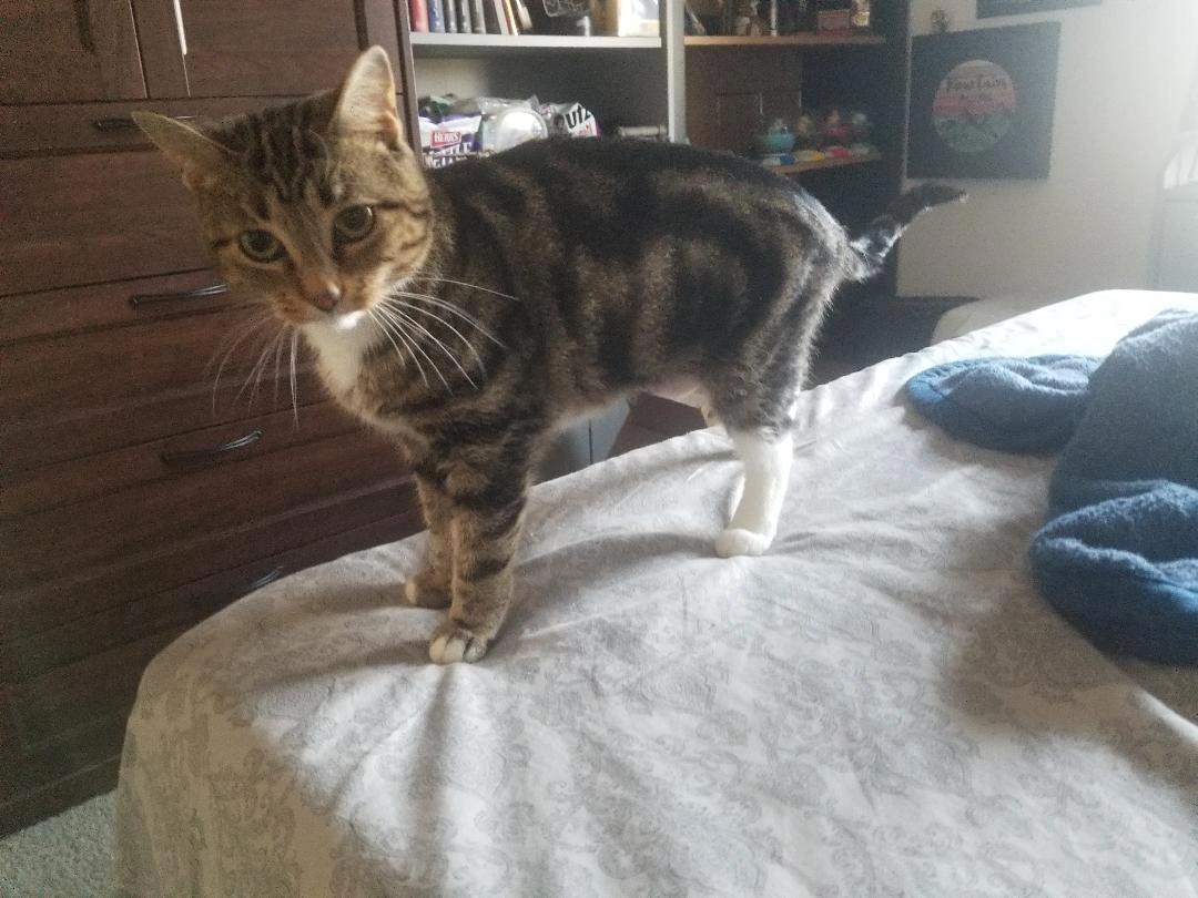 Tabby marble color pattern with white paws and chin/breast plate. Scared of people she doesn't know, but once warmed up to you, is extremely friendly.