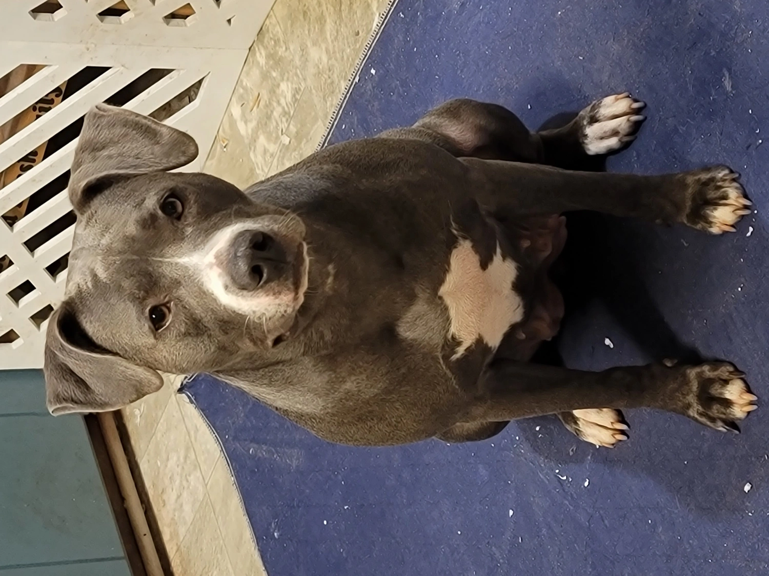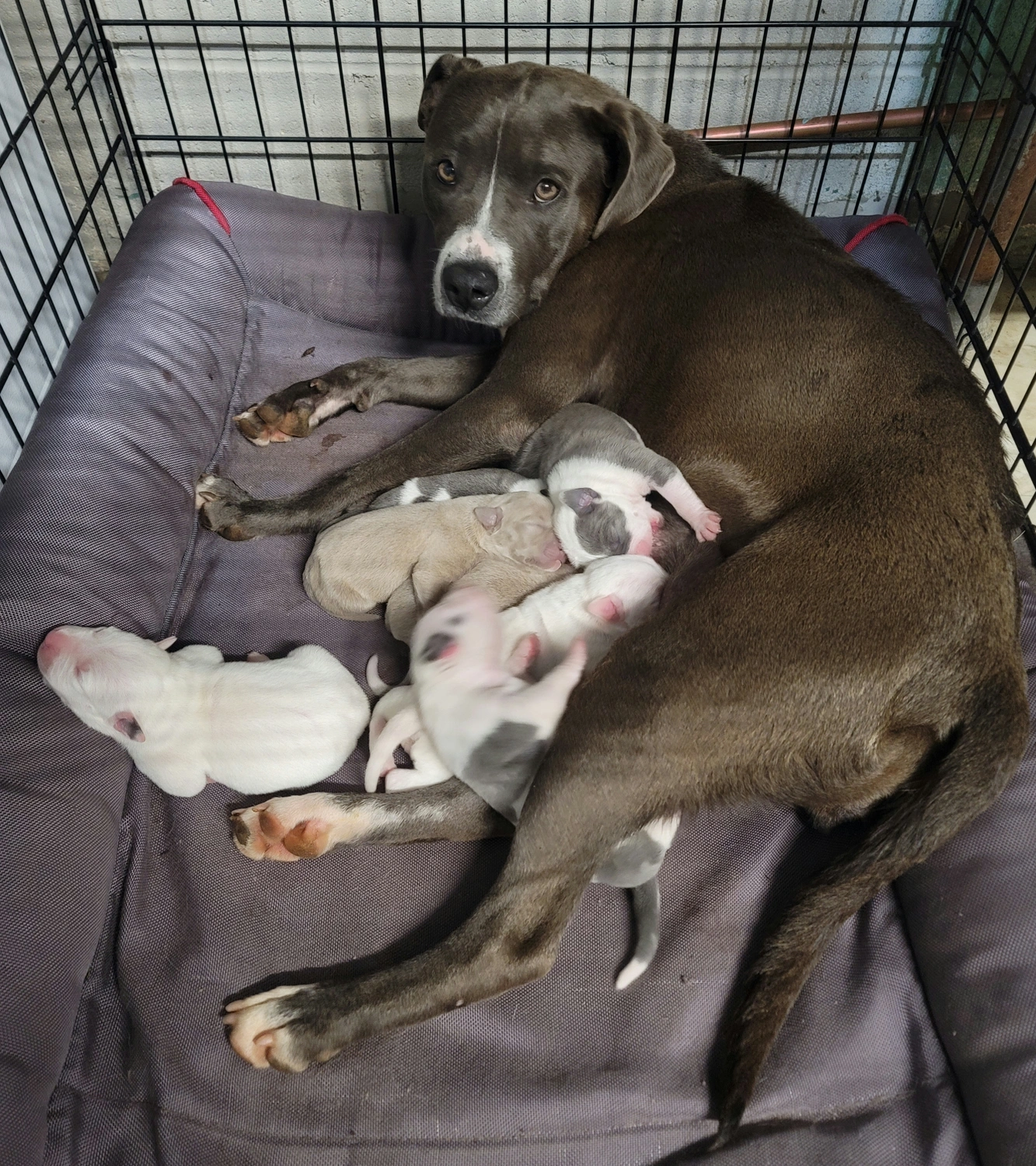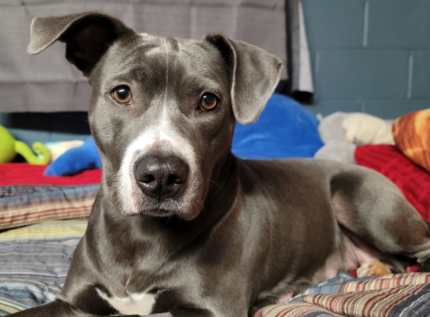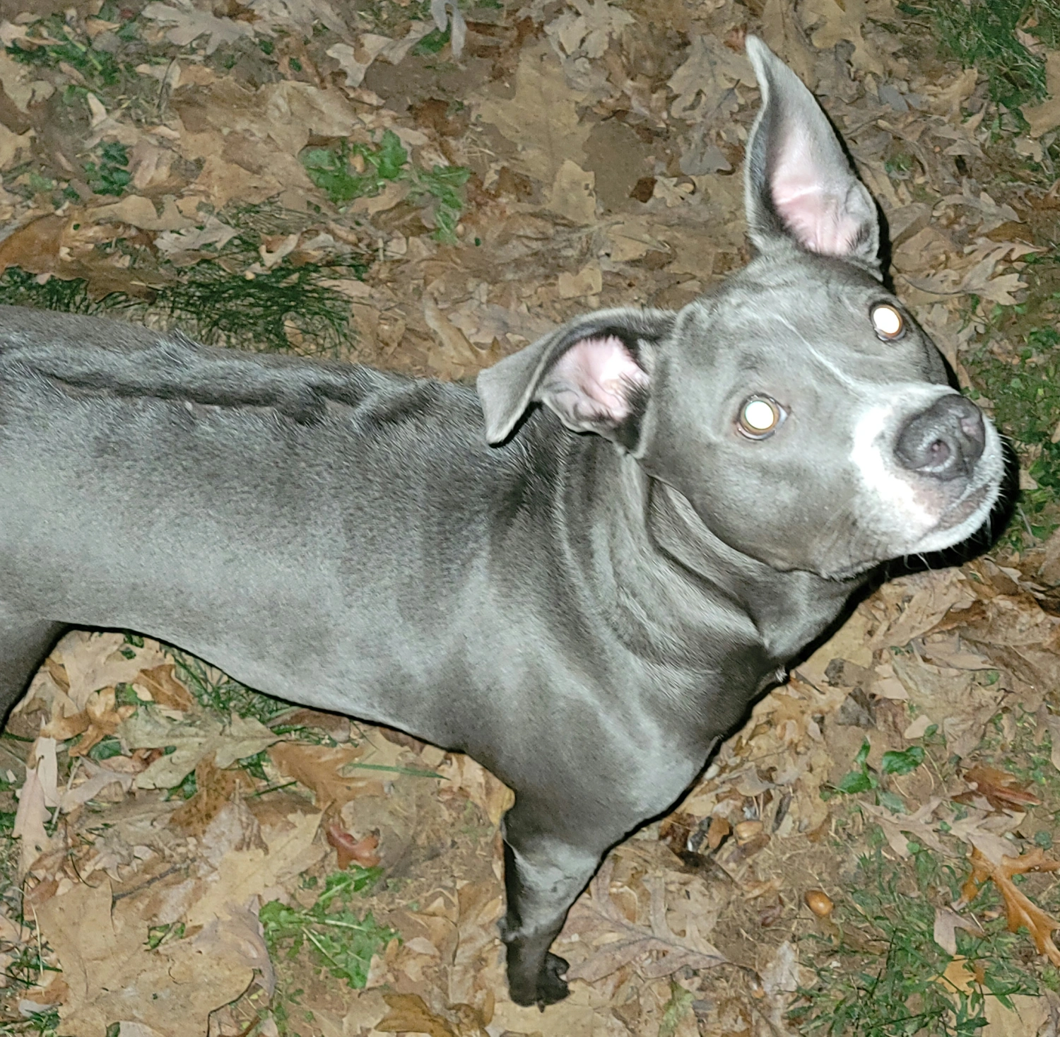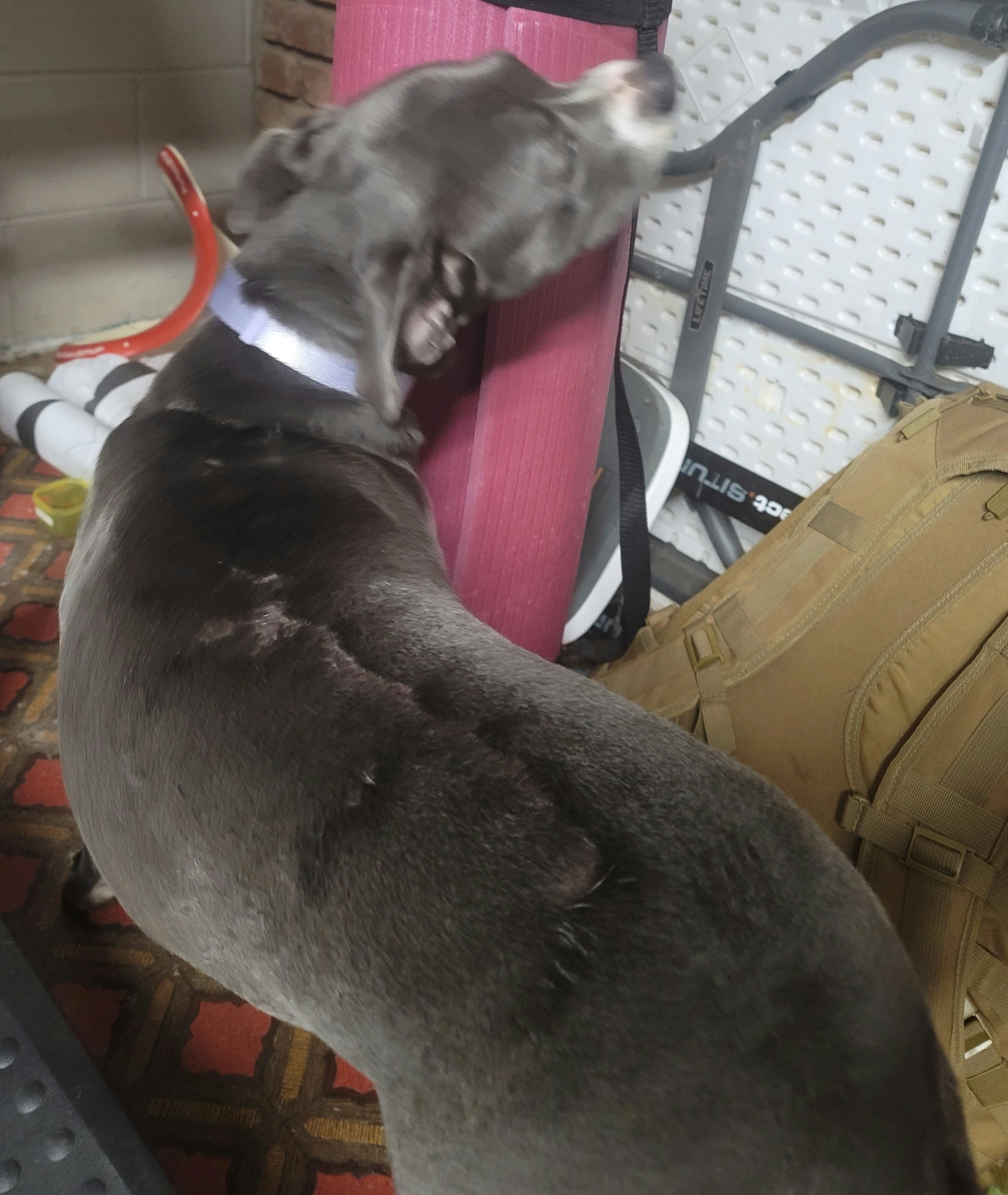foster dog with scarring down her topline/back from going under fences. very excitable, jumps and tends to go belly up submissive. NOT CAT FRIENDLY. very high prey drive for cats but good with dogs. untested with small dogs that aren't puppies ( came to us pregnant)