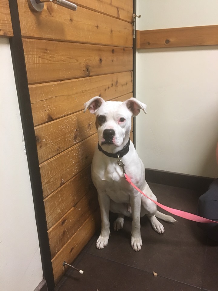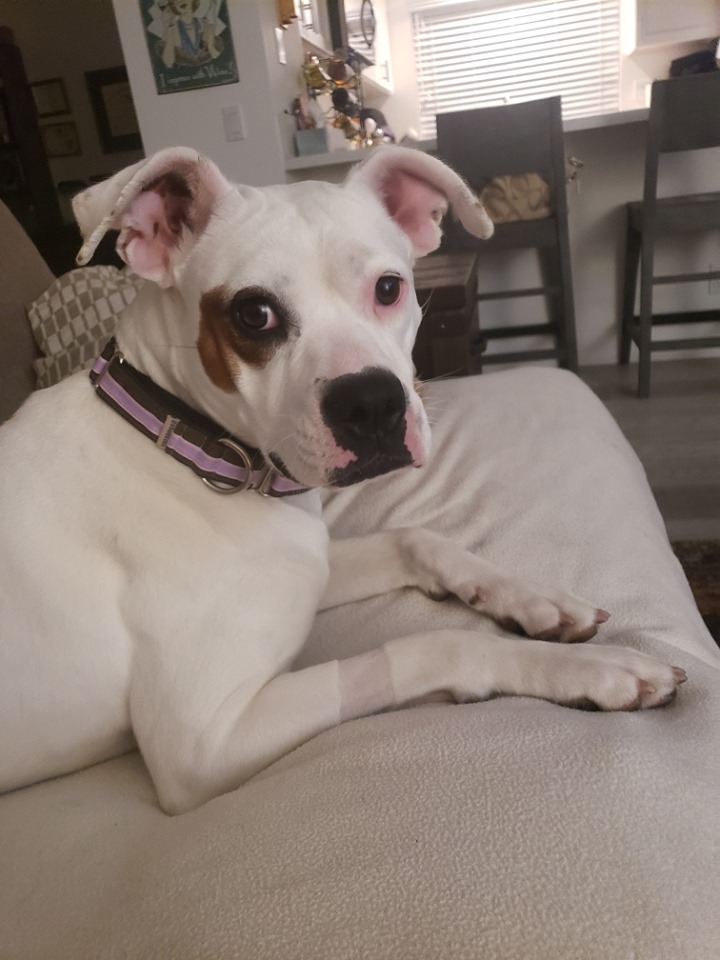 Dina is a one year old Boxer Shepherd mix who came to us because her owner was moving to an apartment that did not allow dogs. She is a shy girl. however as we see her come out of her shell we see a lovely personality. Ideally, Dina would love to be in a home with at least one other dog. She loves her walks and gets very excited to see bunnies, birds and other doggie friends! She and her foster bro Mac are having a blast playing. She is respectful of her older foster siblings who are not interested in her puppy play. She is super gentle when taking treats from you and is respectful of the other dogs treats and food. Dina is not only spunky and fun, but she's smart too! She knows come, sit and down. Dina sleeps through the night and likes to snuggle in with her foster siblings. She has met the cat (who is not a fan), but she is respectful of his space and listens when directed to give him leave him be. She is apprehensive of meeting new people and will bark; however, we have been practicing the no touch, no talk, no eye contact method with all the people Dina meets. As long as she is offered the opportunity to sniff the new person before they try to touch her it seems to be ok in Dina's book. If you would like to meet Dina, please complete an application so that one of our volunteers can contact you! http://www.rrboxerrescue.org/adoption-application.html