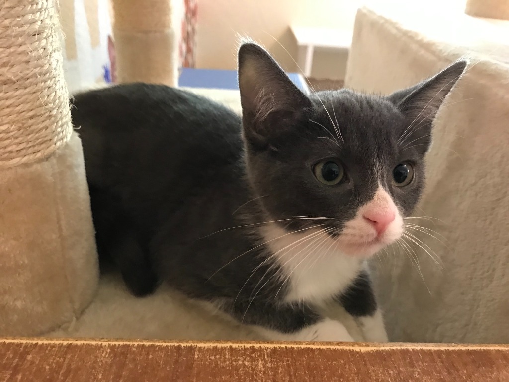 This little one was named Tui, but her foster mom said she only responded to Heather. So call her what you like, she is a kitten from one of the most hilarious litters ever to come to HART. Playtime involves wrestling and chasing siblings, running after toys, climbing up human legs (sometimes all the way onto the shoulders), and scampering on the exercise wheel. Laptime is great, too, with lots of purring. All kittens from this litter are crazy about people and will make excellent pets for your family. Why not take two or three together and let the fun begin?