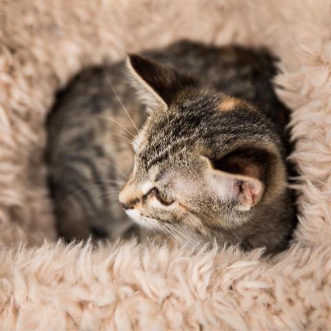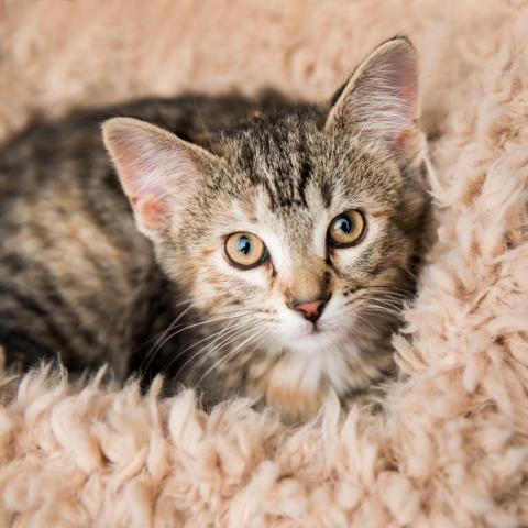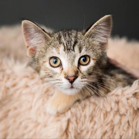 Hello, my name is Tiny. I'm a really sweet kitten that has come so far since my littermates and I were brought to The Bitty Kitty Brigade. I tend to be the cautious one out of my littermates. It takes me a little while to warm up to you, but once I do, I'll melt into your arms and purr away. I like to play with wand toys and toy mice that I can toss in the air and chase. I love climbing the cat tree/towers that my foster family has in their home, so I would love it if you had one in your home for me. I like to sit up high and watch the action below. I get along great with my foster family's resident cats (even the grouchy older cat), but I am still getting used to their Golden Retriever dog. Loud noises like the vacuum scare me, so if you could talk to me while vacuuming, that helps me feel safe. When you're done, I like to be picked up and snuggled. I love to eat my Royal Canin canned kitten food for breakfast, lunch and dinner and I eat Royal Canin kitten kibble in between meals. I'm great at using my litter box! I can't wait to meet you and see if we'll be a good fit for each other! Kittens need buddies! We require that kittens be adopted in pairs, or go to a home that already has another young companion animal. If you already have a young animal or another kitten in your home, great! If not, Tiny will need to be adopted with another kitten. The adoption fee for a kitten is $225. If you adopt a pair of kittens from The Bitty Kitty Brigade, the adoption fee is $400.