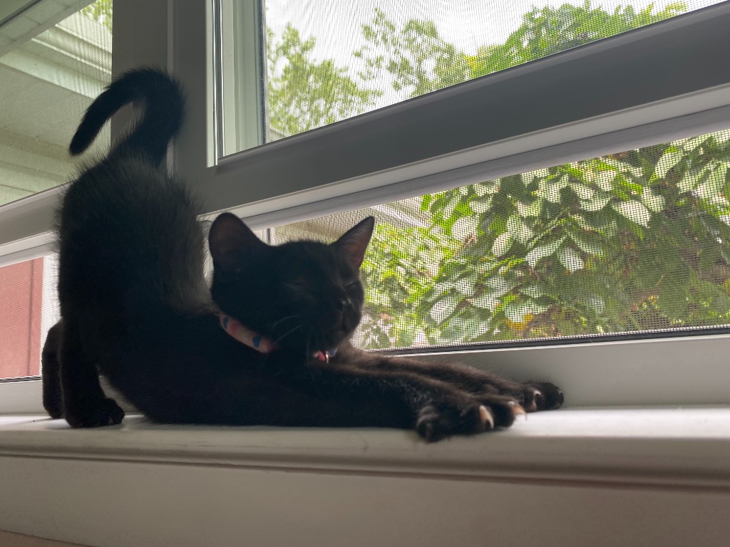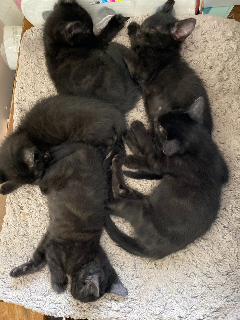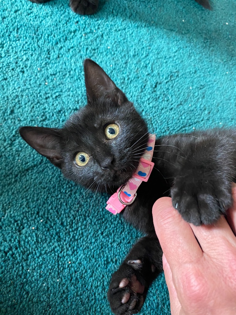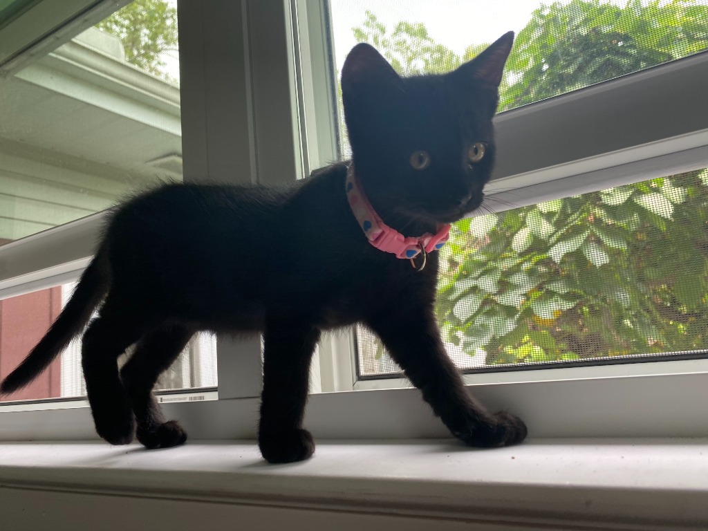 Trinity is part of the “Matrix crew” born to a feral mom, her whole family of four brothers, and Mom were taken in when she was just a week old. Trinity is a beautiful jet black and charcoal black DSH. When you look closely you’ll see her coat is swirls of both colors. She has stunning light gray/green eyes and uses those gorgeous eyes to win you over. Trinity can keep up with her four brothers when she’s chooses, but is just as happy sitting on your lap for some loving. Trinity purrs the moment she’s picked up and loves to sit next to you and be petted. Trinity is waiting patiently for her forever home and hoping that maybe you’ll bring one of her brothers along too!Apply for this kitty: https://rescuekitty.org/adoption/adoption-application/