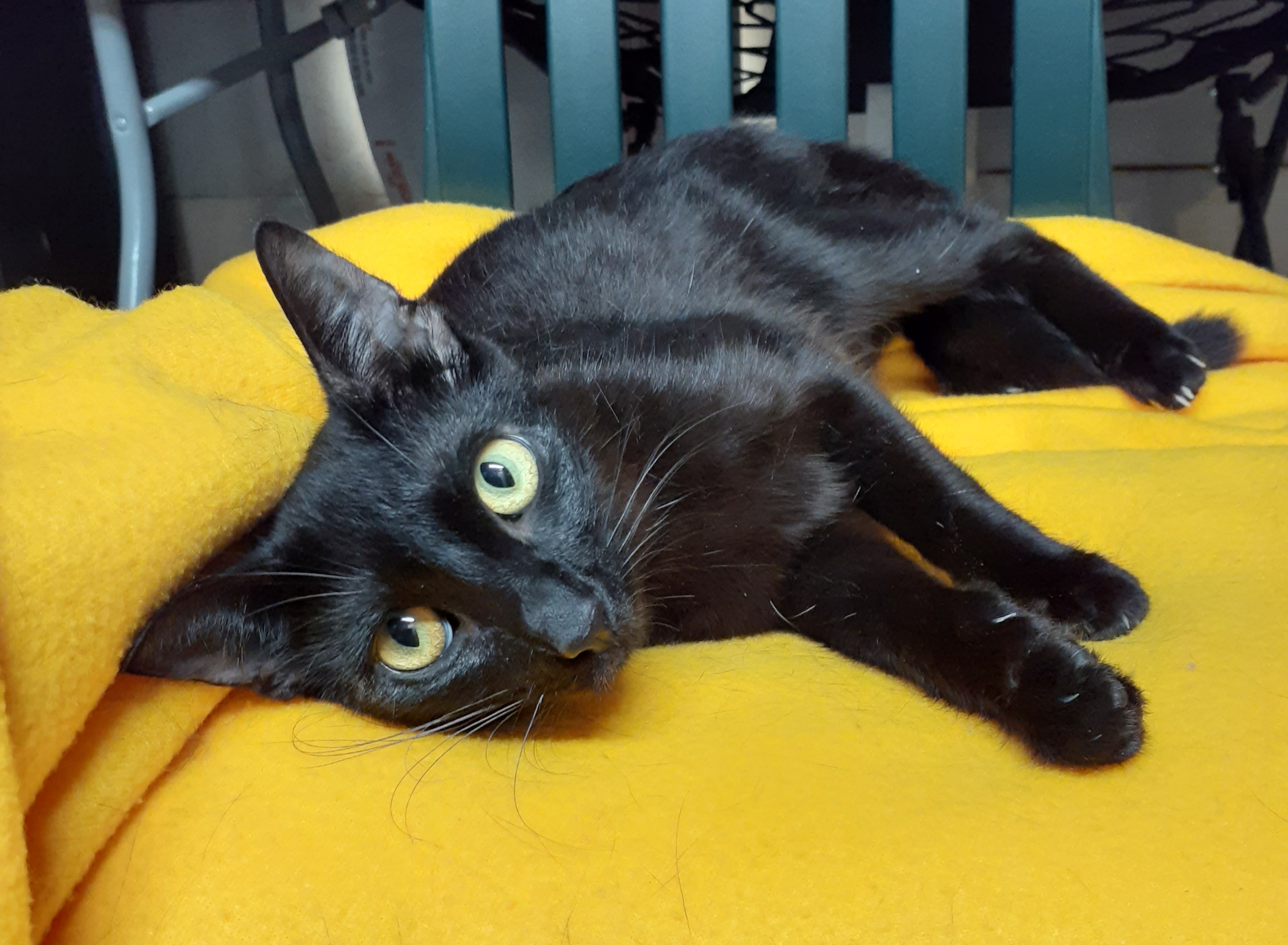 This black beauty is sleek, athletic and playful. She enjoys interactive playtime with her foster people just as much as she enjoys romping and playing hide and seek with her kittens, Lindy and Leif. Lilith is curious and active and there to help with whatever activity you may be working on. She is an affectionate companion and seeks you out to be petted and to be held. She is a dear, sweet soul. She chirps to say hello or in delight when you pull out her interactive toys. A sweetheart of a cat. We believe she is confident and outgoing enough to do well in an active household with kids and/or a cat-friendly dog and we know she enjoys playtime with another cat, too. Because she is young and active, we believe she do will best in a home with another pet to interact and play with - if she is lucky, maybe even with one of her kittens. We estimate that Lilith was born around August 2020. Bio #3876MB-Li. If you're interested in adopting this or another of our cats, please fill out our adoption questionnaire at http://icraeastbay.org/adopt/how-to/.