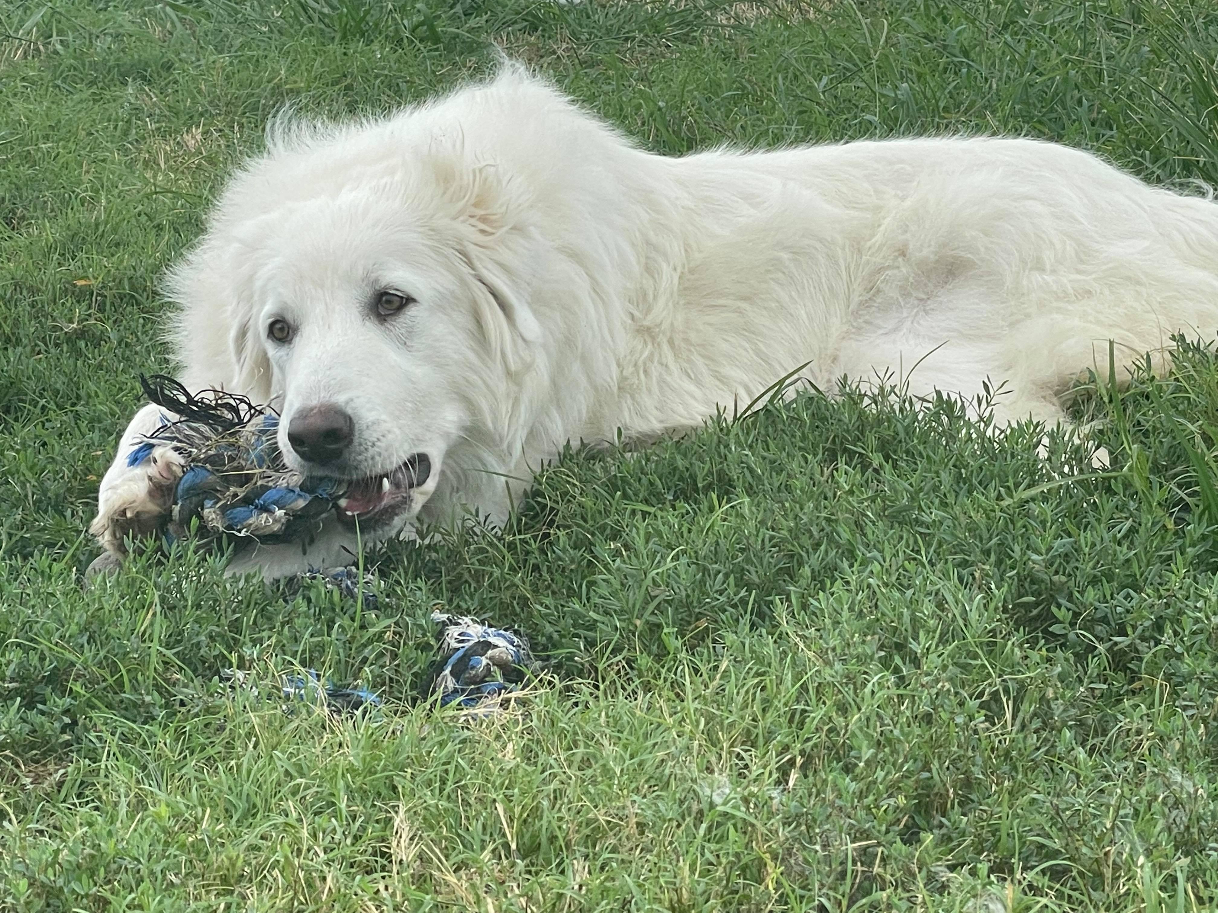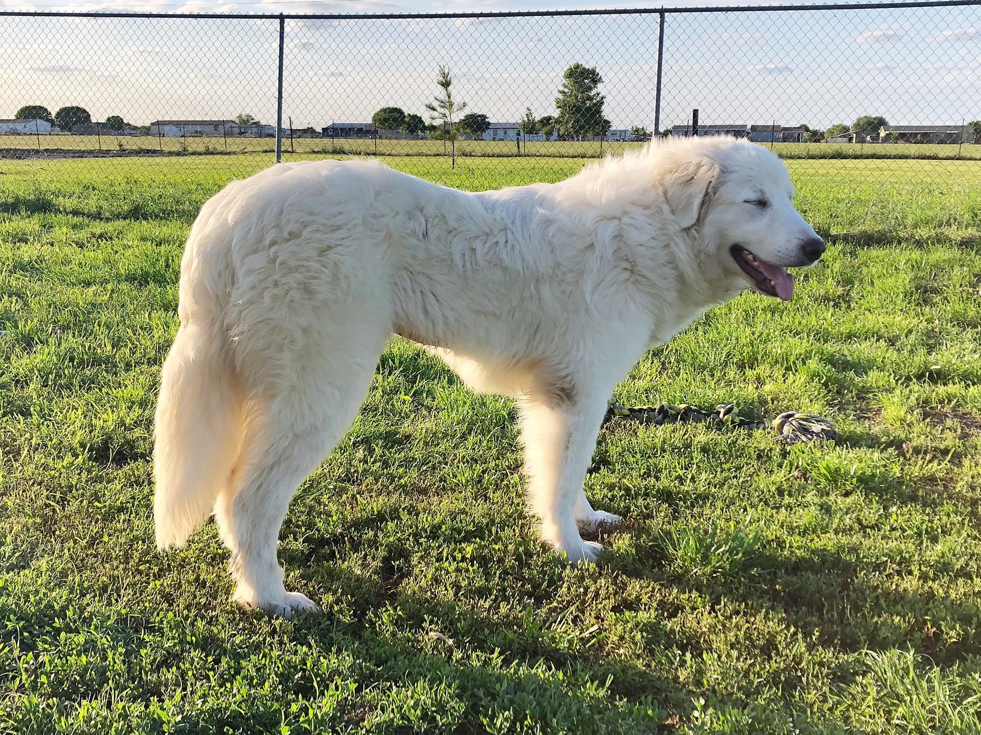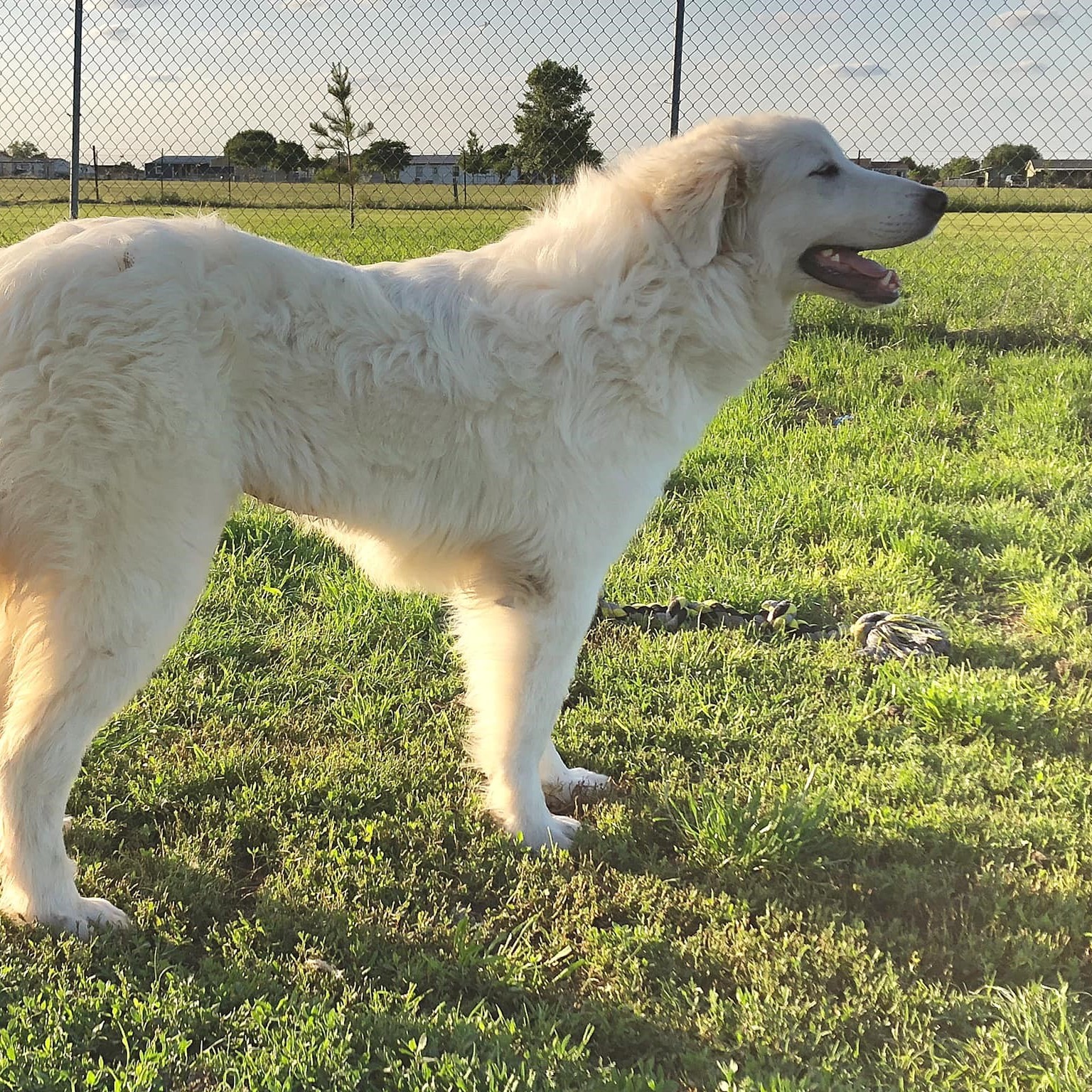 OUR REQUIREMENTS FOR PUPPY ADOPTION: 1) PUPPIES WILL ONLY BE PLACED IN HOMES WITH YOUTHFUL, PLAYFUL, DOGS. This helps integrate the dog into your household easier by giving the pup a mentor. 2) In addition to the youthful playful dog, someone MUST also be home at least part of the day. Please do not apply for a puppy if you are gone 8-10 hours a day. It is not a good situation for you or the puppy. 3) You must have plans in place to socialize your puppy properly. 4) Our puppies are not livestock dogs. They must be family pets that are allowed inside the home. Please watch this short video which demonstrates how puppies learn polite behavior from their adult dog mentors. https://youtu.be/R6N8STRl2aI Meet Jadzia! She is a puddle puppy! She loves to jump around in puddles after it rains, and look how beautifully she cleans up! She's gorgeous! Named after Jadzia Dax from Star Trek Deep Space 9, our pup was already a whopping 75 pounds at 7-8 months old! Born around October 2020, her adult weight will likely be around 100 pounds. She's a big girl! Jadzia is a little shy and reserved when meeting new people, and is working on building her confidence. After she knows you, she is very loving and submissive. She has had limited exposure to children during foster care, but we have seen her be great with kids. Found as a stray, she was lured into rescue with cookies and the presence of a toddler. Jadzia loves playing with her furry foster siblings, and gets along with dogs of all sizes. She is very friendly and excited with them. She is submissive and will lick them in the mouth, sometimes too much. She can be a little too curious and nosy with small dogs. She must have a large, playful doggy companion in her forever home. If you don’t already have one of those, adopt a buddy for her from us! She is nice to cats and gets a little nervous of the more outgoing ones. Jadzia has a silly side. When playing with other dogs, she likes to get the zoomies, running around the yard at lightning speed! She loves toys and can never have enough of them! She is happy to run around with them in her mouth or share them with her friends. Baby Jadzia is house trained, crate trained, and leash trained. She isn’t much of a barker. She rides quietly in a car. Sweet Jadzia is going to be a great addition to someone's family. SPIN Pyrs are all in foster homes in the Dallas/Fort Worth area. Potential adopters are asked to make travel arrangements if they live elsewhere. All SPIN dogs are spayed or neutered, current on vaccinations and on heartworm prevention. Please go to our website www.SpinRescue.org and fill out an application for this great Great Pyrenees!