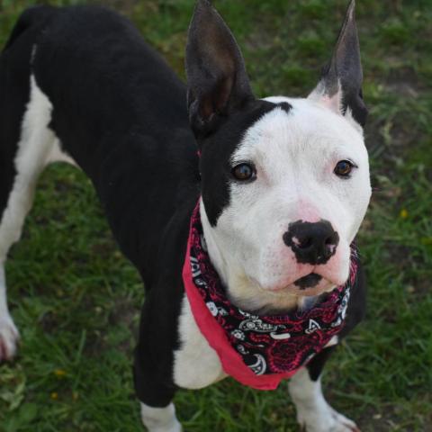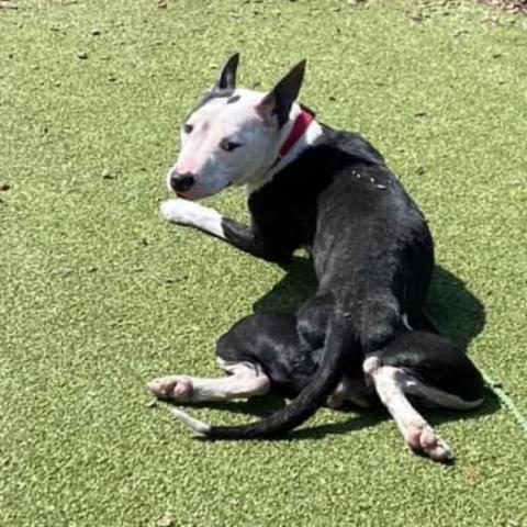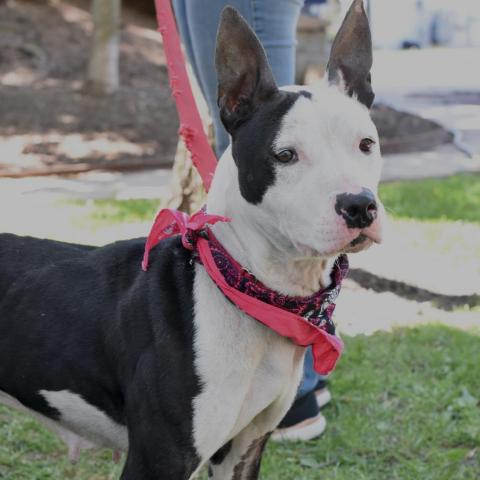 Reina is a little shy and skittish, but is coming out of her shell more every day. She likes to lead the way on walks, but that's mostly because she's eager to get back to her kennel. Once settled in a home where she feels safe and comfortable, she'll probably be much calmer on walks. Reina enjoys getting pets and will happily join you on the bench and even give you a couple gentle kisses. She's making dog friends in play group and prefers the company of gentler dogs like herself. This sweet girl is ready for a home to call her own. Reina is not a fan of cats so she would need to go to a cat free home