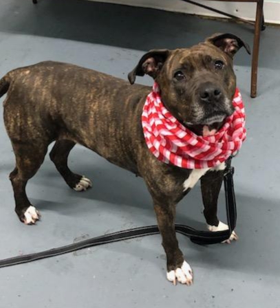 This sweet brindle girl was dumped at our boarding facility on Christmas Eve, thus earning her name. She was terrified and confused and had no reason to trust humans. Fast forward to the present day and Eve is a completely different dog. She loves everyone she meets, does fantastic in the car and is great on a leash. Eve is great with other dogs but she is still learning manners and how to play. Eve is about 2 years old and 50 lbs making her the perfect size for most households and easily manageable. She loves to cuddle and is very gentle. Eve does excellent with children and she doesn't seem to mind cats but her being able to live with one is still unknown. She is currently in our boarding facility and looking for a foster or forever home.