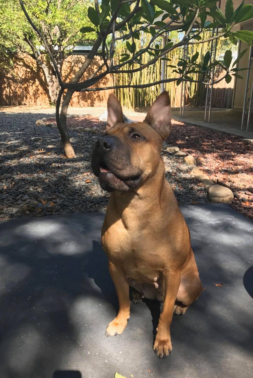 Coco is a short stocky Shar Pei mix. Six years old, 48 lbs, spay, up to date with shots, potty and crate trained. Coco MUST have a fenced back yard. Coco is wonderful with all adults and children. She's fine with easy going calm dogs. Dogs that are easily excitable and aggressively bark at her or others frighten Coco. Coco will cuddle with anyone if given a small spot next to you to crawl into. She's a calm, lovable girl.
