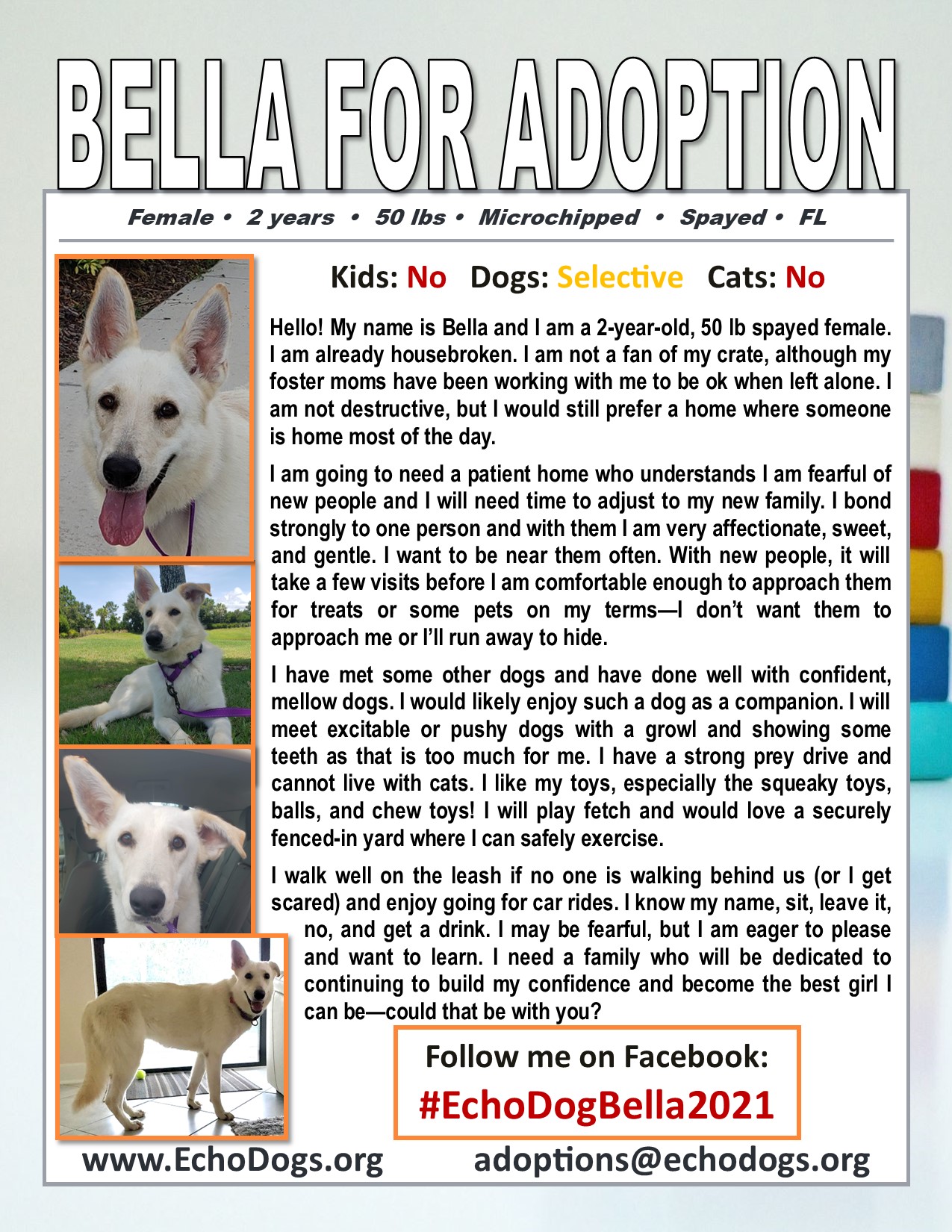 Female - 2 years - 50 lbs - Microchipped - Spayed - FLHello! My name is Bella and I am a 2-year-old, 50 lb spayed female. I am already housebroken. I am not a fan of my crate, although my foster moms have been working with me to be ok when left alone. I am not destructive, but I would still prefer a home where someone is home most of the day as I bark and howl when alone. I am going to need a patient home who understands I am fearful of new people and I will need time to adjust to my new family. I bond strongly to one person and with them I am very affectionate, sweet, and gentle. I want to be near them often. With new people, it will take a few visits before I am comfortable enough to approach them for treats or some pets on my terms—I don’t want them to approach me or I’ll run away to hide. I have met some other dogs and have done well with confident, mellow dogs. I would likely enjoy such a dog as a companion. I will meet excitable or pushy dogs with a growl and showing some teeth as that is too much for me. I have a strong prey drive and cannot live with cats. I like my toys, especially the squeaky toys, balls, and chew toys! I will play fetch and would love a securely fenced-in yard where I can safely exercise. I walk well on the leash if no one is walking behind us (or I get scared) and enjoy going for car rides. I know my name, sit, leave it, no, and get a drink. I may be fearful, but I am eager to please and want to learn. I need a family who will be dedicated to continuing to build my confidence and become the best girl I can be—could that be with you? Follow me on Facebook: #EchoDogBella2021 For more information, please contact adoptions@echodogs.org. Echo Dogs fosters dogs in many states. Visit www.echodogs.org/available-dogs to see more of our dogs. Transportation for the adopted dog IS available. Remember, we are an all-volunteer foster rescue organization - we DO NOT have a physical shelter to visit. Our minimum adoption donation is $300. All dogs are spayed/neutered, up-to-date on vaccinations and micro-chipped. Puppies under 6 months old may not be spayed/neutered. This would be the responsibility of the adopter at their own expense. Proof of spay/neuter will be required! To review our adoption procedure and submit an online application, visit: www.echodogs.org/procedure