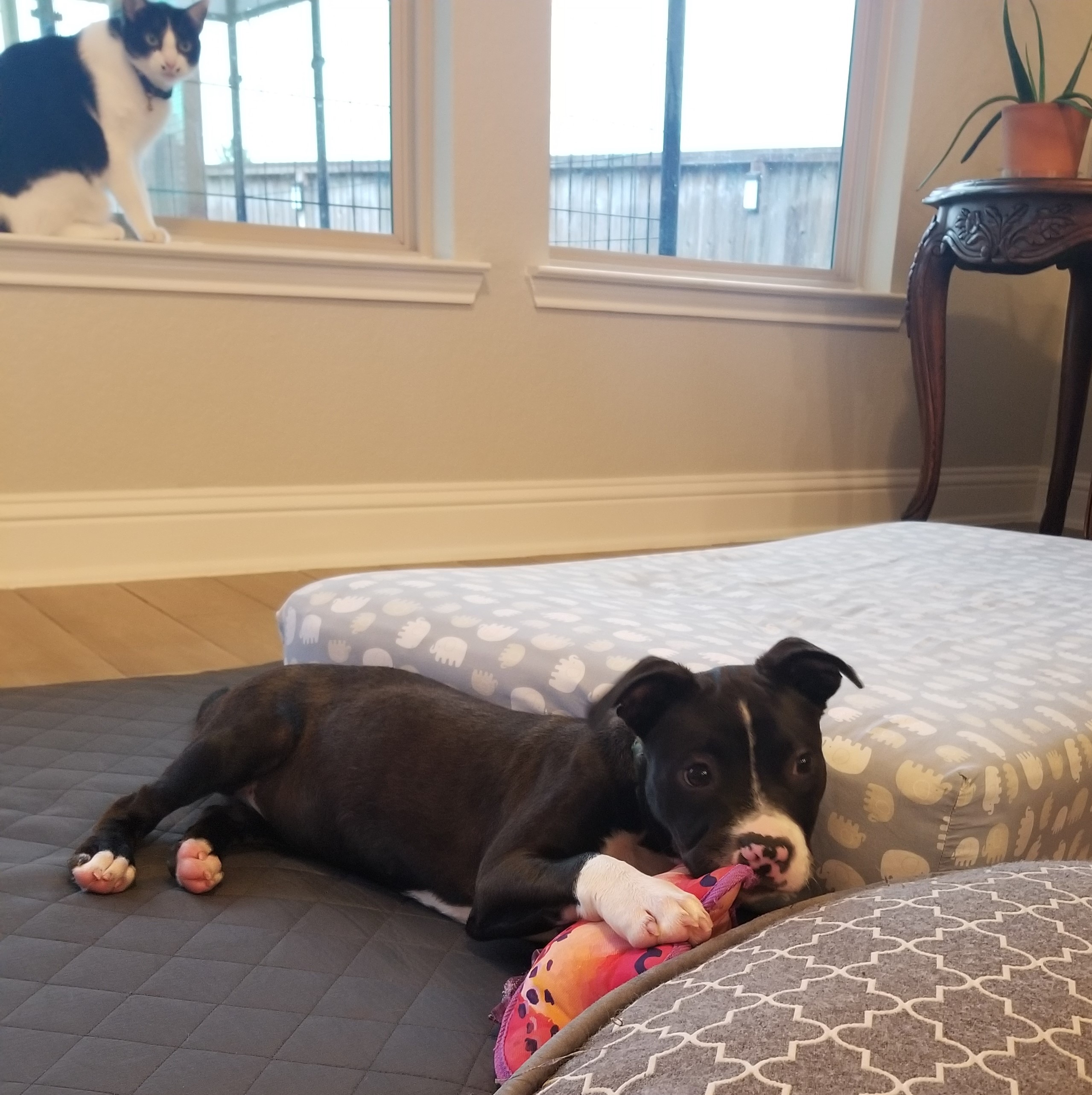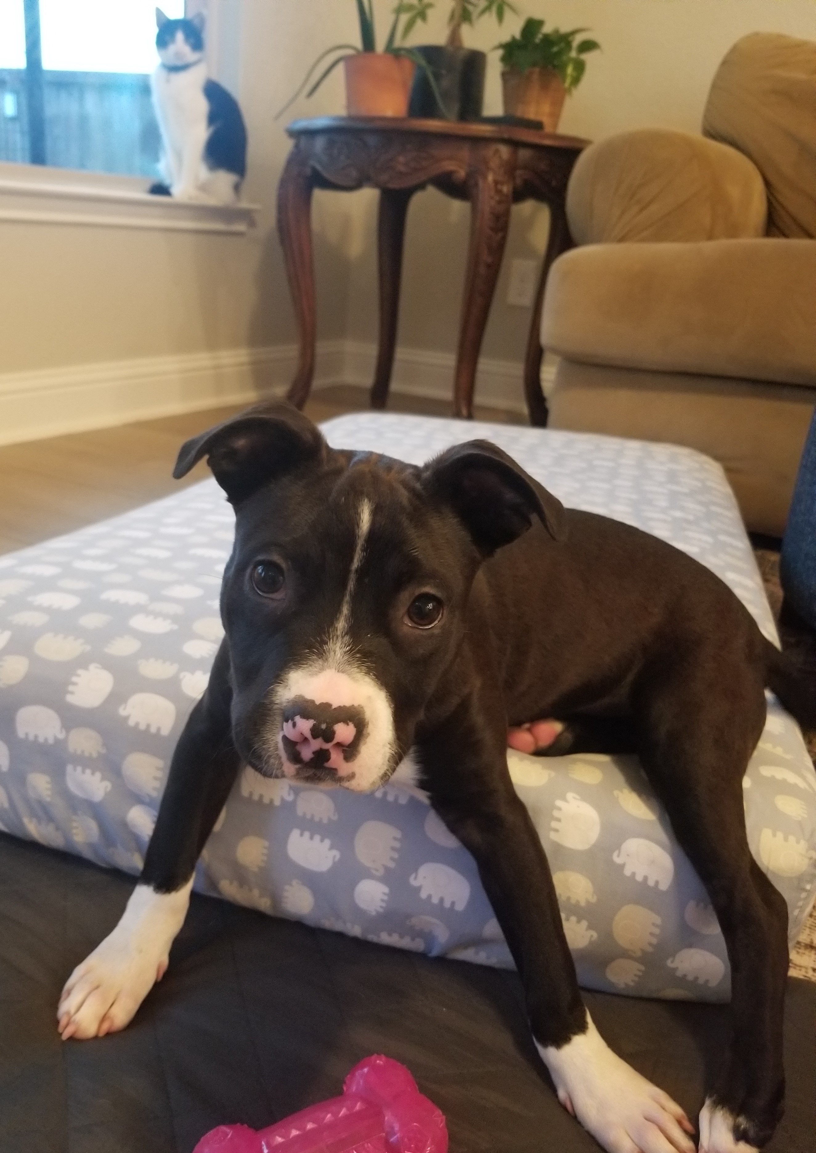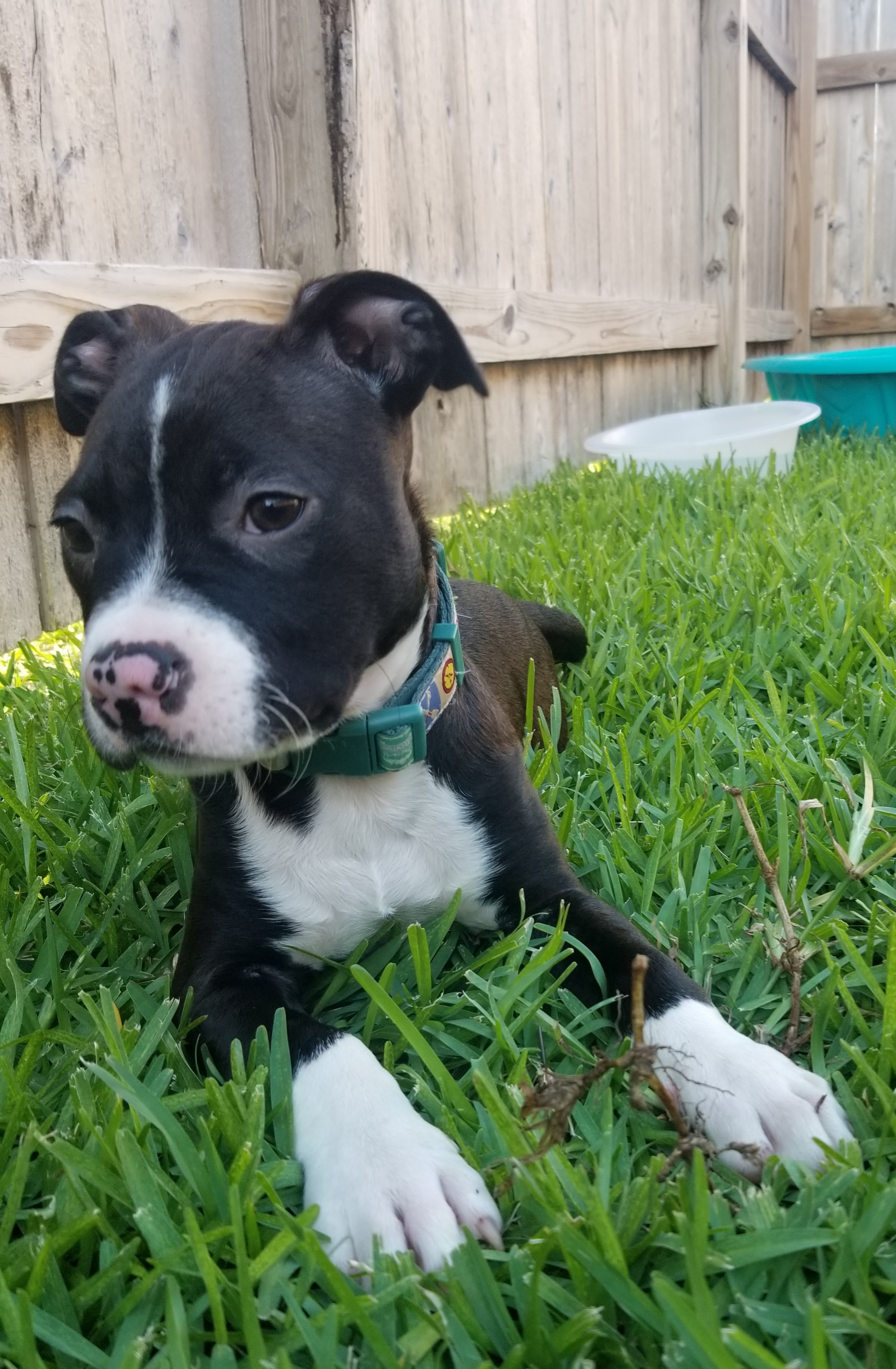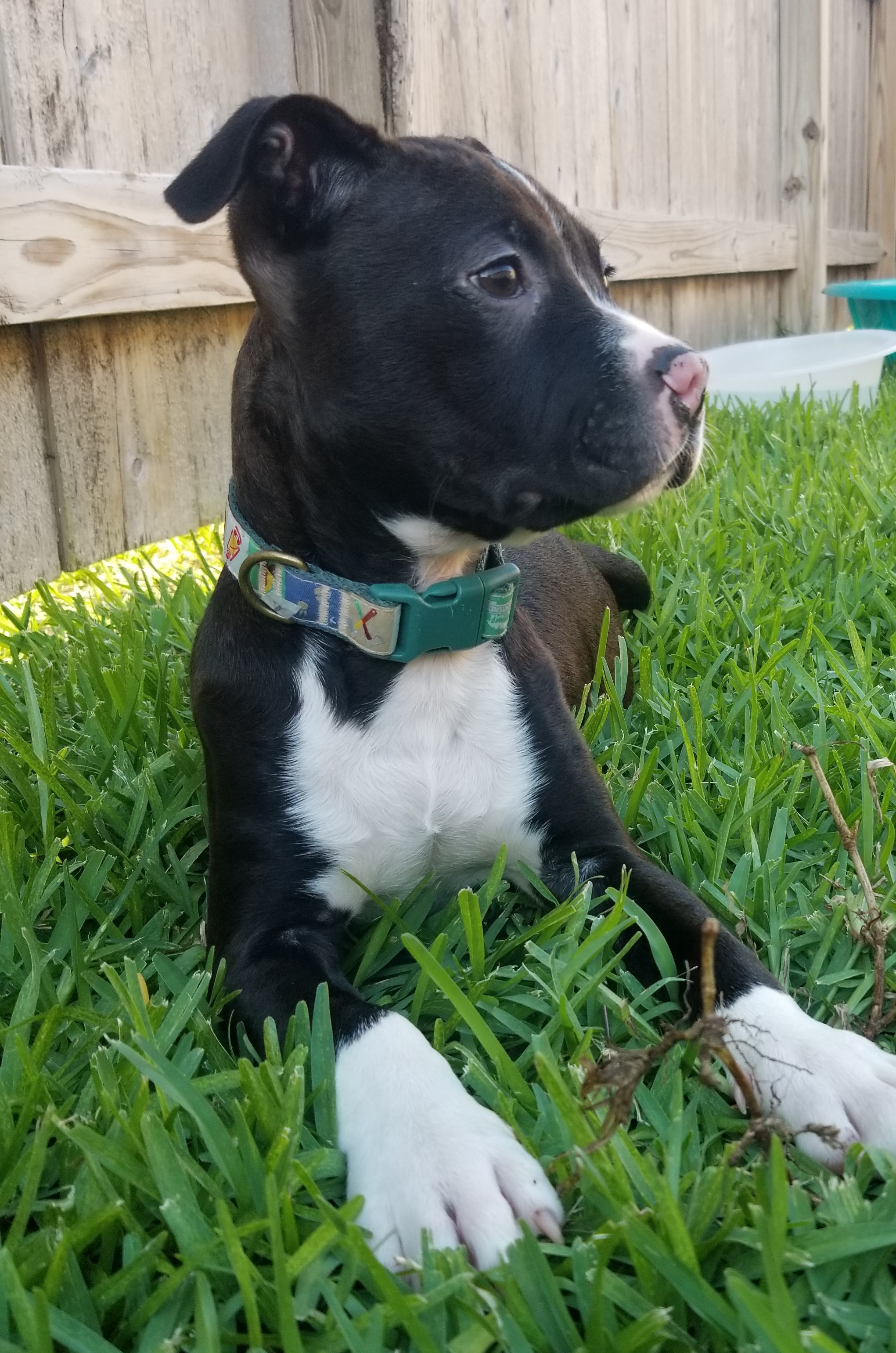Hello! My name is Pup Tart. I love, love, love to play and Im always on the go, go go! My foster Mom calls me wiggle butt because I get so excited that I wiggle my whole behind. I love to play with my fur sister and new big fur brother and anyone else thats wants to stop by and say hi! While Im on my walks in the neighborhood, everyone is my new best friend that I just havent met yet. I love to stop and say hello. I am good with kids of all ages, dogs, and I am interested in cats (they are kinda weird looking to me though). I like to explore new suroundings as long as I have someone close in case that load motorcyle drives past again! So scary! It takes me a little bit to warm up to new places (like the dog park) but once I am comfortable then its full speed ahead. My sister is the opposite, she is pretty fearless. My foster Mom is excited because I am getting good at walking on a leash. Since I am still a young pup I am learning the ropes with potty training but I know that the leash means walk for potty! I also sleep in my crate just fine. Everyone that meets me says I have a great disposition (whatever that means). I also am told that I have brindle coloring but it doesn't show up well in photos. Either way, I think I look FANTASTIC!! :) When I take a break from playing, I like to curl up in someone's lap and give cuddles, and snuggles. Did I mention that I love to play? Want to meet for a play date? ========================================================= Please contact app@aarfhouston.org for more information about this dog. You can apply online by clicking on Application . Puppies that are under 4 months old cannot be adopted outside of our Veterinary Service area. Please call for specific locations. Children under 8 years old often are not a good match for our puppies and dogs. In order to protect both, your child and our rescued dogs/puppies from harm, we seldom if ever adopt to families with young children. Once your application is approved, we will schedule a meet and greet at one of our adoption events. Thank you for considering a rescue! The adoption fee includes vaccinations, Bordetella, de-worming, rabies, spay/neuter and microchip. There is a an additional $12.99 fee for Home Again for a lifetime registration of the microchip. Puppies cannot be adopted outside of the Houston area until they are spay/neutered after they are 4 months old. It is against the law in the State of Texas for a rescue not to be sterilized so we have to make sure it gets completed and that we have record of it. NOTE: In our bios, we provide information based on our volunteer's experience with a particular dog; such as temperament, training, and ability to get along with others. AARF is a 501(c)3 Non Profit, all breed, no kill organization. Our group is always in need of donations in order to continue to give the needed medical care to our rescues. Adoption fees do not begin to cover all of the medical costs. Any donation , no matter how small is a big help and is greatly appreciated. Please help us to continue to help them. Thank you.