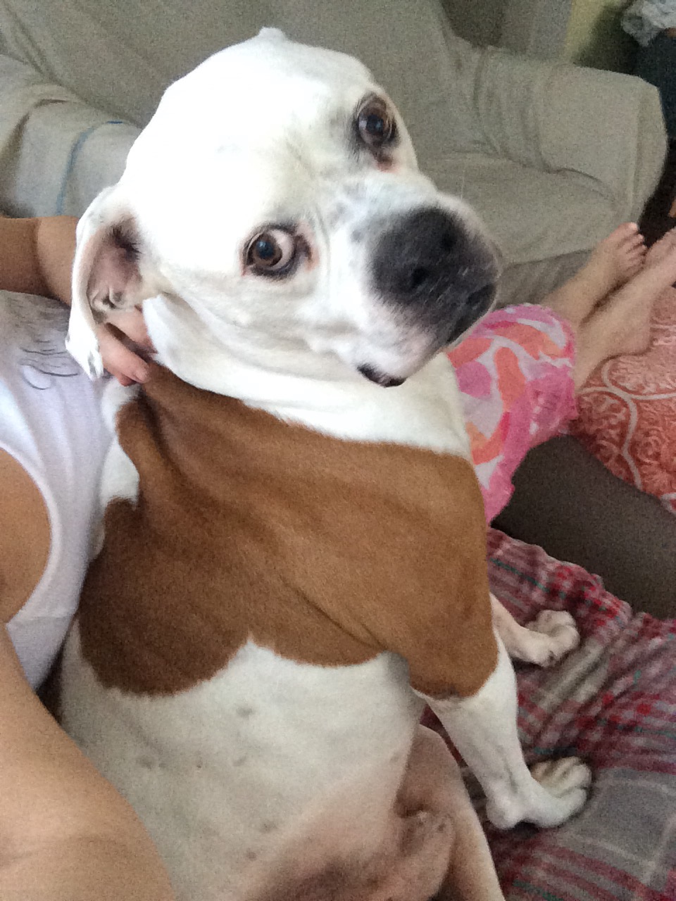 MEET MURPHY--- This handsome fella was picked up as a stray--an owner never surfaced. He was taken to see our vet where he has been bathed, fully vetted; blood tested, vaccinated, neutered and chipped. He's a Boxer American Bulldog mix (?) about 6 years old and full grown at about 65 lbs. He is living in one of our foster homes and is doing great. He is well behaved, housebroken, laid back and very gentle. He is dog-selective... likes calm, laid back dogs, not ones who get in his face. He didn’t walk well on a leash at first -- but Murphy learns quickly and is eager to please- see the video of Murphy on his 3rd attempt at walking on a leash- what a good boy!”. .. “Like many dogs, adoption events can overwhelm him, so we can arrange a private meet and greet in a more typical environment so that you can see Murphy’s true personality” We have no clue really, about cats. But he is a great dog - and he needs a great home. Adoption fee $200 Please download an application from our website: www.gratefulpaws.org NOTE: Adoption/rehoming fees are applied towards the vet bill: exam, blood tests, vaccinations, fecal, worming, spay/neuter, dental if necessary, and a microchip. There is rarely anything left over, but if that happens, the monies get applied to the next or previous pet - who may have had to have an x-ray, be groomed or have a dental.