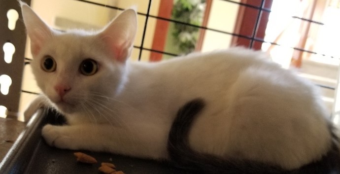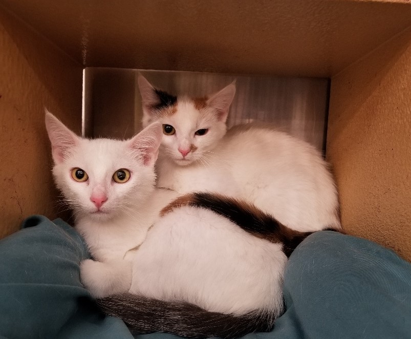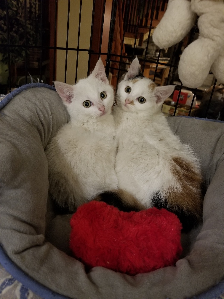 Hooke and Anning Well this pair of siblings was adopted and returned after ten days. In fact, I had to go and get them. When we explain shy, skittish, and semi feral kitties to people they honestly think we exaggerate. A few days of adjustment is normal for friendly kitties, a few weeks or a couple of months is normal for shy, skittish, or semi feral kitties. Honest. They need to start off in a small room, you need to earn their trust, and then the space is slowly expanded with the original room remaining set up as their ‘safe zone’. Where they run to if they become frightened. A quiet home is best, patience is essential, and the rewards of winning over their trust is very emotional. These two were trapped with their mom by St. Louis Feral Cat Outreach in Jennings. Their mom was fixed and returned. They were very hissy when I got them home and using a long narrow brush I started swaying their opinion of me, they loved being brushed. Good wet food helped quite a bit and they started begging for it as soon as I went in their room. The little girl remains more skittish than the boy and they will need patience and time to continue their journey to being purrfect pets. They do very well in their safe zone with their foster mom, but once in unfamiliar surroundings they resort back to hissing and needing reassurance. A calm and quiet home with a dedicated owner would be great, and a friendly cat to mentor them would be awesome. They are cute as bugs and very devoted to each other. Hooke is the purr bug and loves scratching and belly rubs. Anning is more cautious and just loves brushing. When frightened she will turn her back to me so she cannot see me but soaks up all the brushing and scratching she can get. Zero chance I will split up this pair, they must remain together. Hooke is pure white with a black tabby tail stuck on as an afterthought, Anning is mostly white with a calico head and tail. Both are altered, up to date on kitten shots, micro chipped, negative for FIV and FeLV, and have been treated and tested for parasites. Hooke is Heartland #12512CL and Anning is Heartland #12511CL.