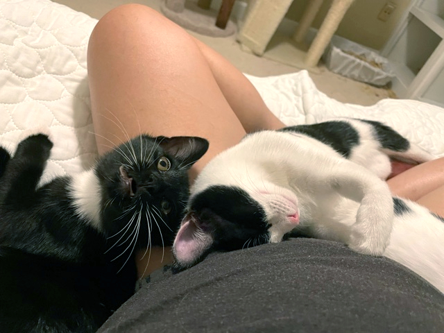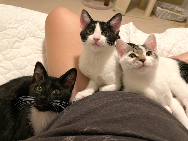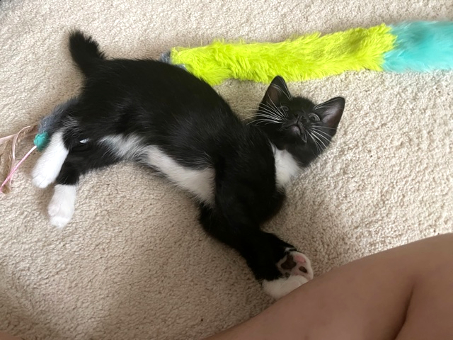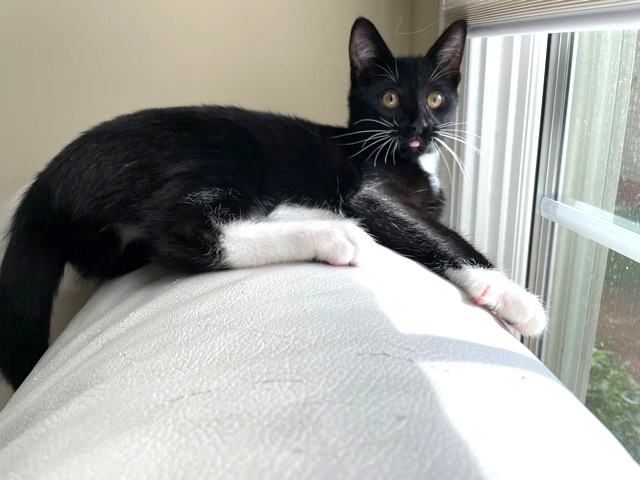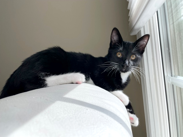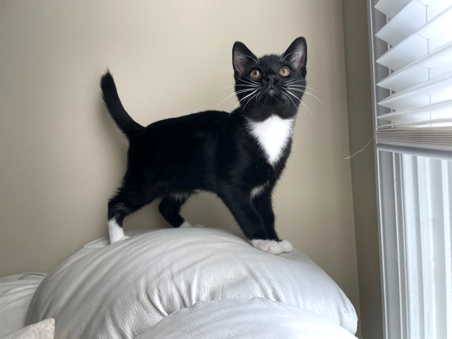 Adventurous with fabulous whiskers!I'm an adventurous kitten who's the first to explore and greet new people! I'm the most independent of my siblings and I love to run around and find new things or people to play with! I'm relaxed and great at meeting new cats and dogs and am respectful of their willingness to meet me. I have a fabulous set of white whiskers that show up great in photos! I would love to be adopted with one of my siblings, Meowzarella or Mewnster, but will do well with another playful young kitty. I'm indoor only and do well with calm children!
