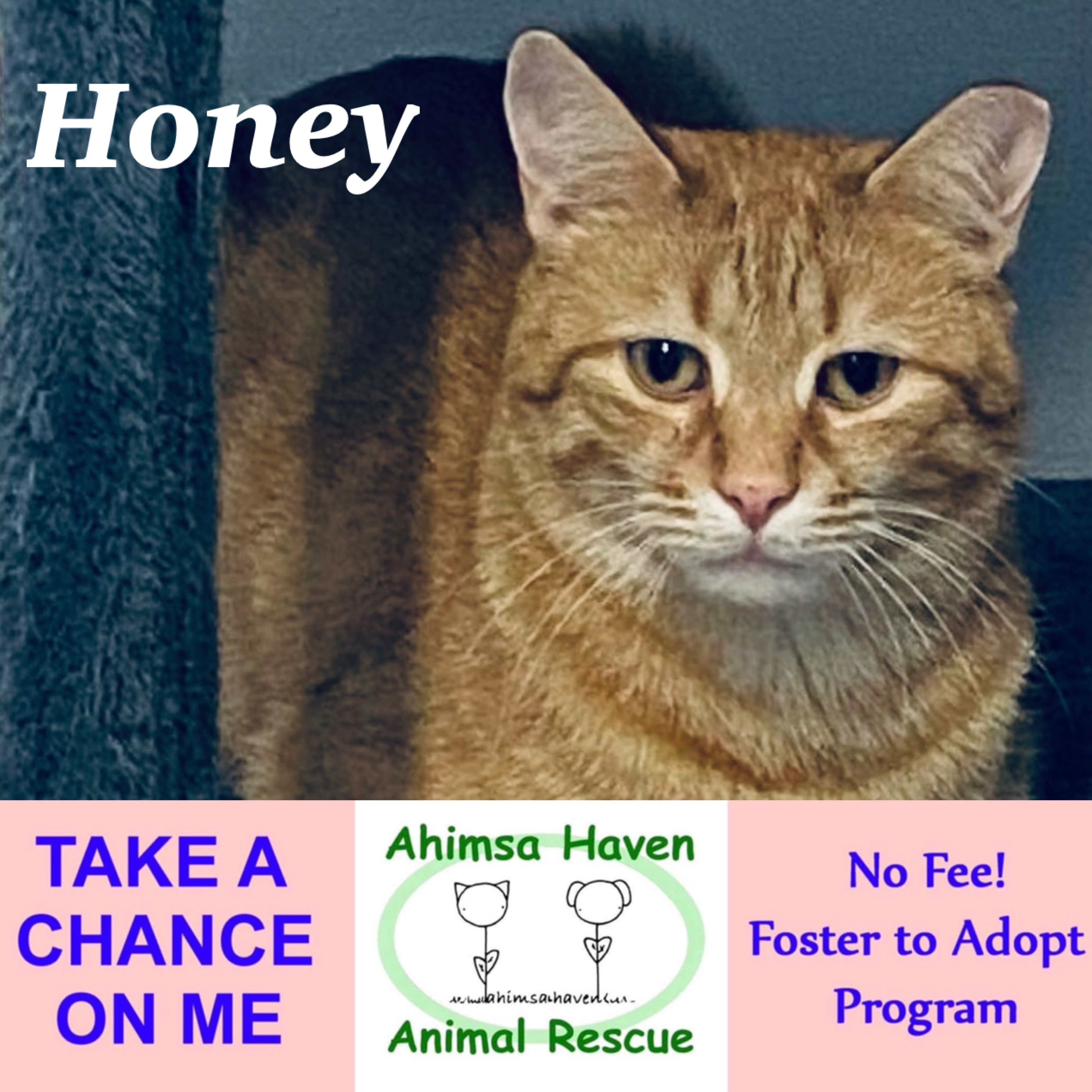 Meet Honey! He is a shy and weary with humans. He is approximately 2 years old and would love a Kitty pal to chum around with. In fact he’s developed a friendship with another shy cat named Clarion. Wouldn’t it be wonderful if they were adopted together? He needs to be in a quiet home, no dogs or small children and another cat is a must. Honey is also part of our Take A Chance On Me Program. This means We would waive his adoption fee for the right home for. You must have a reliable and consistent vet reference. Check out our website (ahimsahaven.org) for more details. Please fill out an application online at ahimsahaven.org . Meet and greets are with an approved application by appointment only. As always, cats that are ready to be adopted are spayed/neutered, have age appropriate shots, are micro-chipped, dewormed/deflead, and FEL/FIV tested.