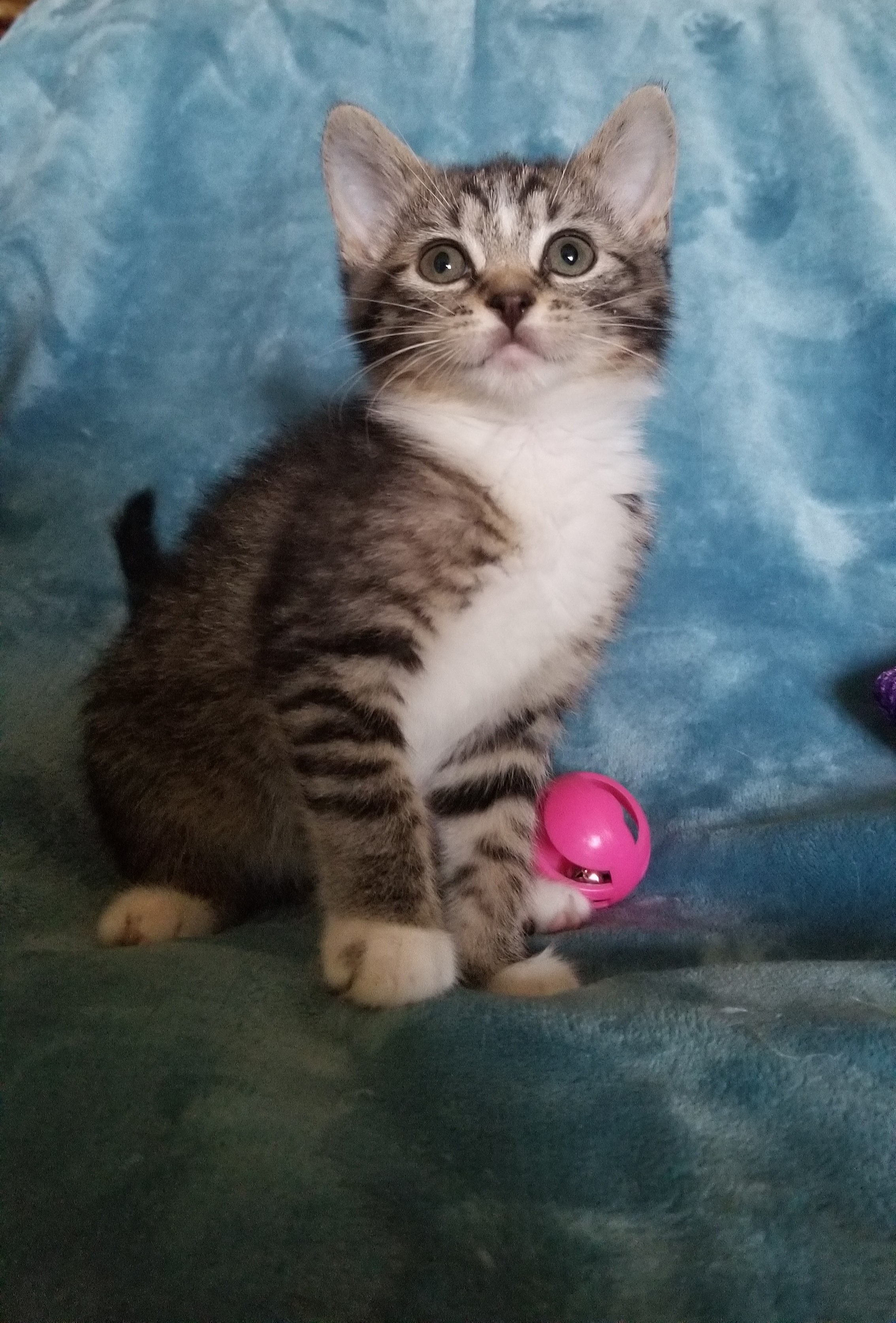 Pooh and Christopher Robin are cute short haired gray tabby kittens about 12 weeks old (DOB about 4/1/21). They both have pink noses, while their littermates, Eyore and Eowyn have black noses. Pooh is female, while Christopher Robin is male. Christopher Robin is laid back, gentle, and loves being the center of attention. He enjoys showing off his acrobatic skills and laser light catching techniques. Pooh is a precious and beautiful little girl. She is extremely loving and enjoys lots of pets and attention. She loves to play with her siblings and other foster kittens. All four LOVE everyone as soon as they meet them. They are VERY playful and active. They love to play with toys or other cats and are never bored. They like to be held and to snuggle. They live and get along well with cats and dogs, and we think they'd be great with kids. They are negative for feline leukemia and aids, had two distemper vaccines, (the third distemper and rabies) included in adoption fee. May be adopted separately or as a pair (discount for two!) Preference will be given to adopters who have a young playmate companion for the kitten. If interested in these cutie pies, please contact Holly at 865-671-4564 or hhfrey1@tds.net