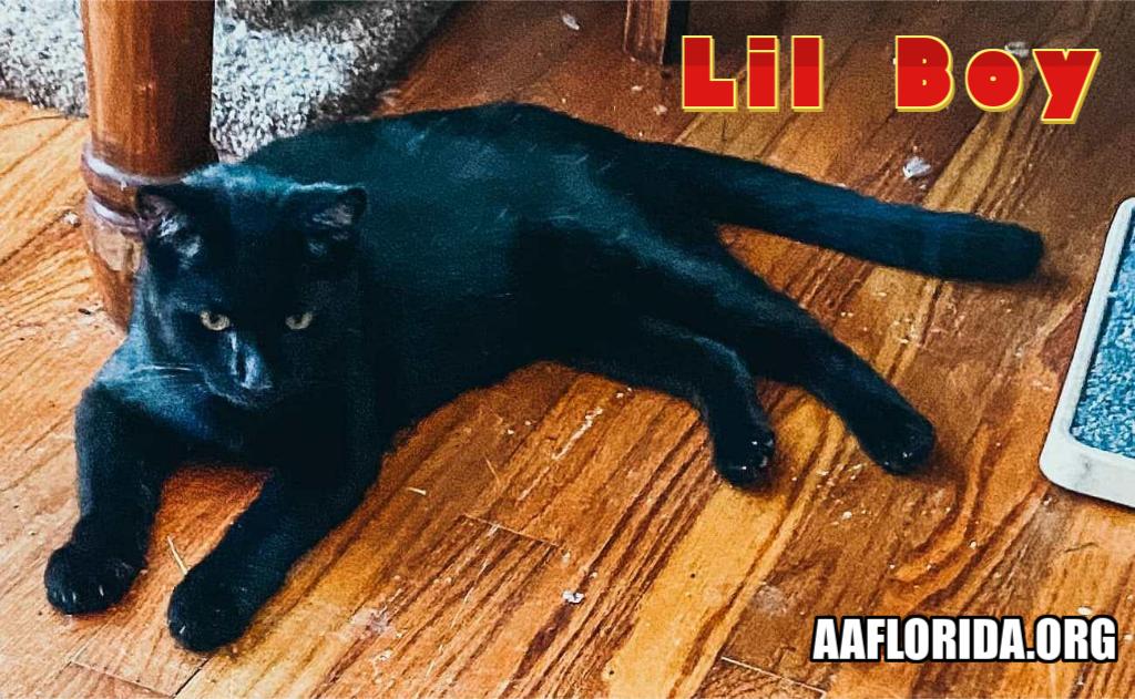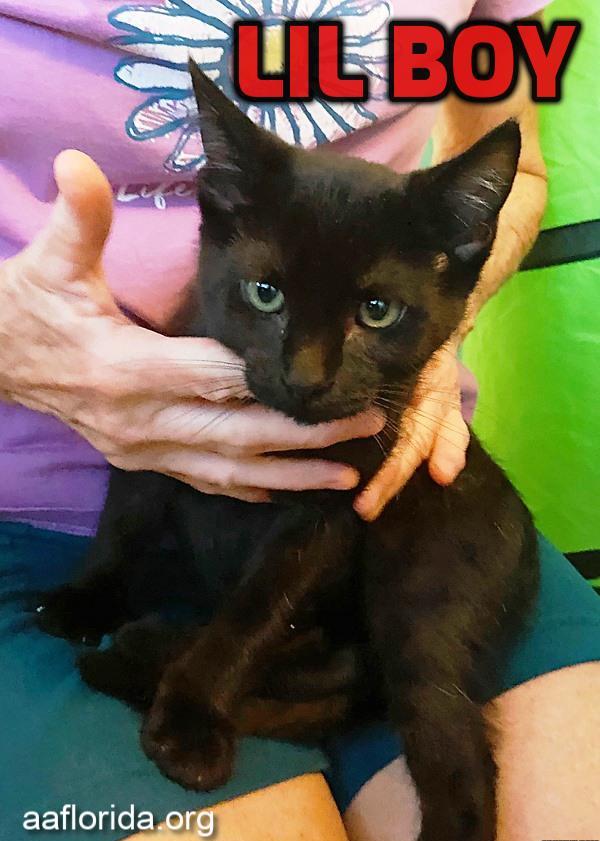 Please consider sponsoring a cat for a little as $10 a month you can help us help more animals in need.Lil Boy got lucky the night of 6/1/2020 and was rescued from the Elks Club on Pensacola Beach. He was so shy at first and much smaller than the other foster kitties. He is filling out and loves to play with his surrogate family. Lil Boy is a beautiful kitty with the silkiest black fur. Although still a bit shy, he does allow his foster to pick him up and pet him. Our adoption fees are $75.00 for any kitty 6 months of age or older. $85 for kittens under 6 months of age. Included in each adoption: age appropriate shots, FeLV test, microchip, and spay/neuter surgery. All kitties are litterbox trained. Prior to meeting or adopting any of our wonderful kitties, we ask that you please fill out our online Cat Adoption Application on our website aaFlorida.org. There is a link on the top of the home page. Click on "Fill in", you don't have to register. For more information about this kitty or any others, you can contact us at Adoptions@aaFlorida.org or 850-780-3223. We are a foster organization and don't have set hours we are open - but we will gladly set up an appointment for you to meet any cat. Of course, you're under no obligation to adopt if you come to meet any of our fabulous felines.