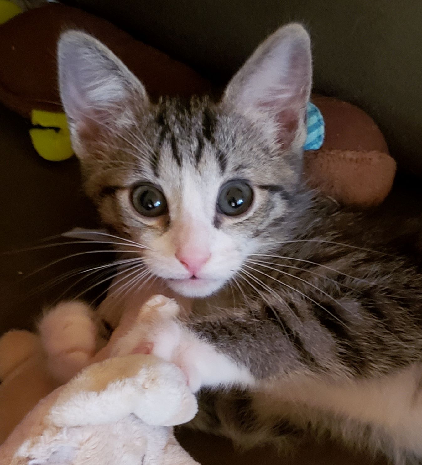 I'll be available after my neuter mid JulyI was born in the house I've been raised in. My caregivers said my mom was "very" pregnant when the shelter called CARE. As soon as I opened my eyes, I was told I kept crawling to the edge of the tub to smell the people when they would visit. I couldn't focus on them but evidently was very curious. I guess that's a pretty smart thing to do at such a young age. It's been great being raised here with my mom, littermates, other cats and kittens, and two dogs! Now it's my turn to find a home with my sister Lake. We are a very playful, yet gentle pair of kittens. We have so much fun with everyone in the house and we love our naptimes too!