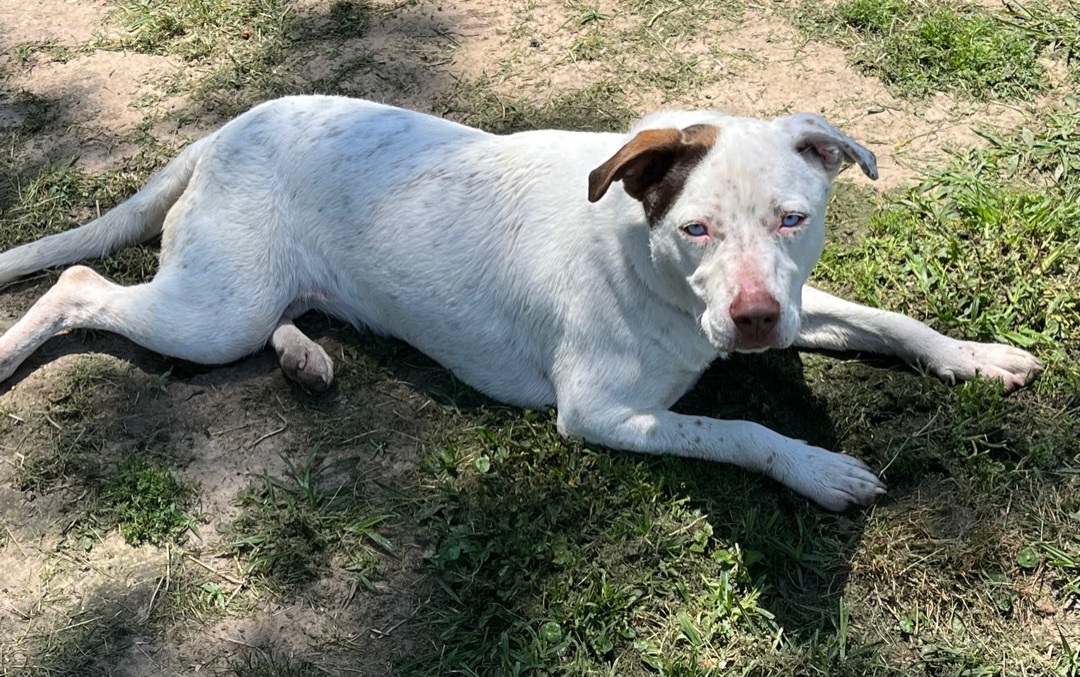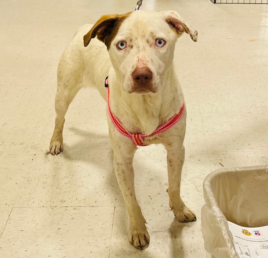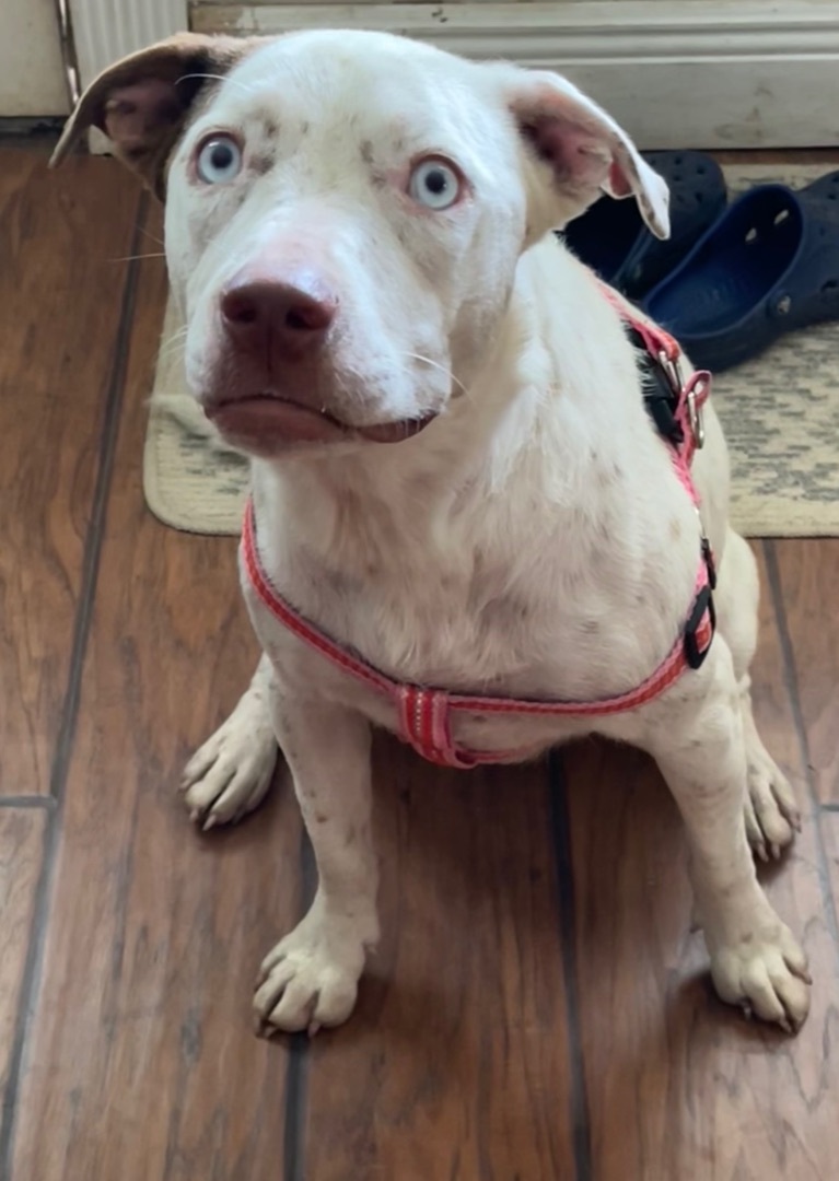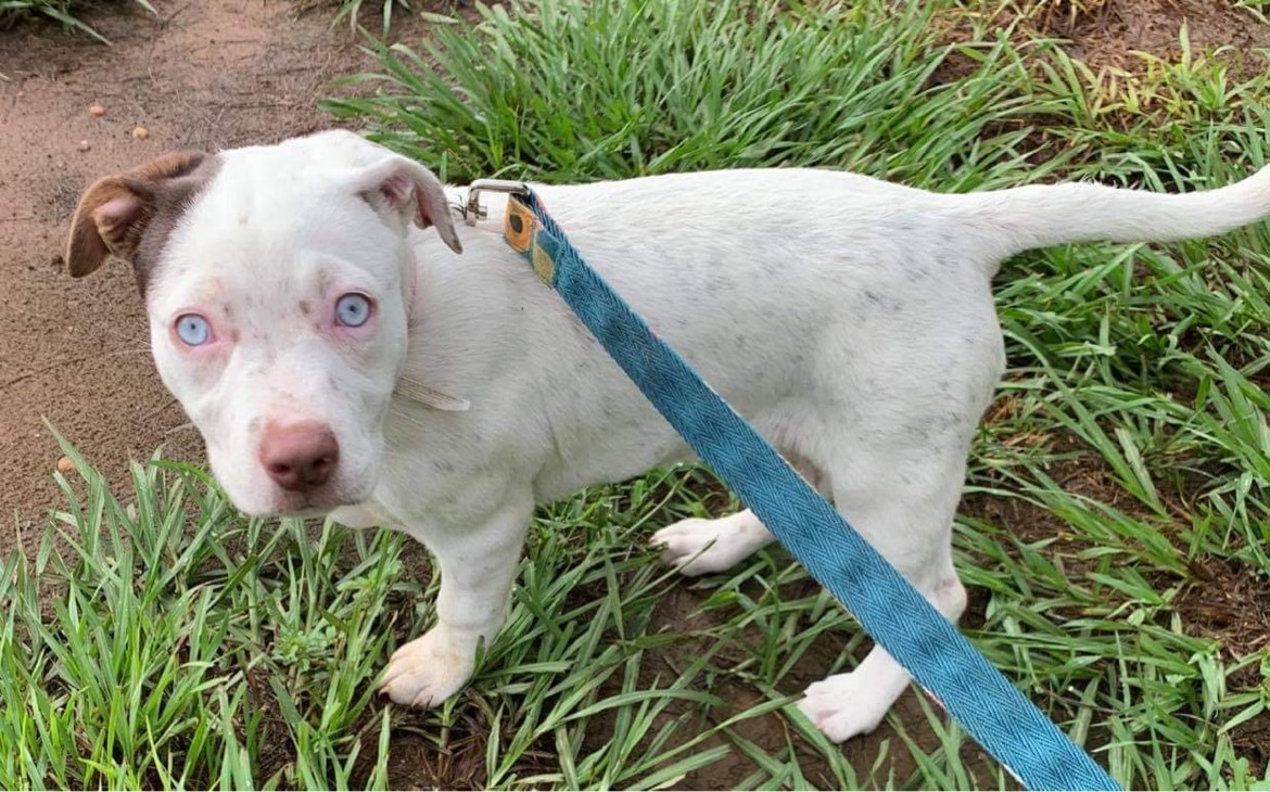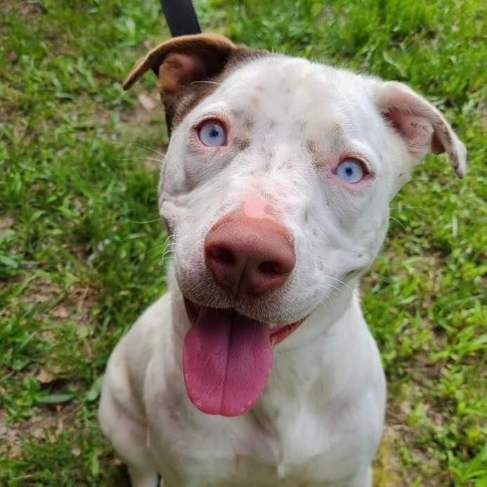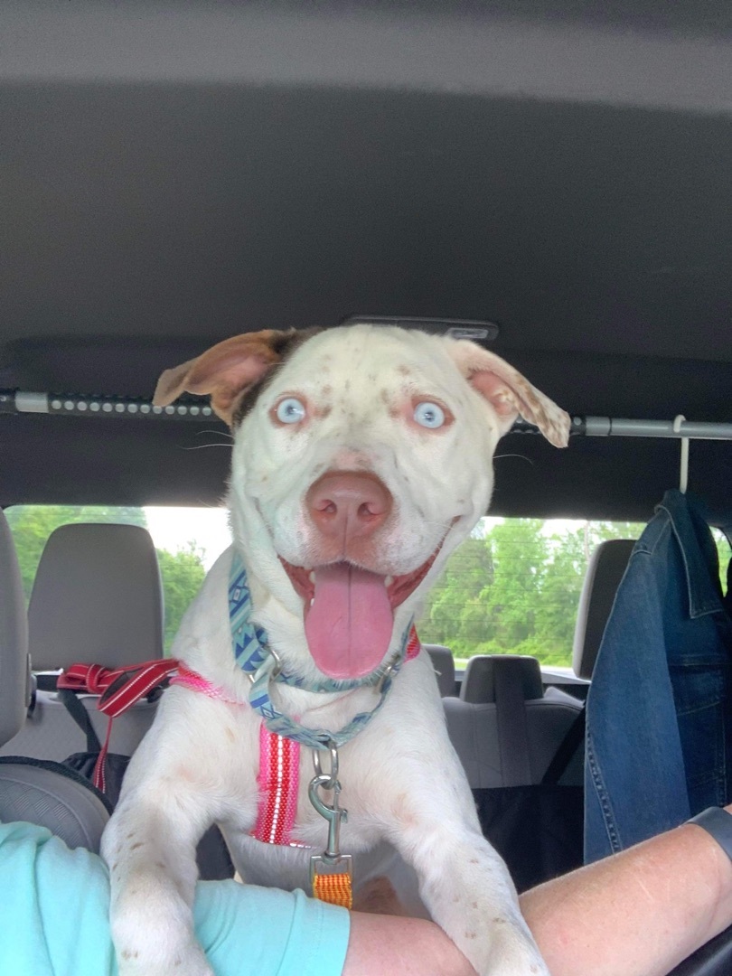 UPDATE!! This beauty is Ember! She was adopted as a small puppy and sadly due to no fault of her own her family no longer wants her. Ember is around 9 months old now and 35 lbs. She is a Bully mix. She has gorgeous ice blue eyes that will steal your heart and the cutest freckles you ever did see. Ember is a total sweetheart. She’s great with other dogs and children. No cats. She’s happy and playful. She does well on a leash and in a kennel. A fenced yard is preferred so she can run and play at her leisure. She is utd, hw neg (tested below detectable levels) and spayed. All dogs have a $175 adoption fee which includes vet check, age appropriate shots (atleast 2 sets for puppies), dewormer, heartworm test (if over 6 months), rabies (if atleast 16 weeks) and spay/neuter! Puppies will be altered before adoption. All rescues and shelters practice pediatric spay and neuter. This is essential in our rescue efforts and it is a policy that we will stick by. All dogs over 8 weeks and 2 pounds will be altered before adoption. There are no exceptions to this rule on all healthy and adoptable dogs. We have researched and discussed in depth with multiple vets everything on pediatric spay and neuter and from a rescue stand point it must be done. Please do not ask for an extension on spay and neutering, it will NOT be granted on a healthy puppy! Puppies/Dogs that are not available for adoption due to vetting not being complete can be reserved with an approved application and a non refundasble $50 deposit. This deposit is applied to your adoption fee and the remaining $125 is due at pick up. Wags and Whiskers is an all-volunteer rescue. We also have full-time jobs and Families. We will try to answer all questions and applications in a timely manner. Please be patient and bear with us . Do not contact Parkway Animal Hospital as they are a vet clinic and can not answer questions on behalf of Wags and Whiskers. All questions and comments must go directly through the rescue. Thank you for your understanding. ADOPTION APPLICATION https://form.jotform.us/70898112177159