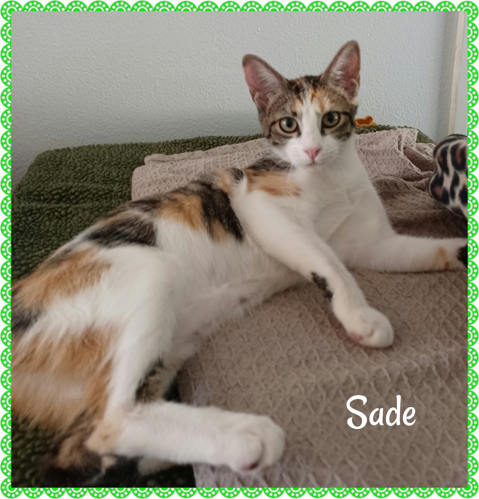 Sade is a female calico kitten born on 3/25/2022Sade is a female calico kitten born on 3/25/2022. Applications are now being accepted for her adoption. For more information about her,please call 951-845-1513 to make an appointment to meet her. You can also file an application online to adopt her at www.barconline.com.