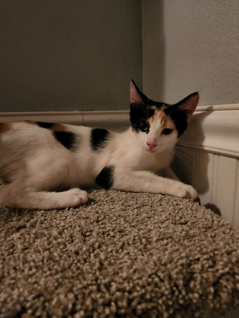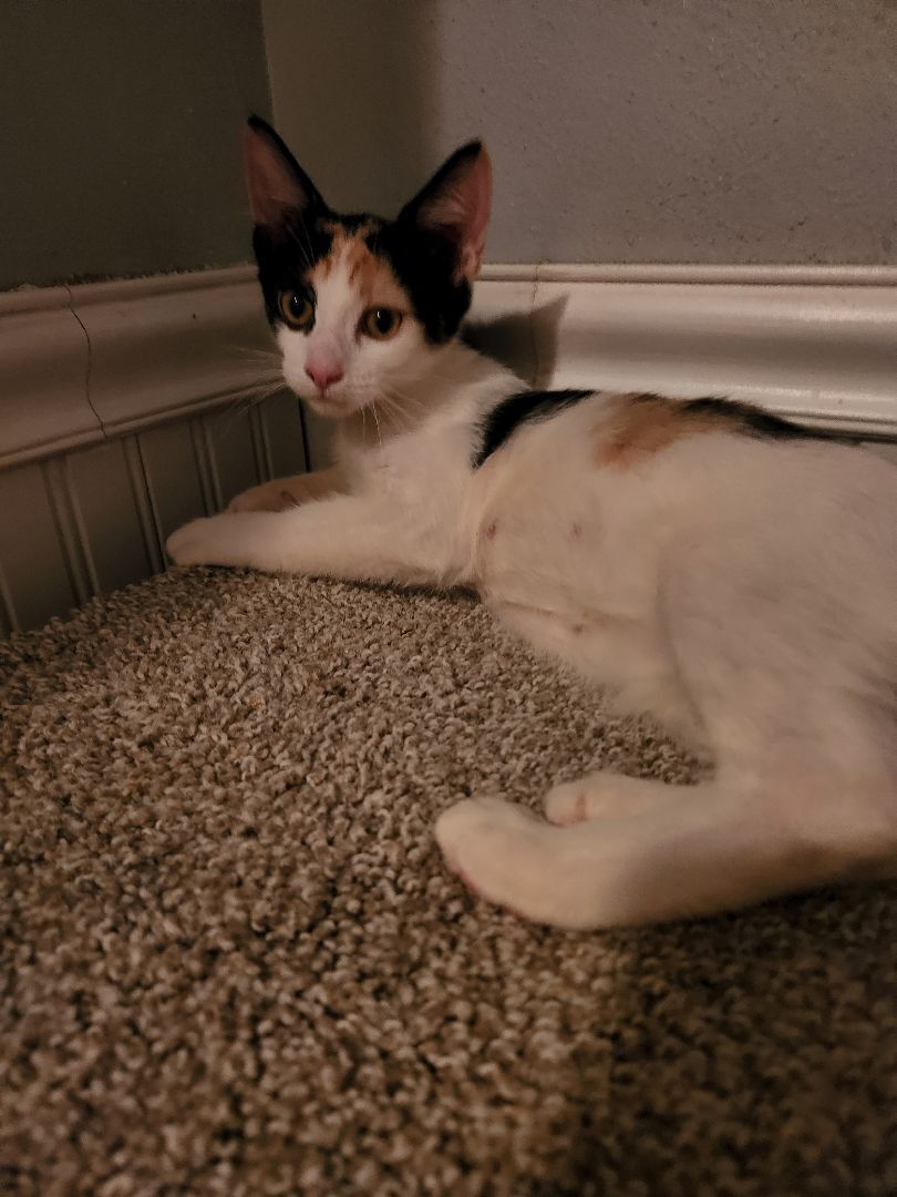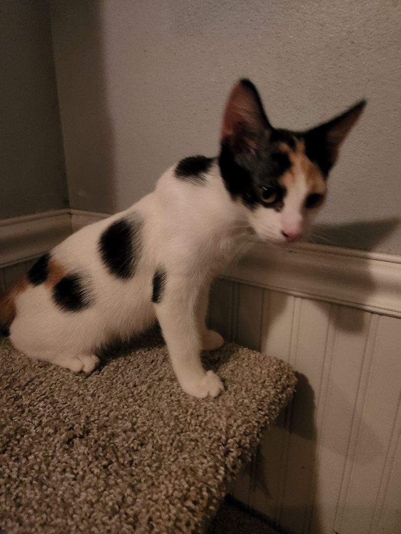 Background: Dottie is a beautiful little Calico girl! She was born on the streets to a stray mom with 3 of her siblings. All of these kittens can be held and they love ganging up on their only brother, Zane.
