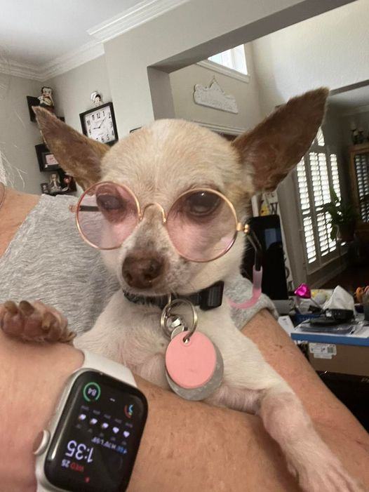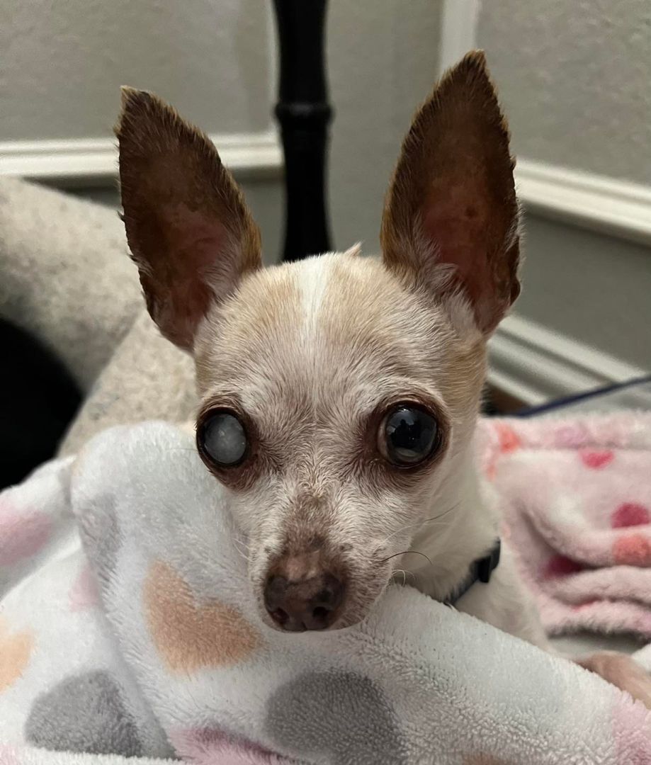 Meet Bella, she is a sweet, loving snuggly & patient co-worker looking for her new forever home. Bella was found wandering all alone in a field in Garland. She is approximately 14 years of age, 4.3lbs and blind. She had cataracts in both eyes when she first arrived at her foster home, but with good food and love one of the cataracts appears to have reabsorbed and she seems to see at least shadows. Even though shes blind she can still see how much you love her. She loves to be held and lap time is a must (if you have carrier, she doesnt object). Due to her age and size no small children in the home. She does love to snuggle with other small dogs. She will be fully vetted (need a dental) and is ready for her new person. Bellas adoption fee is $250. If you are interested in adopting Bella, please go to our website and complete an application for adoption. www.chloespetrescue.org/application