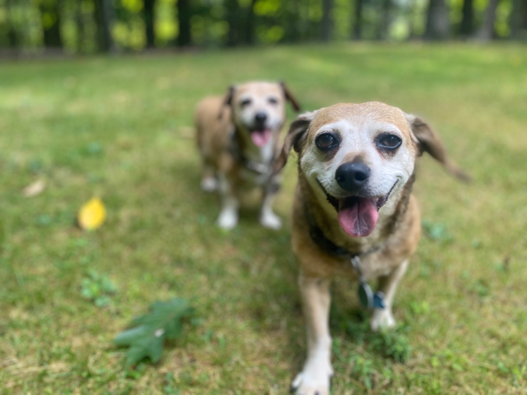 Ginger and Morris are a bonded pair of doxie/beagles that have been together their entire lives. Ginger is 15 years old and weighs 19lbs. Morris is 14 years old and weighs 18lbs. Ginger is definitely more active, outgoing, and vocal. She loves exploring the yard, sunning herself, and eating. She really loves food. Morris is a little more mellow and quiet but just as sweet. Both love people and attention and would love a home where they can get a lot of love and be with their person a lot. They are great with dogs and kids. Unknown with cats. Morris has a grade 3/6 heart murmur but is not currently on any heart meds. Both could benefit from a dental in the future. They are neutered/spayed, up to date on vaccines, and recently had full bloodwork.
