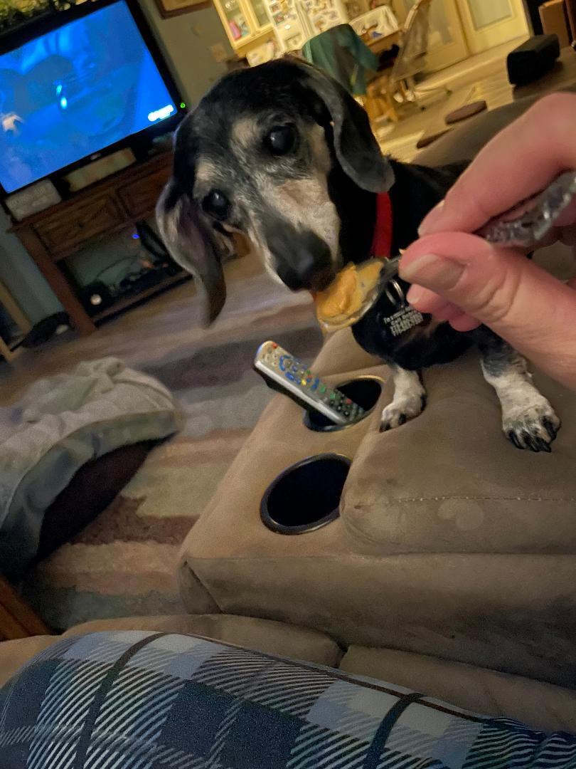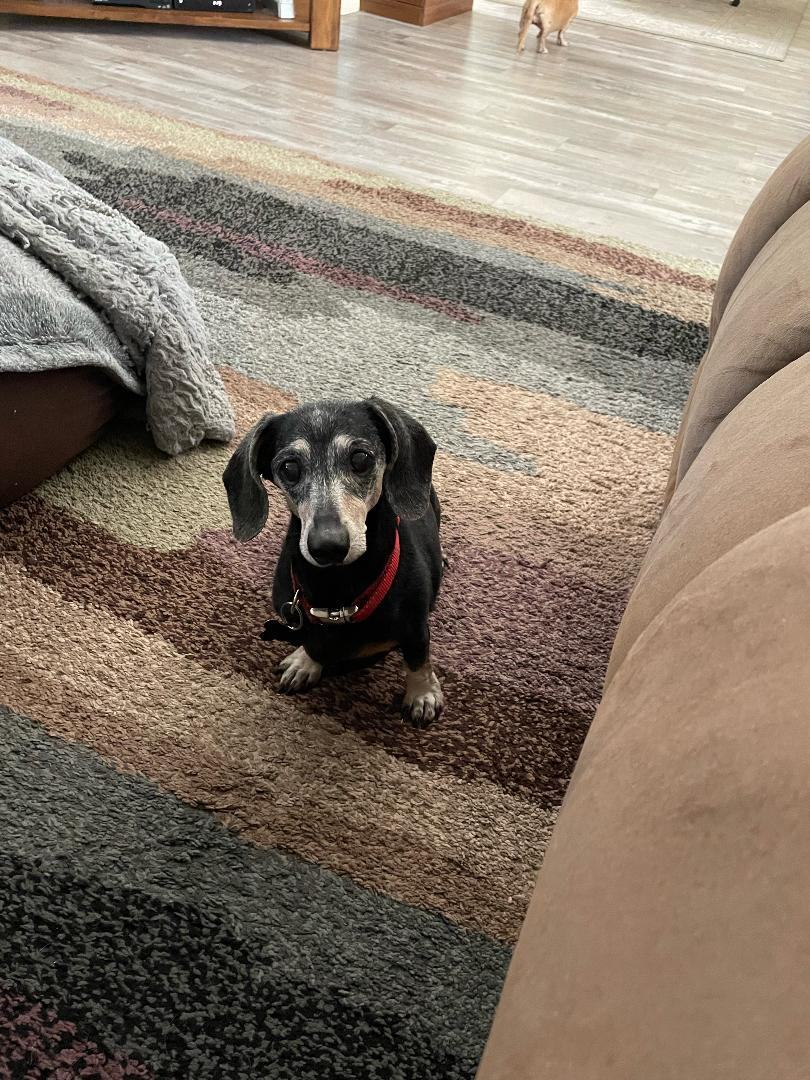 ello, my name is Debra and I’m Frankie’s foster mom. Frankie’s owner went to Heaven . She is a Dacshund about 14 years old, has all shots, spayed, microchip. She just this week had a complete dental - and at that time it was discovered she has a heart murmur-but that does not seem to effect her. In her foster home she hangs out with 2 other weenies and a German shepherd and does fine- but can be a grumpy grannie around her treats and food. SHE MUST HAVE A DOG DOOR to a yard. She is used to this and without one can get upset and have accidents- here she is out the dog door several times a day and night and has not had one accident. It appears she can not hear. She loves to sit on the couch with you or snuggle in bed . I would say no cats. Kids fine. But I think Frankie would love a mellow quiet house??