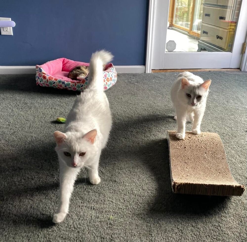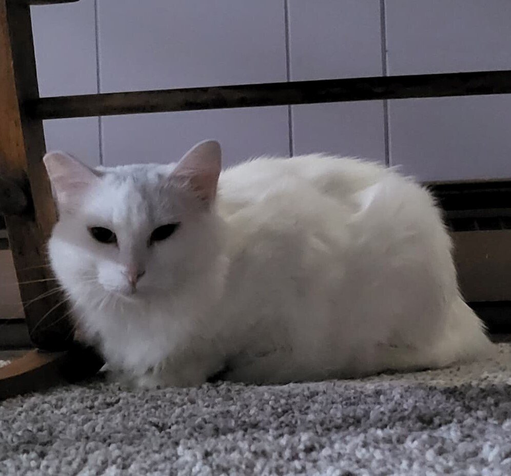 Fluffy was so frightened at first, but given slow and loving care, she flourished. New places will scare her though and definitely new people. She has come so far, but she needs the perfect adopter. A quiet home and patience will be key to gaining her trust and letting her love you. Once she does, she approaches for pets and meals and talks to you. She will need to be started in a room where there are not hiding places (a bathroom would be great or an empty bedroom, with no bed or dresser to hide beneath). In that space, you sit and talk and earn her trust before you open up the rest of your home. I went through this with her, and it was so rewarding to see the progress she made. If I didnt already have a full house, she would be staying! She really, really likes other friendly cats, I do not know how she would be around dogs. Apply to adopt to schedule a meet and greet with Fluffy. Her matching sister, Puffy, was similarly shy and was adopted weeks ago. Flffy is current on vaccines, spayed, has been microchipped, FELV/FIV tested negative, been given dewormer and monthly flea preventatitve. All Mountain Pet Rescue (Asheville) animals are up-to-date on vaccinations, spayed/neutered and micro-chipped before adoption. Contact the foster parent or Mountain Pet Rescue at pets@mpravl.org for more information. Please note that visual breed identification of companion animals has been proven to be unreliable, so for most of our animals we provide a best guess at predominant breed or breed mix. We get to know each of our animals as an individual and do our best to describe and place pets based on personality not breed label. Mountain Pet Rescue is a 501(c)(3) non-profit tax deductible charity (EIN 82-3039637) located in Asheville, NC.