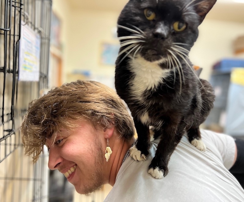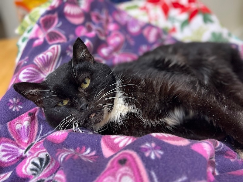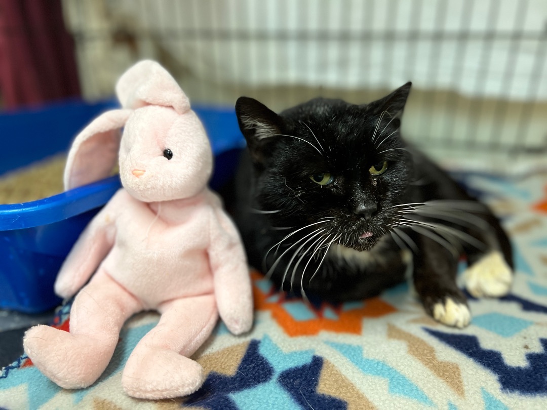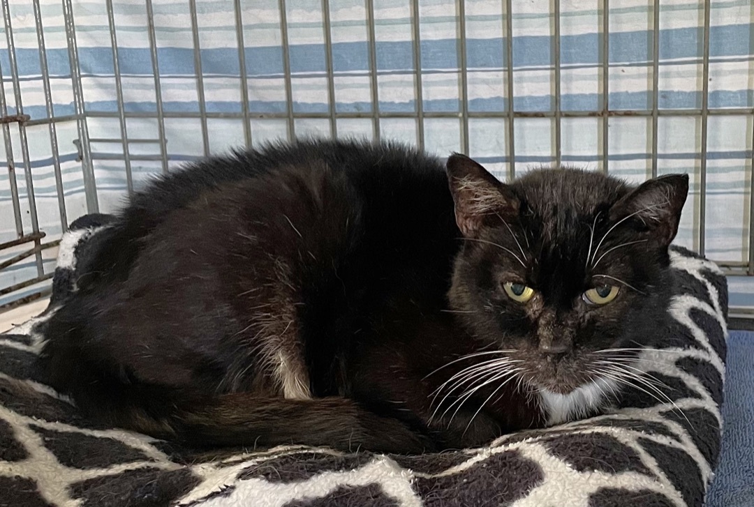 SIT BACK AND WATCH THIS BEAUTY BLOSSOM! THE BASICS: DMH, black w/ white on chest SENIOR FEMALE; EST DOB: 2009 ARRIVAL: March 3, 2022 HISTORY: Gertie was a rescue from a local cat colony by the Cat Action Team. When Gertie arrived at CFC, she was healing from puncture wounds and had some dental issues that have now been resolved. She is friendly and will let you pet her. Once you she gets to know you, she may even let you pick her up! Gertie tends to stay in the lower portion of a cat tree in the Senior Room or her condo. Some of our volunteers have noticed how she connects with her eyes as if to say “thanks” for seeing her as she truly is—a lover. Gertie is not super social with the other cats, so a kitten or an active cat would probably not be a good match. So far it seems like she could possibly get along with another low key feline companion. She just needs a little bit of space, a cat tree/bed or two and a friendly human that will give her attention and the petting she went without and deserves so much. Gertie has settled in and blossomed since arriving at CFC. She is now ready for that special home she deserves where she can live out her golden years in comfort and receive the love that she has earned. If your home sounds like a good fit, do yourself a favor and meet this sweet girl. If you spend quiet time with her she will share her beauty with you too! Volunteer Thought: Sweet girl but would prefer you not mess with her linens. A pet or two are welcome and purrs to let you know it is OK. When she gets to know you, she may even do a lap. She is a happy girl in the senior room. She can do her own thing in a quiet setting. Having her dental and treatment for infections has made her feel like a new kitty.