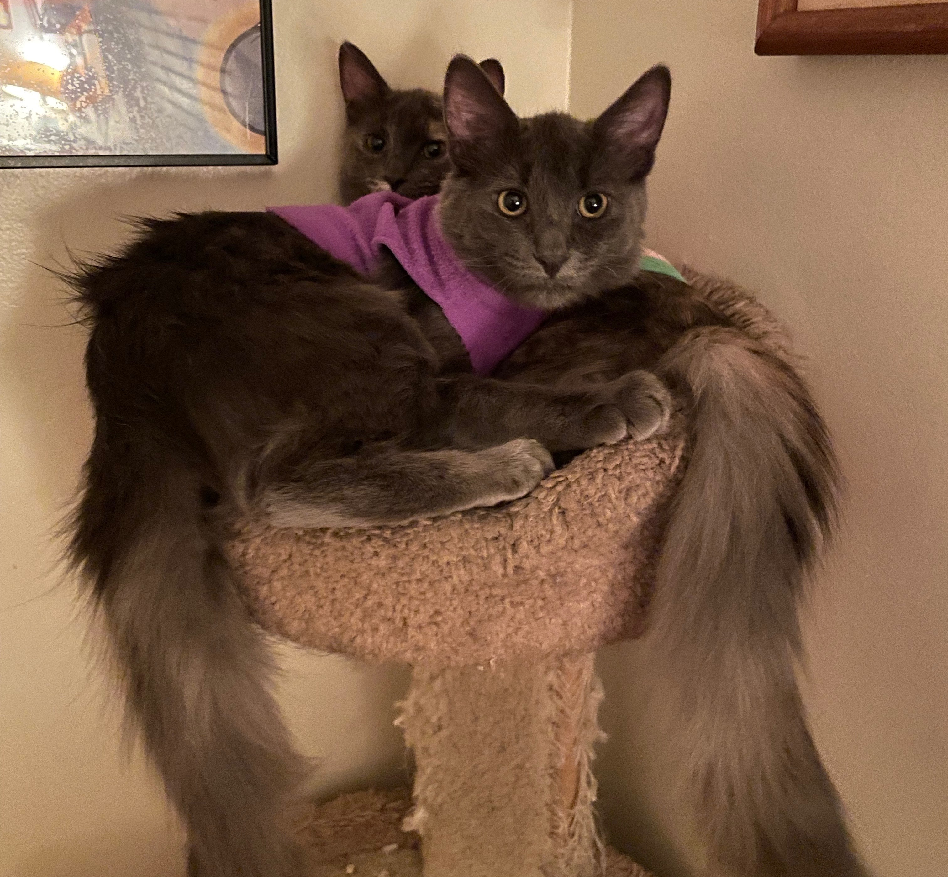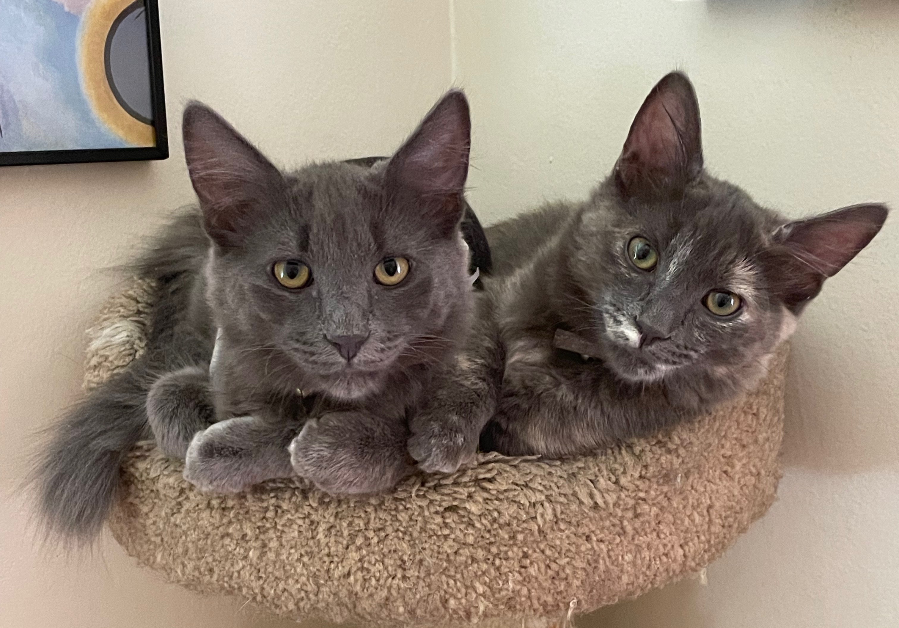 Rose & Cooper are siblings that have grown up together in a foster home since July 17, 2021. They are presently approximately 7 months old (as of January 2022). They were found dumped at a park & were promptly surrendered to the rescue. They have thrived in their foster home, where they immediately blended in well with the 3 resident cats and 3 resident dogs. Rose is gray with some tan swirled in, while Cooper is all gray. They are extremely happy & playful kittens. They play a lot together and independently with the many toys they have. They also love to zoom around and in and out of their tunnels. They have been extremely healthy & have developed very well with regards to their physical size as well as their emotional development. We believe they would best transition to a new home if they remained together. They are bonded and love to snuggle together when they are taking a break from play time. They are both a lot of fun to be with. They are sweet & loving too. Their foster mom could be contacted directly with questions: Maria (818) 605-3993.