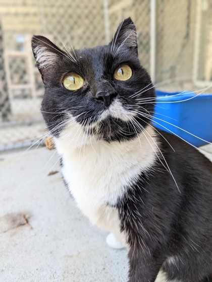 Maisey Female - Black and white - DOB 6/27/15 Heres my sob story. Its true. My owner passed away and I found myself homeless. I dont love it here, nor do I hate it, but its not my home. Im adjusting the best I can but I know I will be much more comfortable back in a home where there are endless sunbeams, chairs, and couches to lounge upon. I have tons of personality and I have such a cute little mustache-y mark on my face. Its hard to not get caught up looking at me. Thats ok. I love admirers. Make sure that when you come to admire me, you bring your cat carrier. I have a feeling you will be needing it.