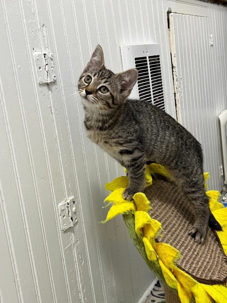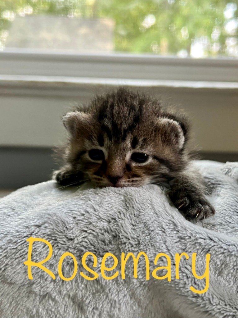 Rosemary is the middle child from Clovers litter.Rosemary is by far the most independent in the group. She sleeps, play, and explores all on her own. Rosemary gets attention on her terms! She would do best in a home with someone who didnt want a clingy cat and would respect her space. She does do well with other cats who are also around the same temperament as her. Meetings and adoptions are currently by appointment only. Please go to our website, kenthumane.org/adoption-application to get started.Once approved, we will call you to set up an appointment to meet with them!