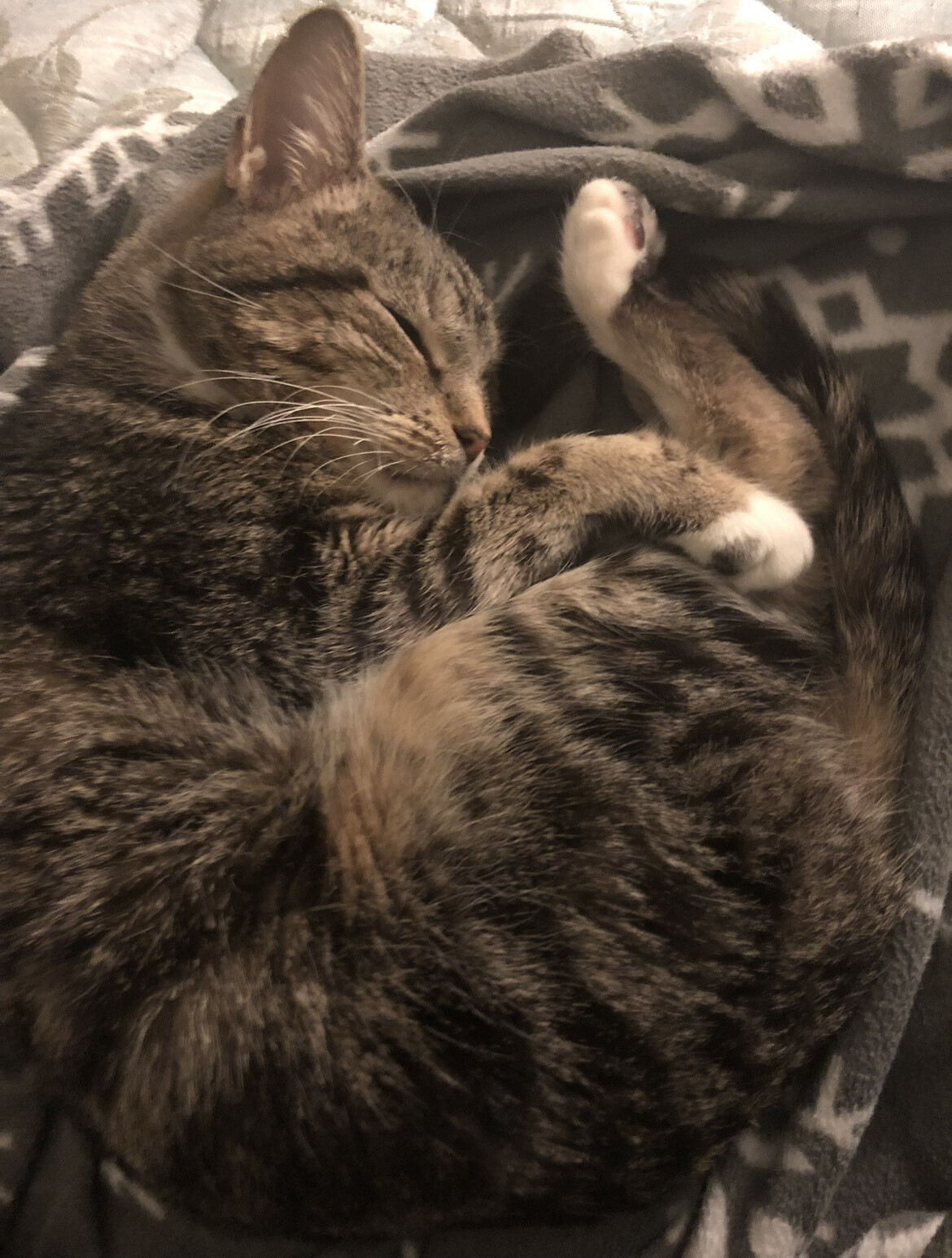 This cuddly purr-ball of a cat is Matcha! She is an adorable love bug who enjoys any and all attention she can get. When she was first taken in as a foster, she had a nasty mouth infection leading to most of her teeth being pulled out. Since she only has a few teeth left she can only eat wet food but other than that she is in perfect health!