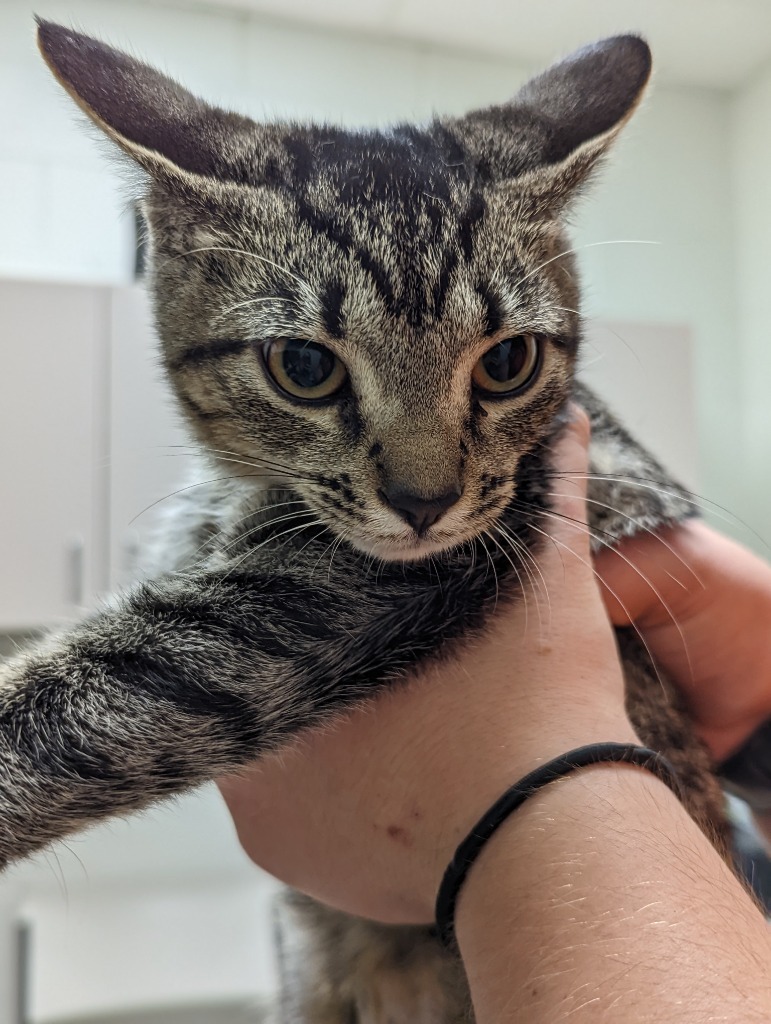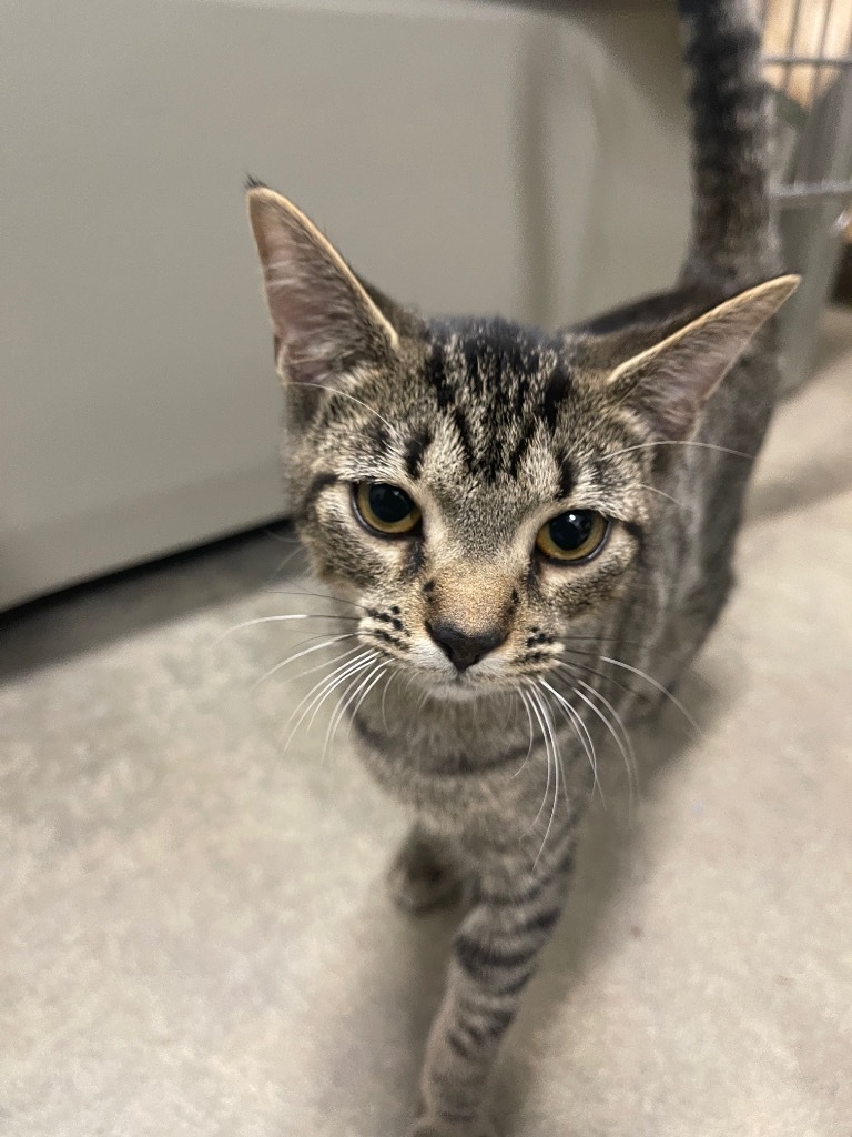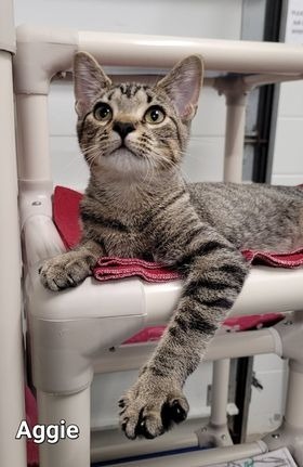 Aggie and her two brothers are new faces around here at the shelter! They were found as strays by a local church group and were brought here to FDHS to find their happily ever afters. Aggie is your typical tabby baby; playful with a touch of cattitude! Shes a bit more confident than her brothers and will be the first of her bunch to come out and make friends with somebody. Aggie is a natural-born diva and she KNOWS it! Do you want a spunky, sassy, striped ball of cuteness? Look no further, Aggie is here waiting for you! **Spayed, microchipped, FIV/FeLV negative, UTD on vaccines & monthly prevention**