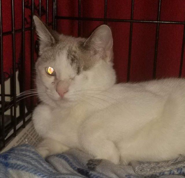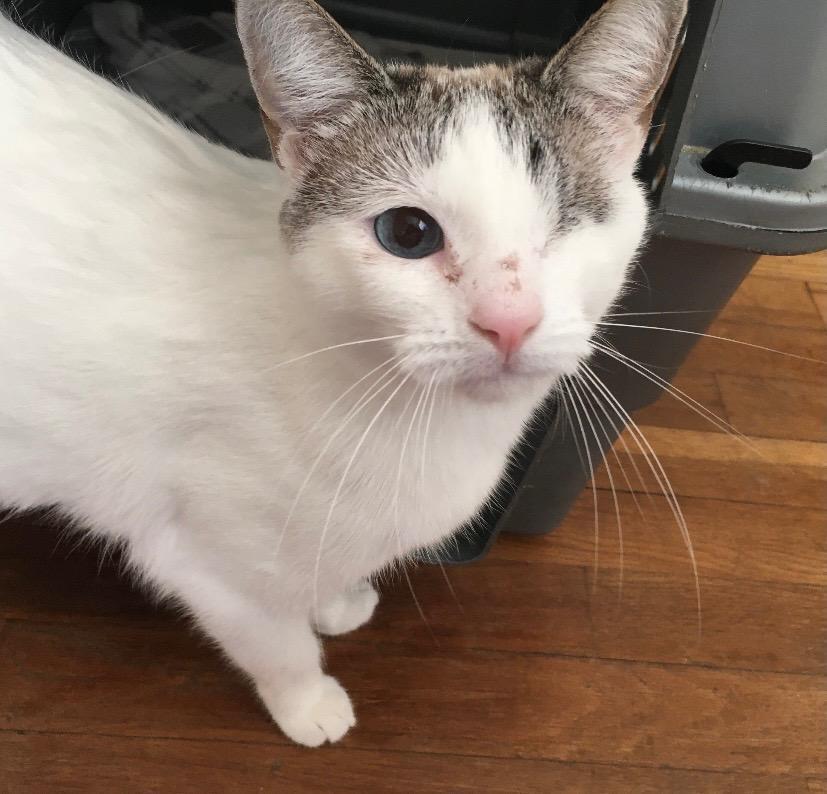 Poppi is a shy girl looking for a quiet home. She lost her eye when she was just a young kitten due to illness.