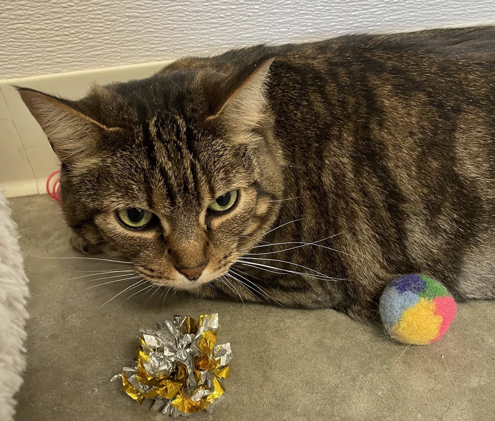Meet Kiki! Kiki is a short-haired dark tabby who is 8 years old. She is a lovely kitty who is still adjusting to the new environment in the shelter. She was surrendered to us due to her home environment causing stress. She will need a quieter home and lots of space to herself. She is good with other cats, dogs, and even kids. She doesnt like being in confined spaces with either other animals or kids though. If you are looking for a sweet older cat to be your new companion, consider adopting Kiki. She does love to flop and give head bumps once shes able to settle in. Her pictures will be updated as she becomes more comfortable. She is a great kitty in need of a home. Stop in and meet her! Our prices are Kitties 0-4 months - $80 5 months -7 Yrs. - $70 8 Yrs. Plus - $25 ++ For the safety of the cat, please bring a carrier. A cardboard carrier is available for a $5.00 donation. ++ Please stop in or call us today - Pet Adoption League 1526 N. Washington Avenue Emmett, ID 83617 208-365-1359 We are Open: o Monday 10 am - 2 pm o Tuesday 10 am - 2pm o Wednesday 12 pm - 5 pm o Thursday 1 pm - 3 pm o Friday 10 am - 2 pm o Saturday 11 am - 3 pm