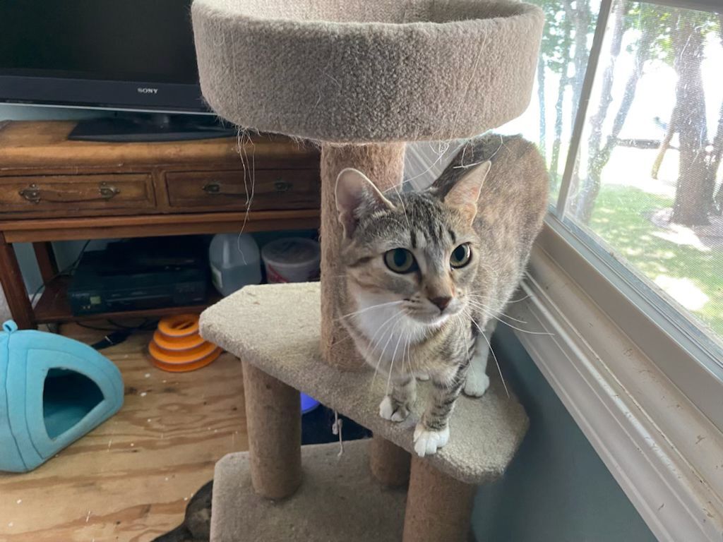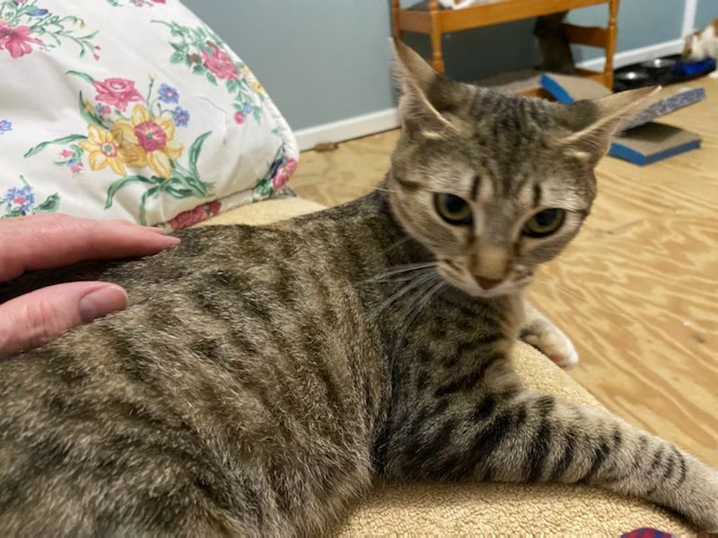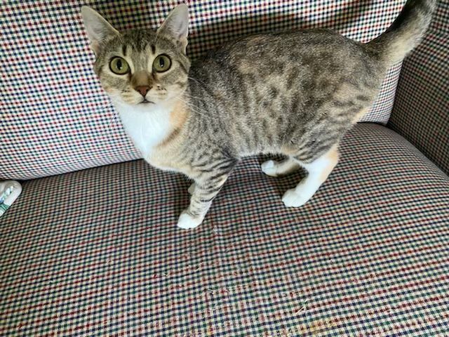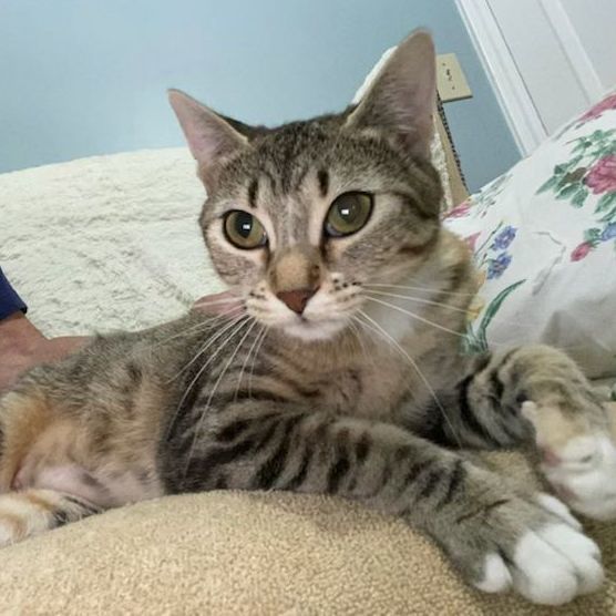 Savannah, mother of Squirt and foster mom to Bubbles, is a beautiful tabby with plenty of white, and lots of spots to go with her stripes. She came to us via a local farm, whod had 12 kittens born there this spring. Sadly two of Savannah kittens were killed by their dog. So we jumped in to save her and her baby Squirt. Shes a bit shy, but once she warms up to you, shes all purrs and pets. She absolutely adores Zeus, an older male. Its like she has a monster crush on him. So if you have it in your heart to adopt both her and her boyfriend, that would be amazing. Of course her baby loves her to death as well. So that would be a great match. Shes in the video on Squirts PF page!