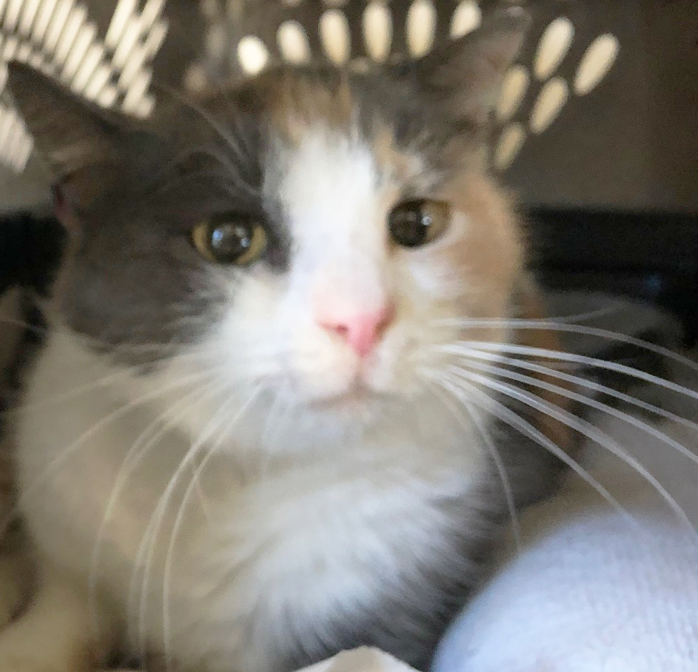 This is another cat who was hit by a car and had a spinal cord injury. Eight weeks of physical therapy has enabled her to walk (or occasionally wobble) and she has started to use the litter box. Were hoping that as she heals, she will do even better. Gets along with the other cats and is bright, alert and interested in the visitors and cats who come by. Might need a little patience with her walking to start with.