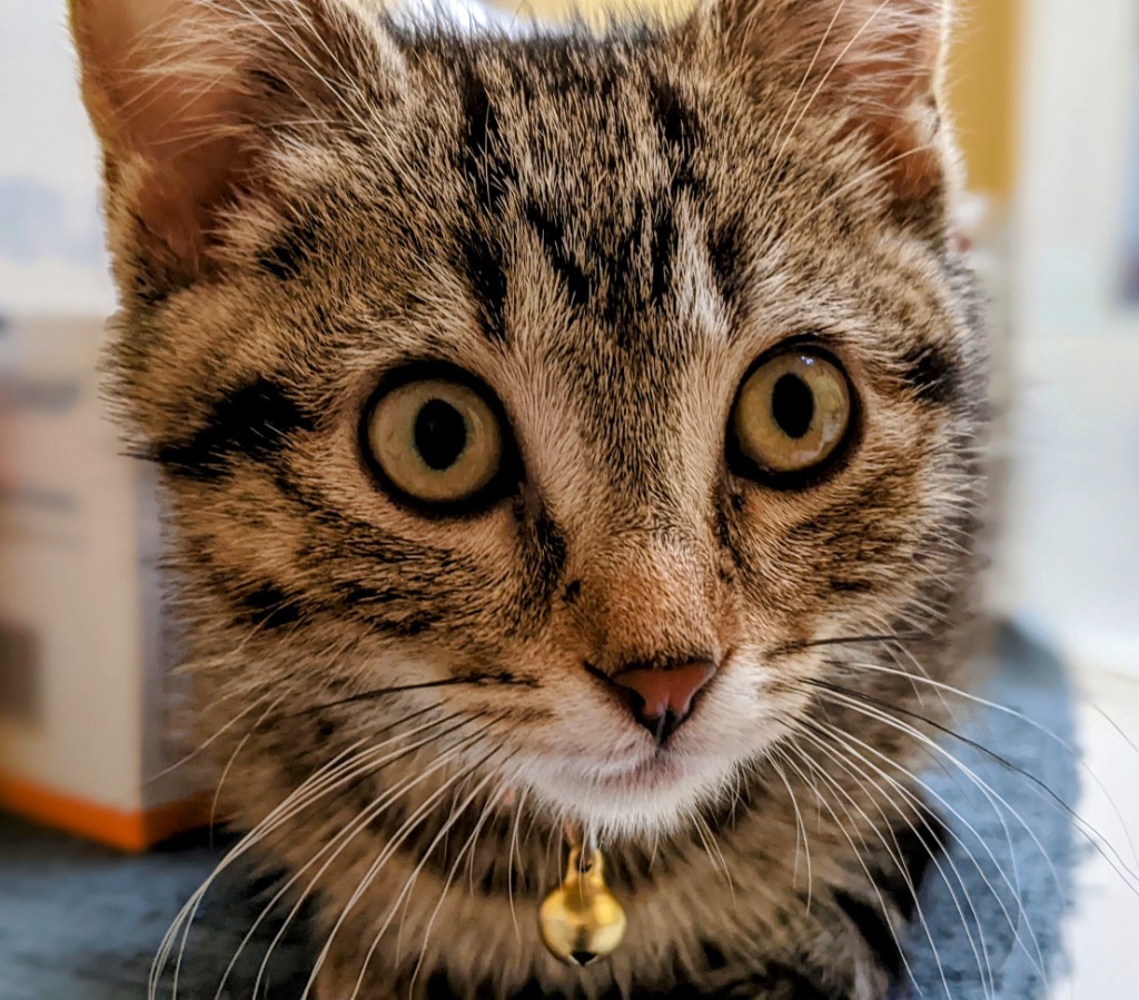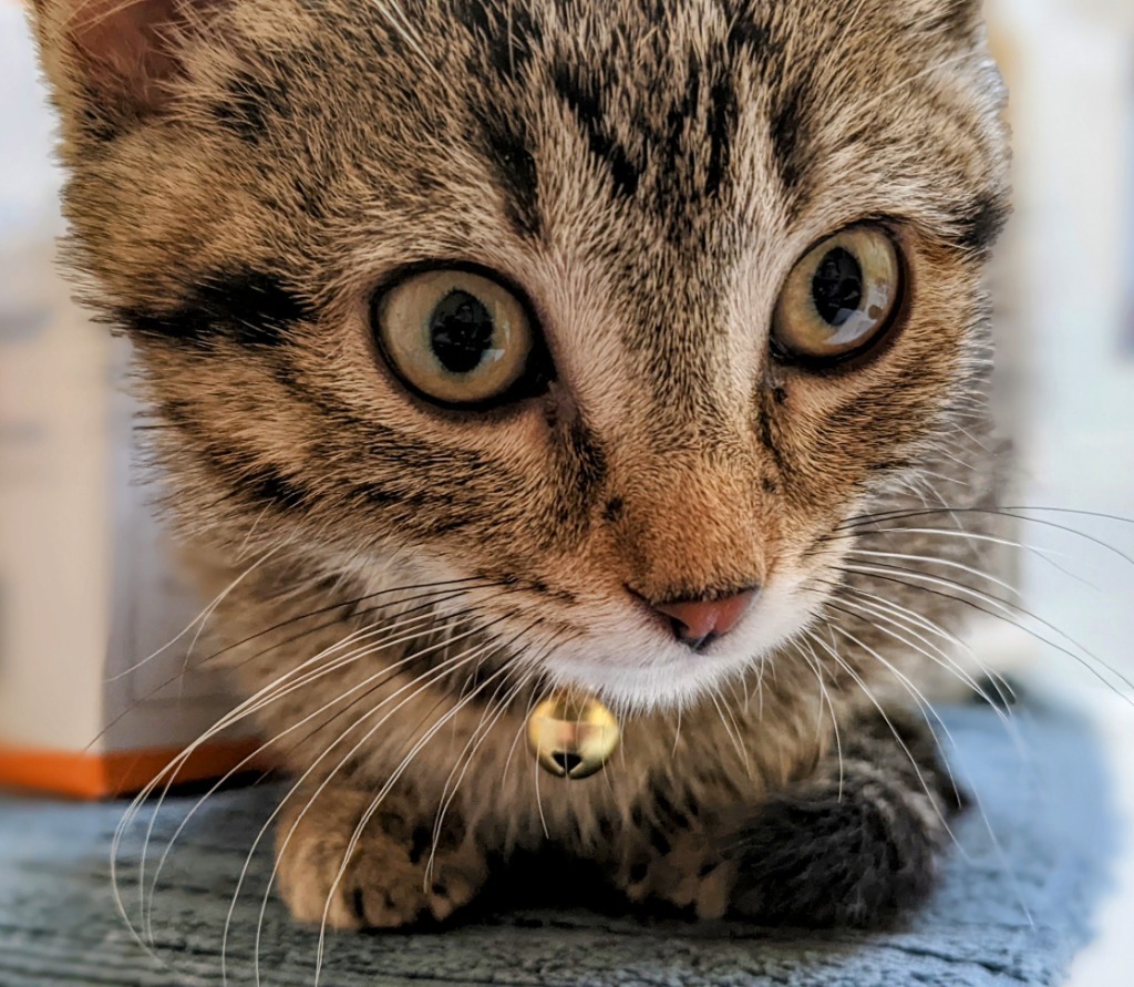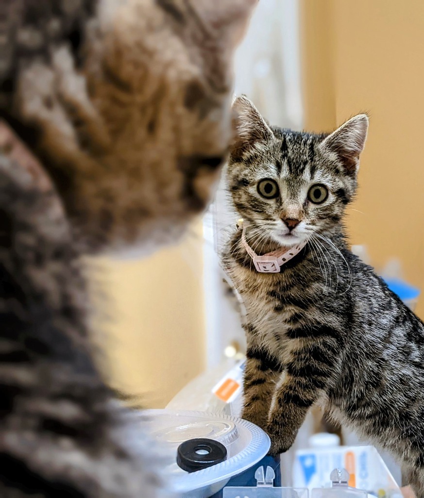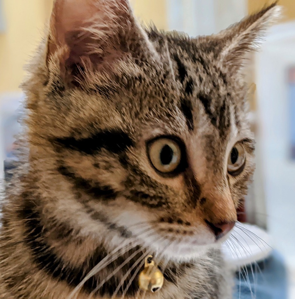 Rosie came to us from a home that decided they were meant to be a dog-only home, but they clearly didnt realize what a treasure they had! She was definitely spicy until she settled into her new surroundings, but even then, clearly wanted to be with people. Once she calmed down...well she couldnt be a better kitten! She loves to cuddle and sleep with you at night, shes a purr machine, land likes to play. Everyone looks for something different in a kitten, but shes just what I enjoy. Not too pushy, but really snuggly. She has some opinions about other cats. She seems to do well with kittens, and I think would like a companion, but will definitely do best with a younger, less assertive cat. I think she will do well with any family structure, kids or no kids, but I would avoid the toddler stage just because she doesnt tolerate mishandling. Shell be available for adoption the weekend of 6/4, but I recommend applications before then.When adopting a kitten, consider a second kitten to avoid ""single kitten syndrome"". Two kittens keep each other busy, get into less trouble, are better socialized and can keep each other company while youre gone. When introduced properly, most cats and kittens adjust well to children and other pets in the home. Its critical that cats have a safe place to retreat to if interactions become overwhelming and that all early interactions are well supervised. If you already have a cat, please talk to us about how to introduce them to each other successfully. All our cats and kittens are spayed or neutered, up-to-date on shots and worming and have been treated for fleas. They also are microchipped and the registration fee is complimentary. The fee for all our cats and kittens is $150 with a $50 discount for adopting a second cat or kitten. If youre interested in adopting, please complete an application at www.catspawjamas.org.