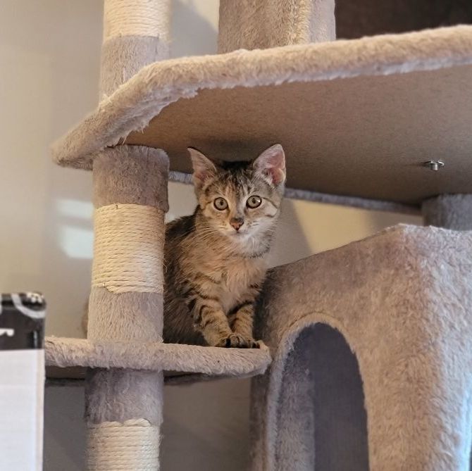Lola is a gorgeous little kitten with unique coloring to her fur. Shes sweet and affectionate but also has a independent streak, its the perfect mix! She spends her days chasing the other kittens in her foster home, batting toys around, and cuddling in a cozy spot. Lola is about 3 months old, spayed, vaccinated, and microchipped. If youre looking for a pair, Lola has a sister named Petunia! Apply to adopt at charliesarmy.com/apply
