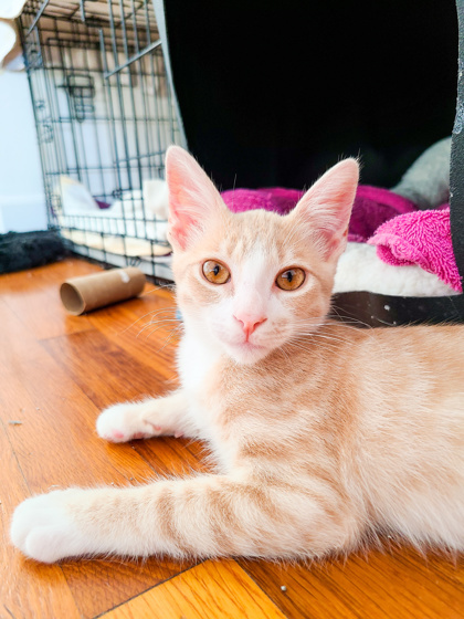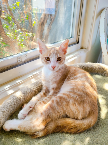 A handsome little boy who loves to climb all over you and purr up a storm! Sombreros favorite things to do are to get into messes and to run around exploring! He loves finding toys to play with, or playing with his littermates! Please note: we only adopt young kittens in pairs, unless you already have another cat at home for them to grow up and play with.