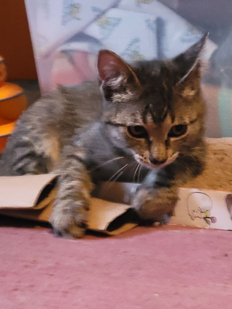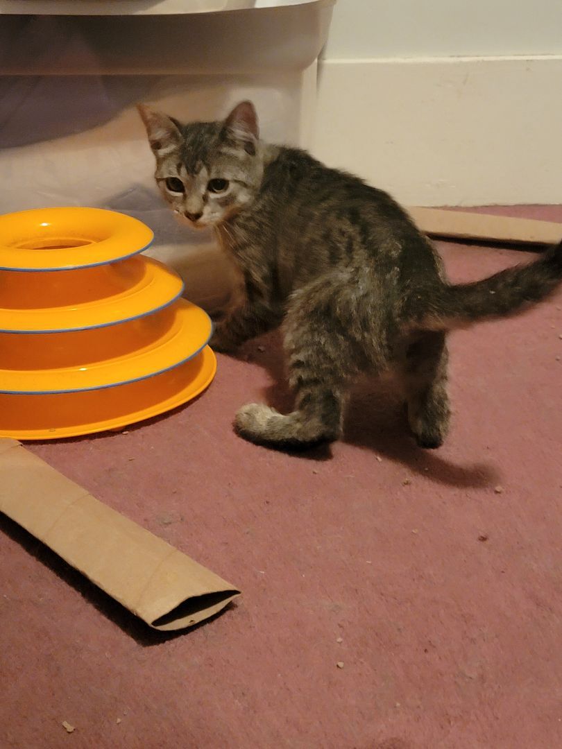 Remi is approx 4 months old. She was the runt of the group but has a huge personality. She is super sweet and Very playful! Remi is positive for FIV. She is sisters with Raya