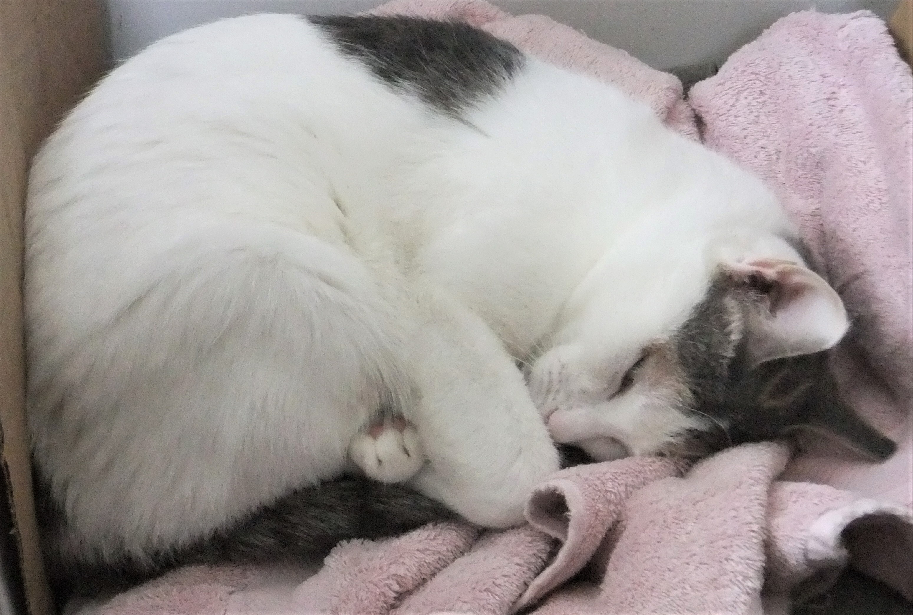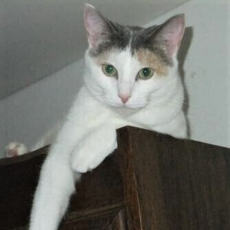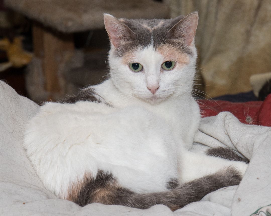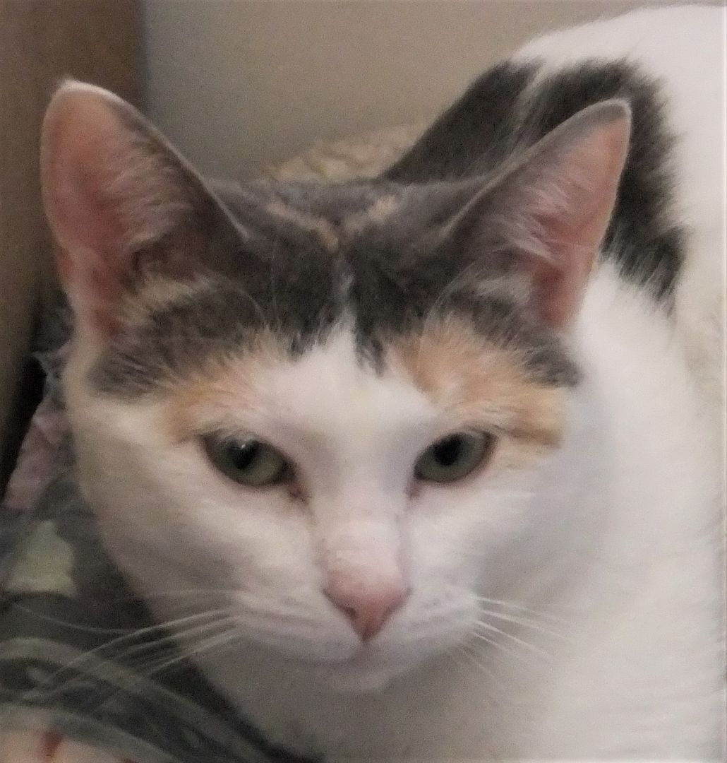 Lovely Abigail came into rescue after being found outside as a stray by a very nice man in the Wisconsin Dells area. She was terribly skinny and very hungry, the man thought she might be a lost cat as she was timid but yet seemed to be friendly when he found her so he contacted us. Abigail was taken to our Vet to be scanned for a microchip but sadly she did not have one. She was examined by our Vet and deemed healthy to Vaccinate at the time, he figured she was about 6-9 months old as she was tiny and only weighed about 6 pounds 20 oz. She could be possibly older but was underweight so that was also given some consideration that she could be 1 to 1 ½ years old. Her intake date was in late July of 2017 so we have given her an estimated date of birth as October 28th, 2016 We looked for a possible owner and posted Abigail on multiple lost pet websites and on social media pages as a found cat, sadly no one came forward to claim the poor girl, we have waited above and beyond what most rescues do with the Wisconsin State Law for mandatory stray hold giving the owner plenty of time to come forward to claim her. Abigail was rather timid when she first came into rescue so plenty of time was allowed for her to become comfortable in her foster home and for her to learn to trust her human caregiver and to love the indoor life of a housecat once again. She has blossomed in her foster home and now Abigail is ready to have her own furever home and this adorable little petite girl so deserves it too! Her foster mom says the following about her: “Abigail is a sweet, friendly, funny and most curious cat, she loves to play with toys and has been known to get the zoomies when you least expect it and you will laugh when she does. She has done well in my multi-cat foster home and gets along with all the kitties. She does have a few favorite foster buddy cats that she likes to play with as they can keep up with her playfulness. Abigail is the first to inspect anything new coming into the home such as grocery bags, boxes etc., her curiosity at her new finds in the home can be very funny to watch as she leaps into boxes and especially into paper bags.” Abigail is very healthy, she is spayed and has all her claws, up to date on her Vaccines, tested negative for FIV/FeLV and she is also microchipped. She is litter box trained with clumping cat litter and she uses the cat trees and scratching posts at her foster home. Abigail has not been a picky eater and will like what ever you offer food wise. Abigail is a domestic shorthair with beautiful green/gold eyes that change in the sunlight, she is mainly bright white with dilute Calico patches of grey, gold and peach, she has an adorable striped tail and a lovely pink nose with matching pink toe beans! Abigail would be fine as a single companion cat or if there is an existing mellow male cat in the home that is around her age or older and is also cat friendly. Slow introductions would need to be made just like anytime you introduce a new kitty into the household that has an existing kitty already there. Abigail would do best as a companion cat with one person or for a couple, she has not met any children in her foster home so we think a home with no small children living there would be best for her, older kids such as middle and high school age she would most likely be fine with as they could spend time with her and play with her. Abigail will also make a great office assistant if you work from home like her foster mom does, she will keep you company while you work and entertained in every room you go in…she probably would not mind being introduced on a Zoom call either! Please consider adopting beautiful Abigail and giving her the furever home she is so deserving of. Note: Our kitty photographer has not been able to make it out to our foster homes yet, we will update new photos once we have them done…in the meantime enjoy the photos Abigail’s foster mom has taken. Abigail is lovingly fostered in a home in Spring Green, WI. Transport is available within 2 hours driving distance of Madison, WI
