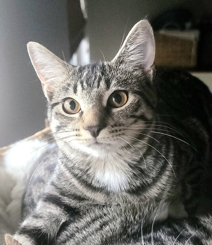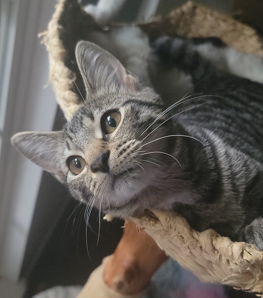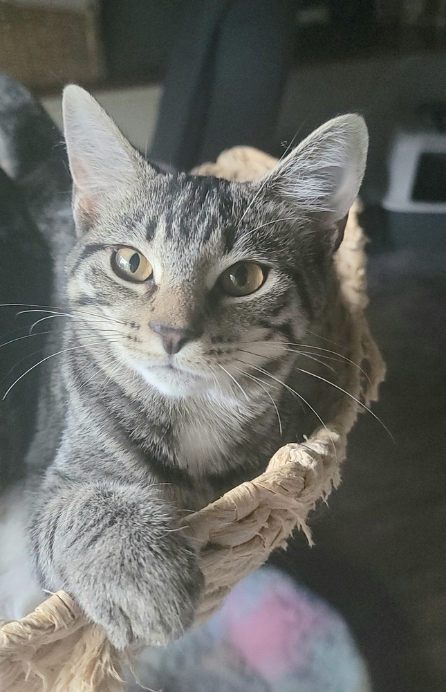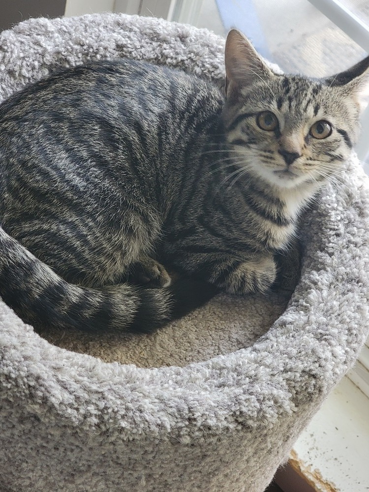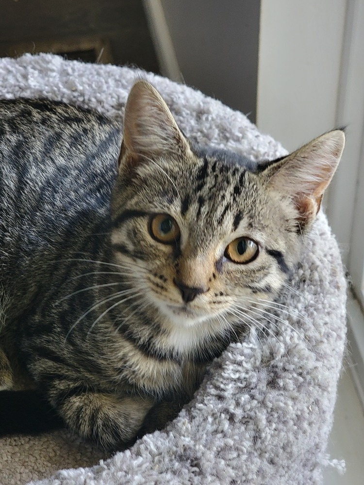 Wouldnt you like to add a little sunshine to your life? My name is Sunflower (Sunnie) and Im the cutest little tabby kitten, spotted and striped like a tiny bengal cat. When Paws took me in, I was so scared of people but adjusted quickly. My foster mom was patient with me, and so I grew to trust her pretty quickly. Now I love her and purr so loudly every time she pets me and I dont even mind being held anymore. Running around the house with my sister and playing with toys and are my favorite things to do. Im good with kids and I live with two dogs and many cats and get along well with everyone. If you are looking for two kittens, my sister and I would make a wonderful pair as we are very close and cuddly with each other. But its not a requirement. So please consider adding this adorable little ray of sunshine to your loving home!