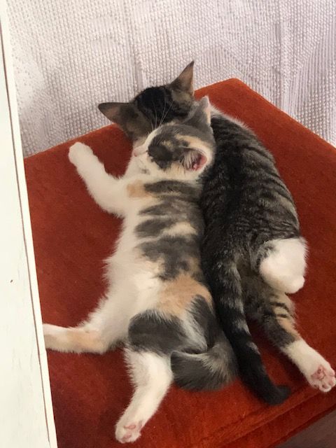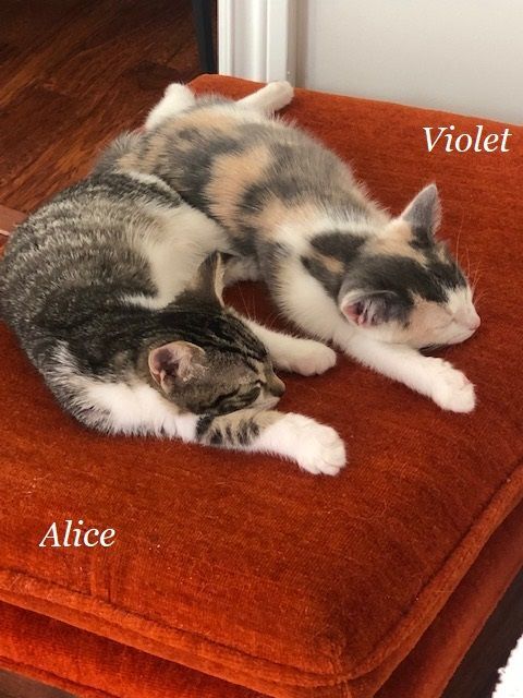 **NOTE: All AVA kittens under 6 months of age MUST be adopted in pairs or to a home with another young cat. AVA does not accept applications for single kittens.** Alice and her stepsister Violet were rescued from a backyard at a young age. Their moms were sisters. Violet looks like the mom. Alice is the big sister by about 2 weeks. They are bonded and must be adopted together. Since they were brought in, they have been inseparable. Alice is very outgoing and adventurous and Violet tends to follow. Alice loves to play with her sister and they spend many hours roughhousing. Alice is a little picky with food but enjoys temptations. She also likes laying beside me or on me and purrs loudly when petted. Would you like to make Alice and Violet a part of your family? You can start the virtual adoption process by filling in our online application found at: avacats.org/adopt/adoption-form. Our kittens are also fully vetted which includes spay/neuter, first-round of age-appropriate vaccines at time of adoption, flea and worm treatments, microchips. Adoption fees are $225 for each kitten up to 12 months old. All AVA kittens 6 months or younger must be adopted in pairs or go to a home with another young cat (3 years or younger). Kittens learn from each other how to behave, which helps them turn into well-adjusted adult cats. In general, paired cats have happier and healthier lives because they have a constant companion and playmate. Plus, it’s twice the fun for you, and half the work!