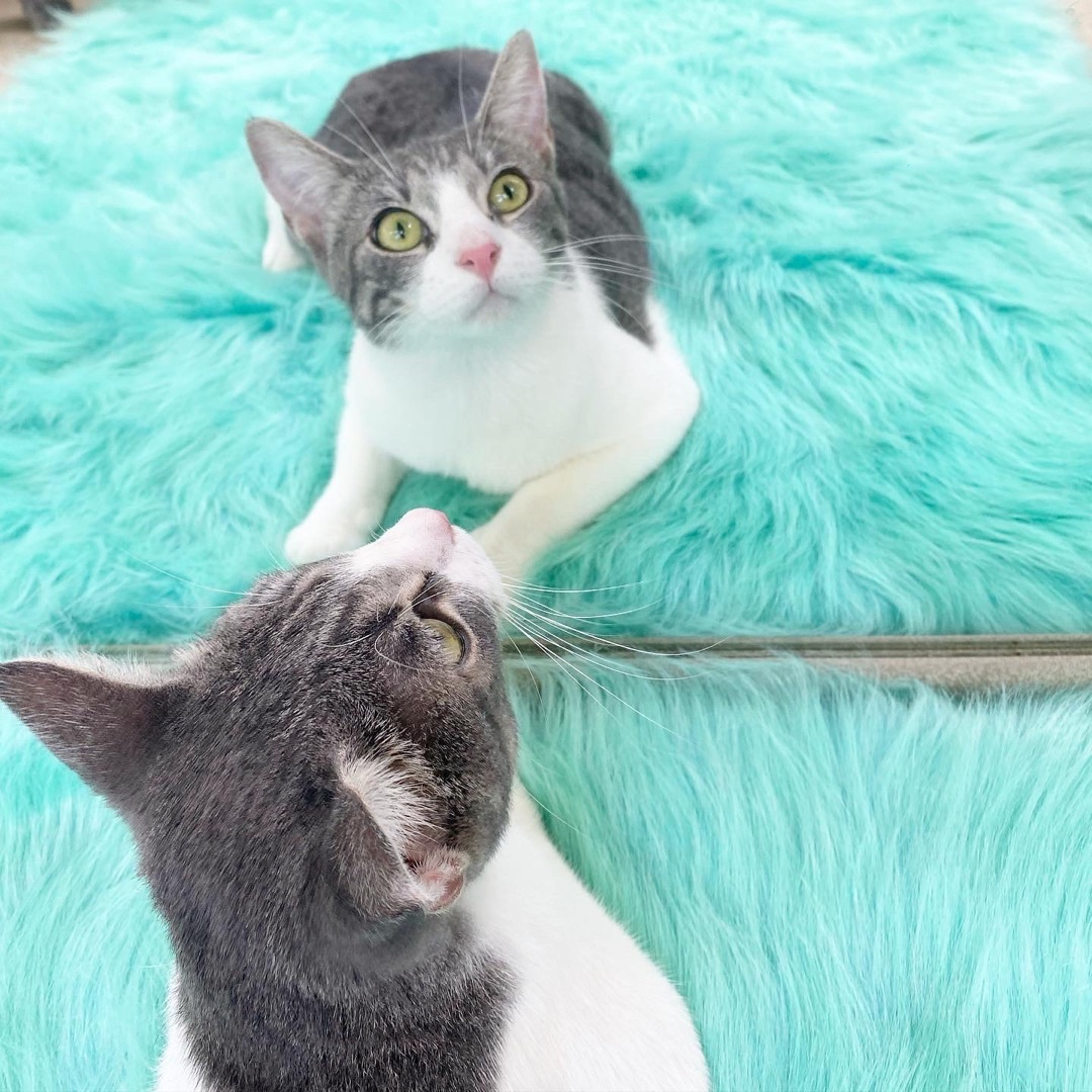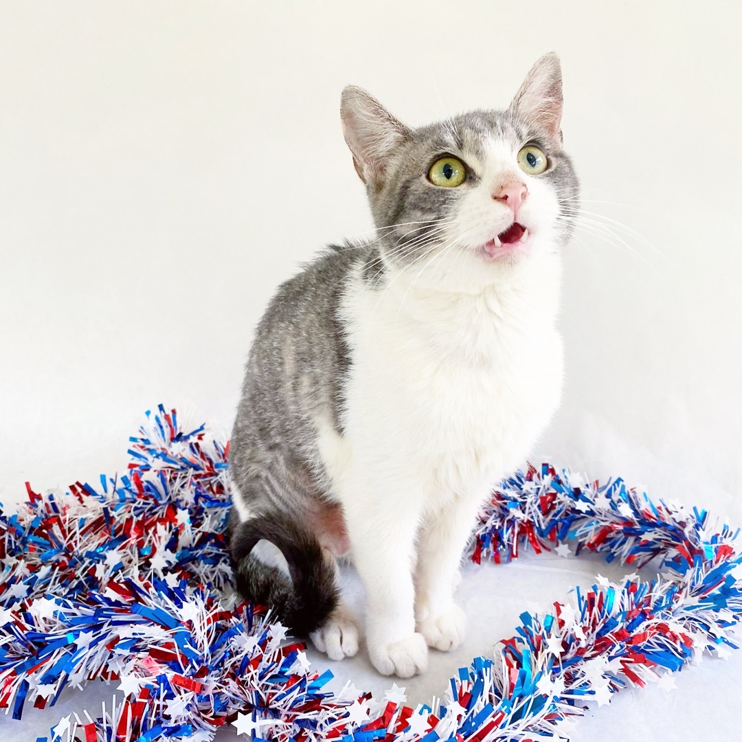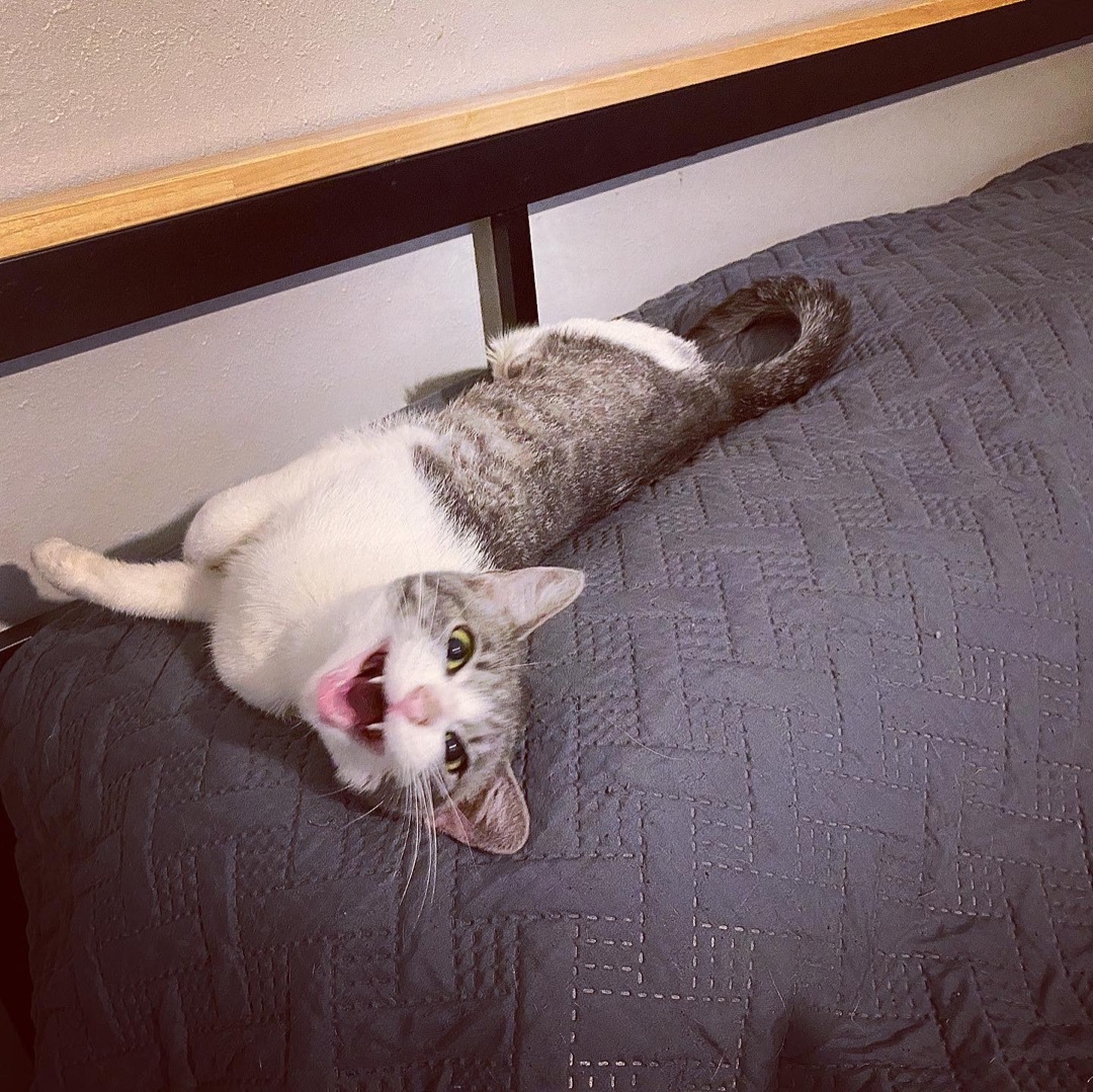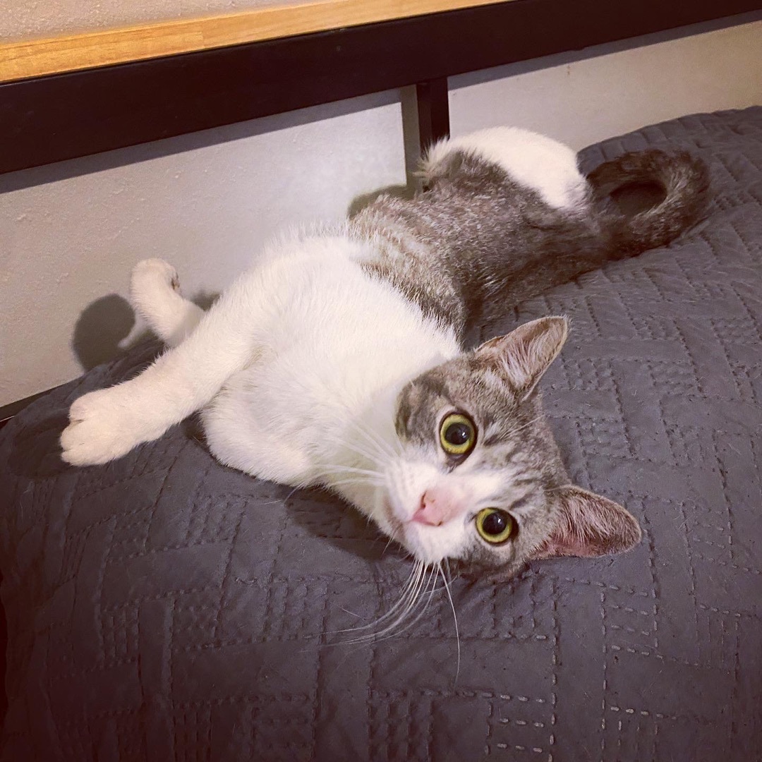 BIRDIE is as sweet as they come. She wants a constant human companion. She’s an excellent snuggler and head warmer. Her favorite place to sleep is on foster mom’s pillow. She purrs constantly. She’s also silly and playful. She doesn’t much like other cats but can tolerate a calm dog. She’s not been around kids but will probably be okay with them.