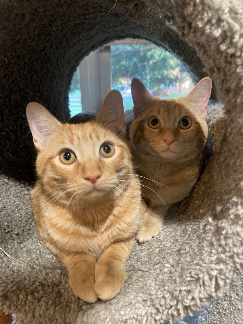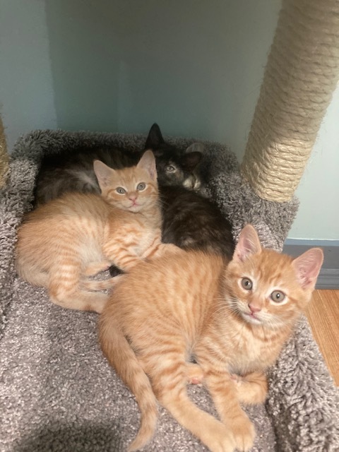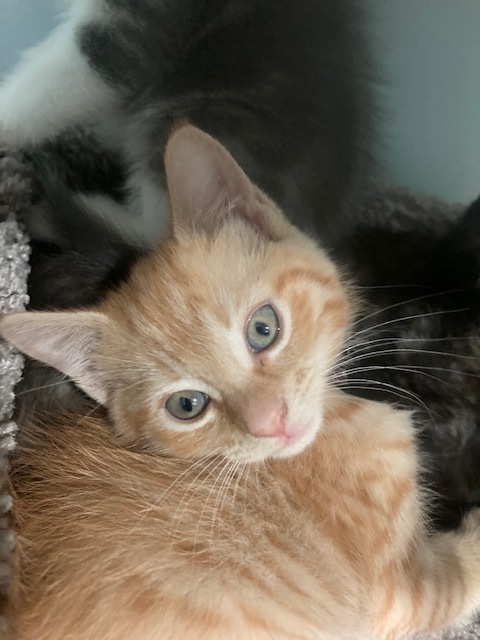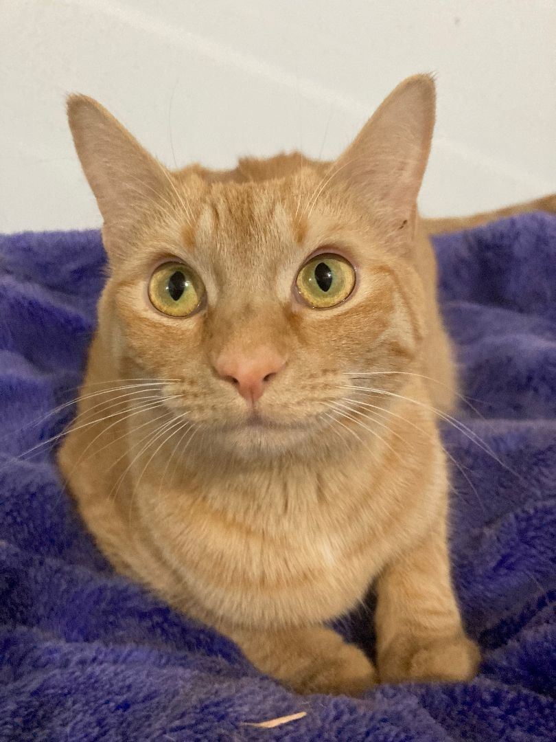 This pale orange tabby girl is one of a litter of 3 born in a closet!She has a darker orange tabby brother, CASEY and a coffee and cream torti sister RENE. Estimated date of birth 5/8/21. She has grown into a gorgeous petite young teenager with stunning lemony eyes.
