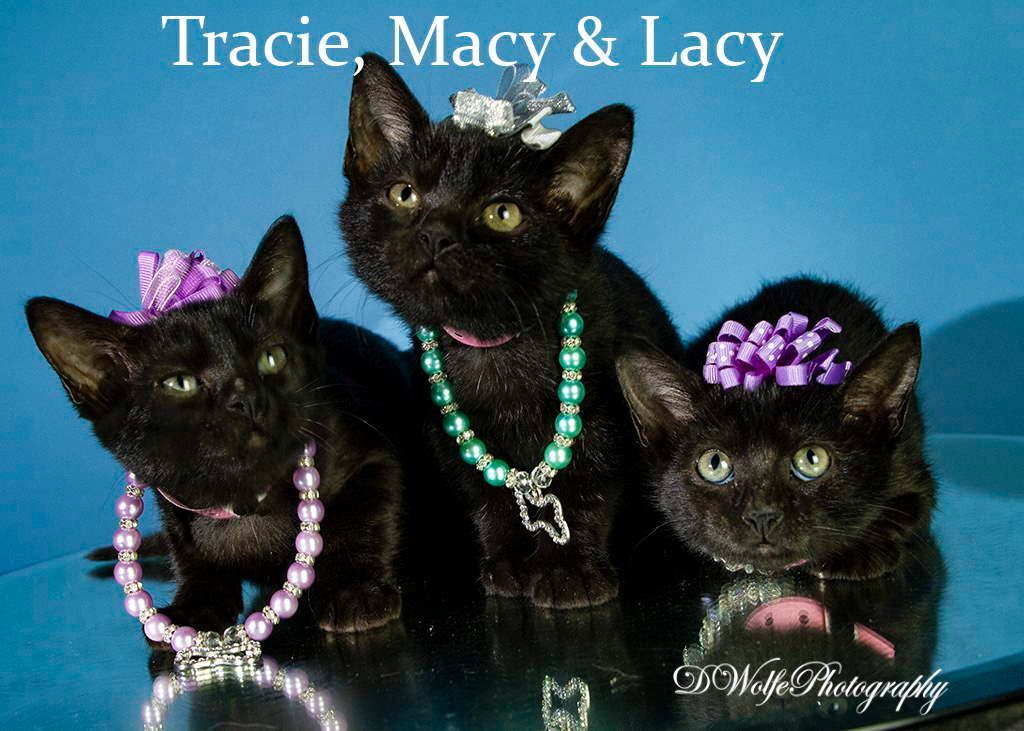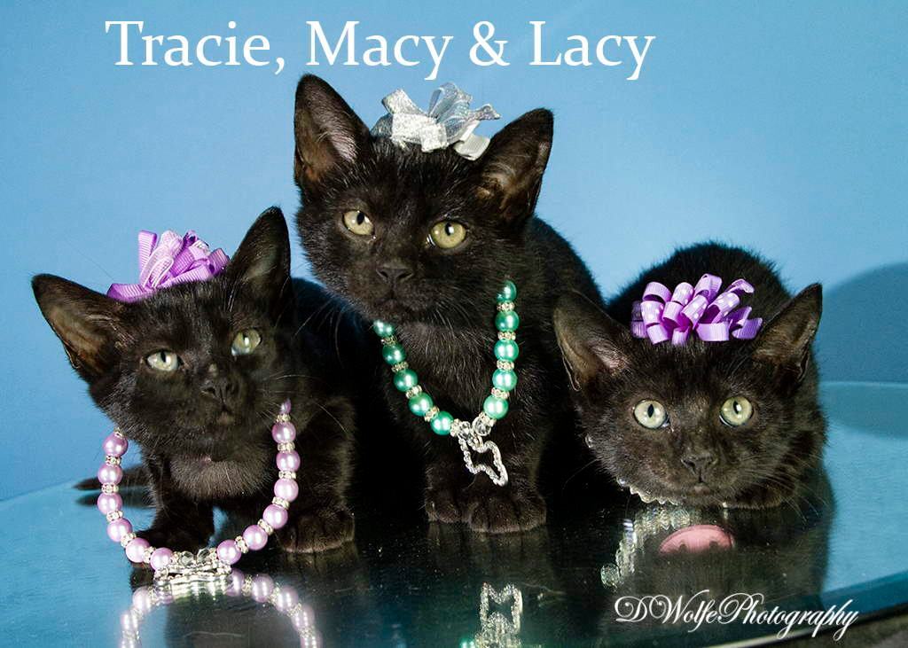 Hi my name is Tracie and when my sister Macy & Lacy were born our mother was not able to care for us so we were taken to this nice lady who bottle fed & cared for us until we were old enough to eat on our own and find forever homes. We are a beautiful black kittens and love to play and snuggle with each other. We will remain with our foster mom until we are adopted. If you have any questions please contact LaMoine at 402-366-0533. If you would like to adopt me and/or my sisters please complete and submit an adoption application at yorkadoptapet.com. Wouldnt you love Triplets?