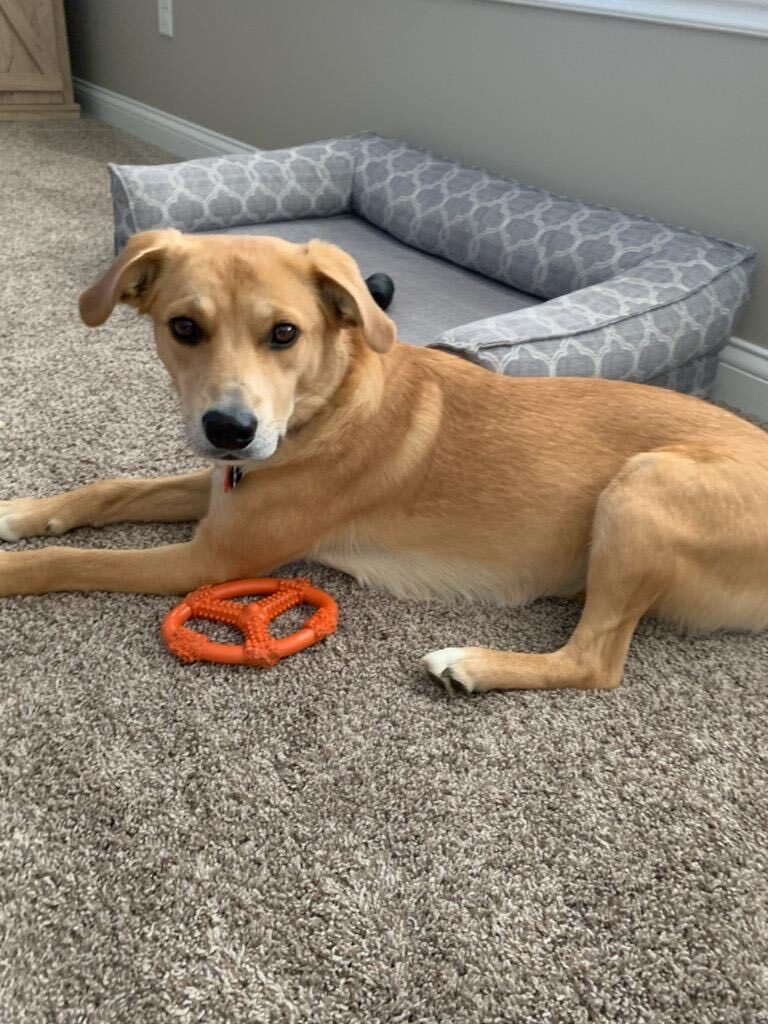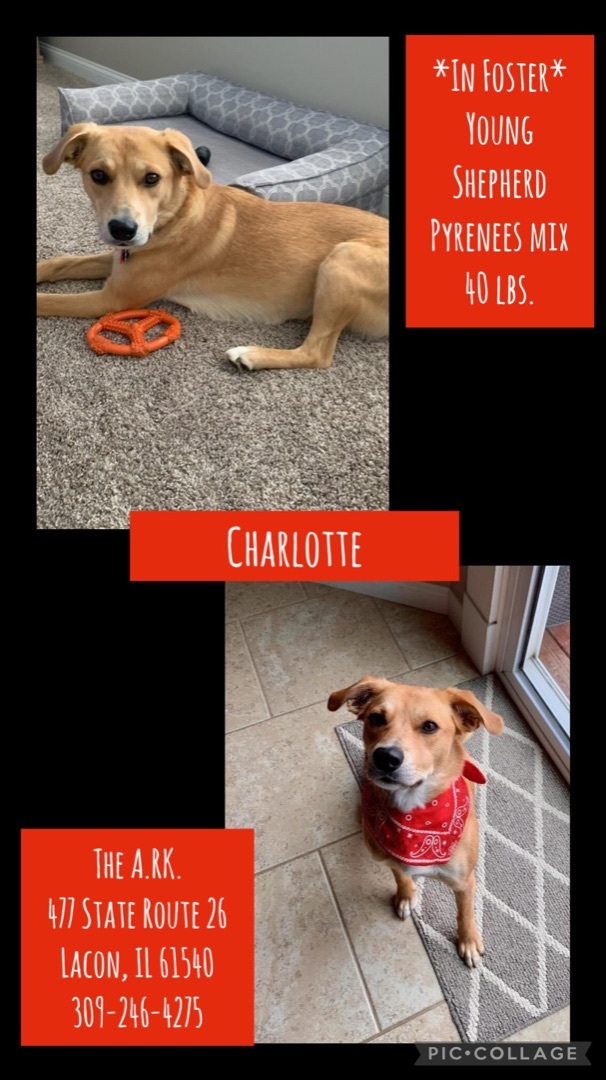 Inquire about additional notes in her file Sweet Charlotte is waiting at the door for her adopter. Is it you? Charlotte is a female, young-adult, medium-size (~37lbs) Great Pyrenees-Terrier-Beagle-Border Collie-German Shephered-supper mutt mix. She’s cuddly and sweet. She loves soft blankets, naps on laps in the recliner, and pretty much every single dog toy in the world. She is vibrant and playful and full of energy. Her favorite toys are stuffed squeaker toys that she can tear apart but also Kongs, puzzle toys, and rope toys. She loves playing in the fenced backyard more than anything. She will throw her toys up in the air and leap around the yard like a deer. She will chase a thrown toy and usually bring it back for more. She loves walks and hikes. She works best with the Gentle leader on walks and hikes. She likes to chase the family cat if he runs, but will play with him too. She’s never injured him. She would do best in a home with older children only as she will lightly nip and herd if the children are running in the yard. She is crate trained. Her accidents are minimal in the house. She sleeps in the kennel for about 8 hours at night. Adoption Application: https://thearkanimalshelter.org/adoption-application/ Download and complete the application. Email to arkanimalshelter@yahoo.com. Questions: 309-246-4275